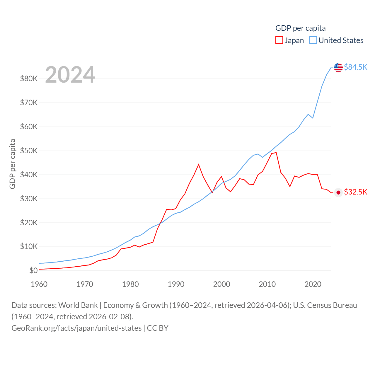 By GDP, Japan ranks 4/197 ($4.03T) and The United States ranks 1/197 ($28.8T). By GDP per capita, Japan ranks 38/197 ($32,487), while The United States ranks 10/197 ($84,534).