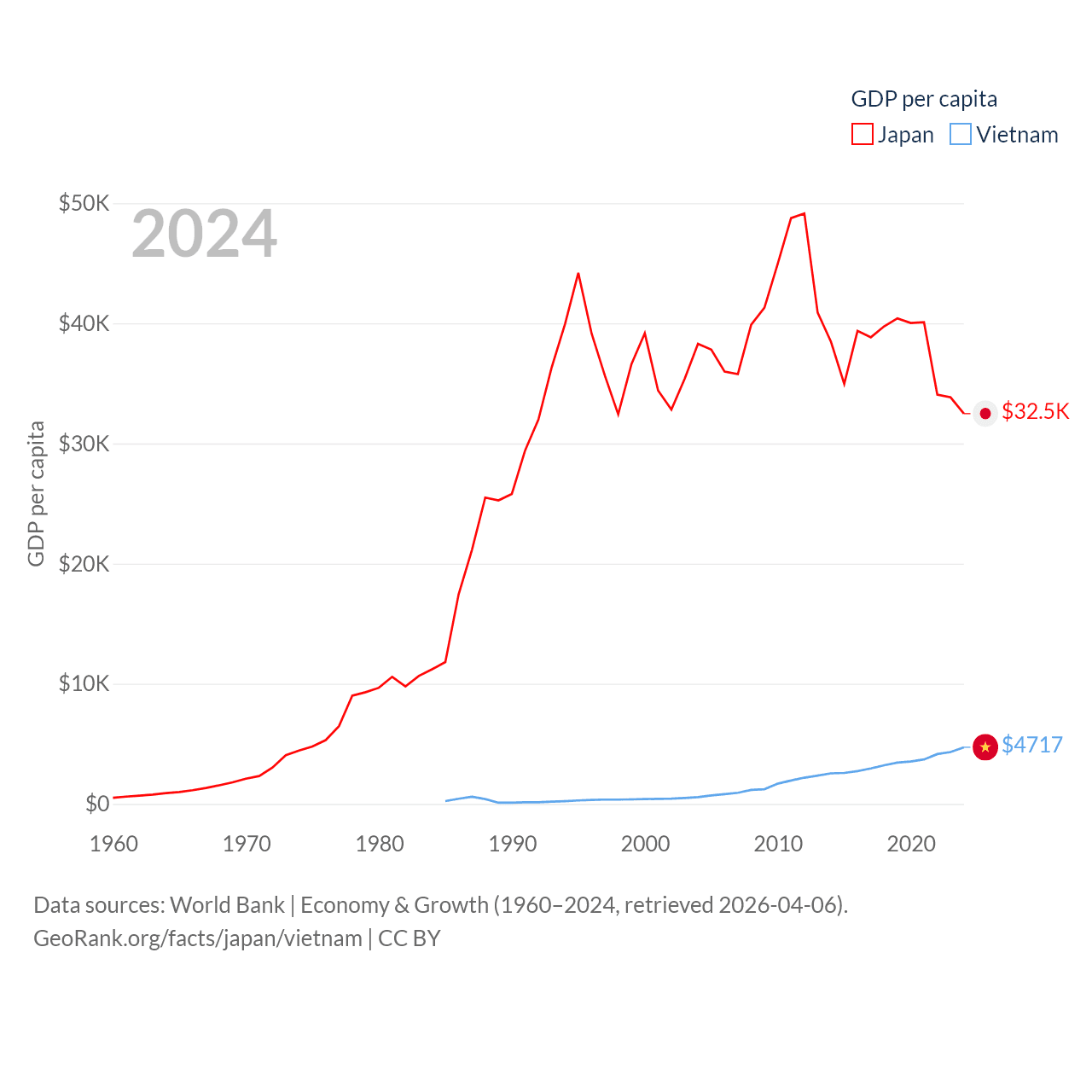 By GDP, Japan ranks 4/197 ($4.03T) and Vietnam ranks 33/197 ($476B). By GDP per capita, Japan ranks 38/197 ($32,487), while Vietnam ranks 122/197 ($4,717).
