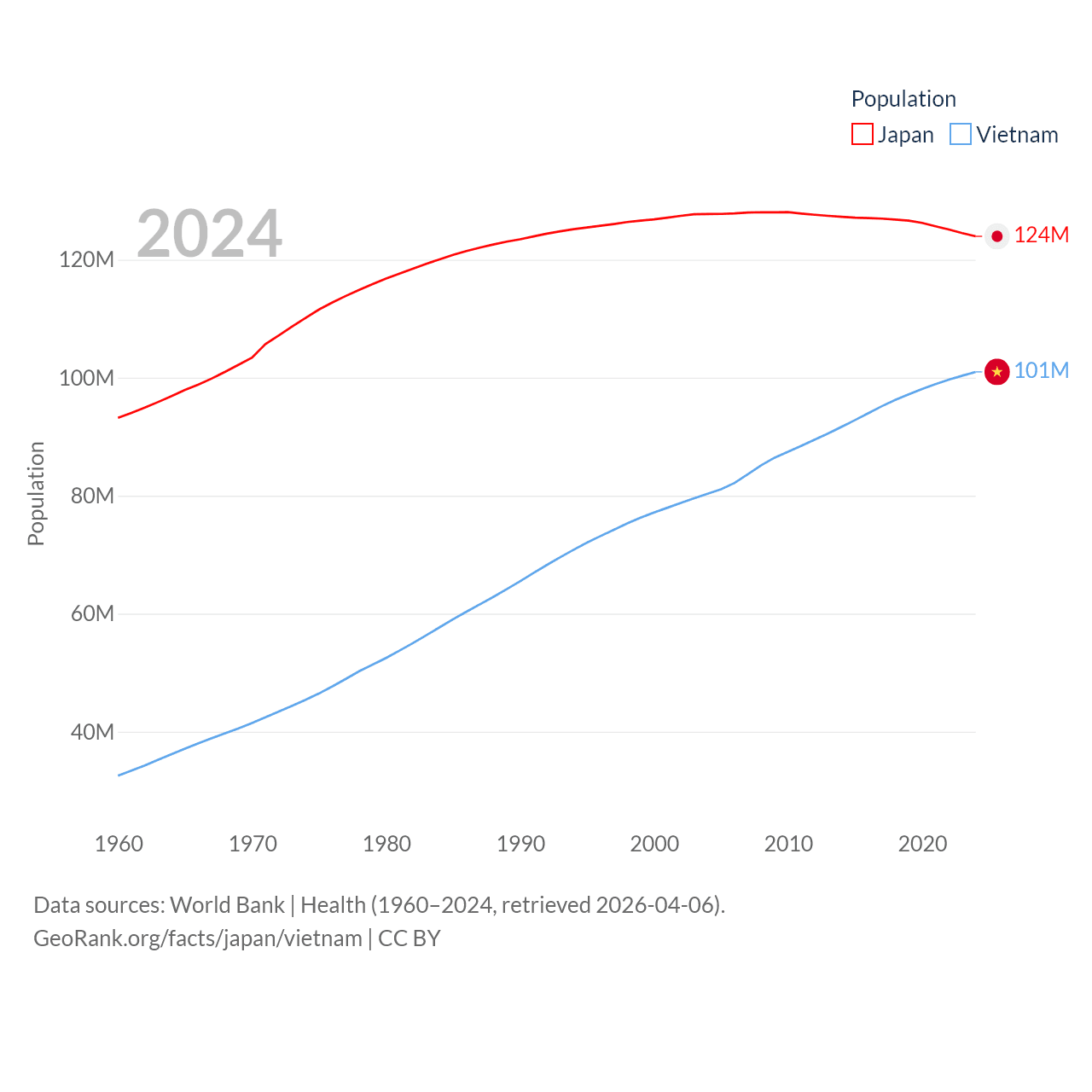 Japan has a population of 124M (ranked 12/197), compared with 101M in Vietnam (ranked 16/197). Japan's land area is 140,761 sq mi versus 121,016 sq mi for Vietnam (ranked 61st vs. 67th).
