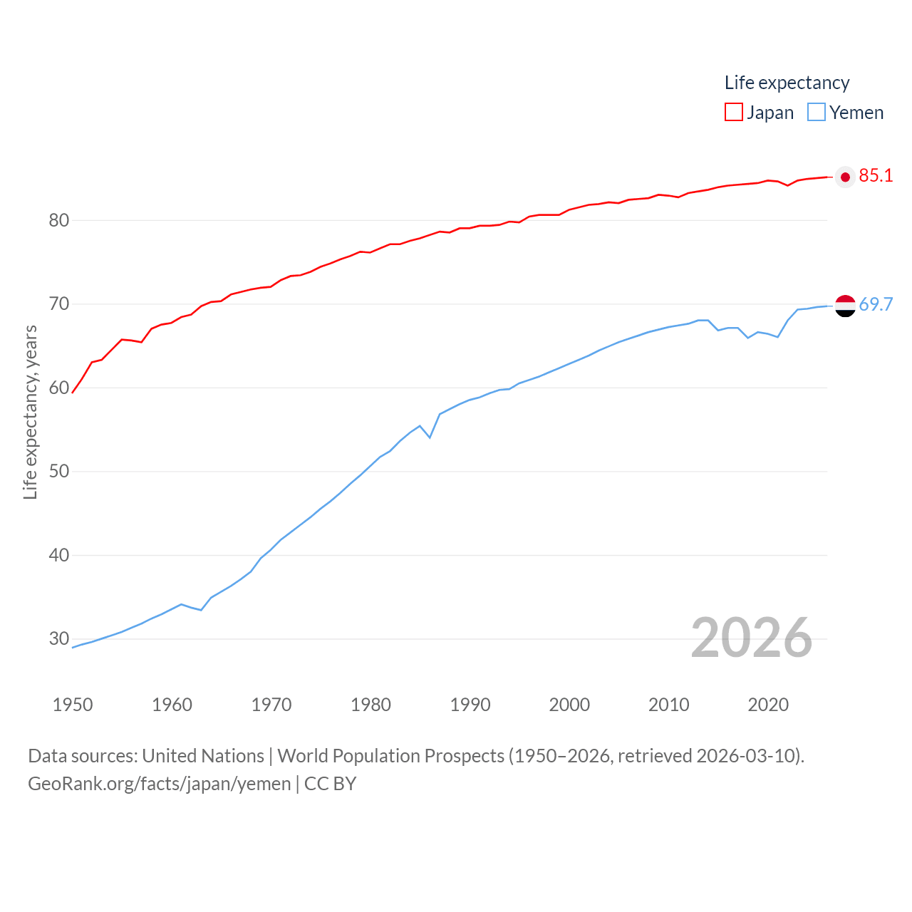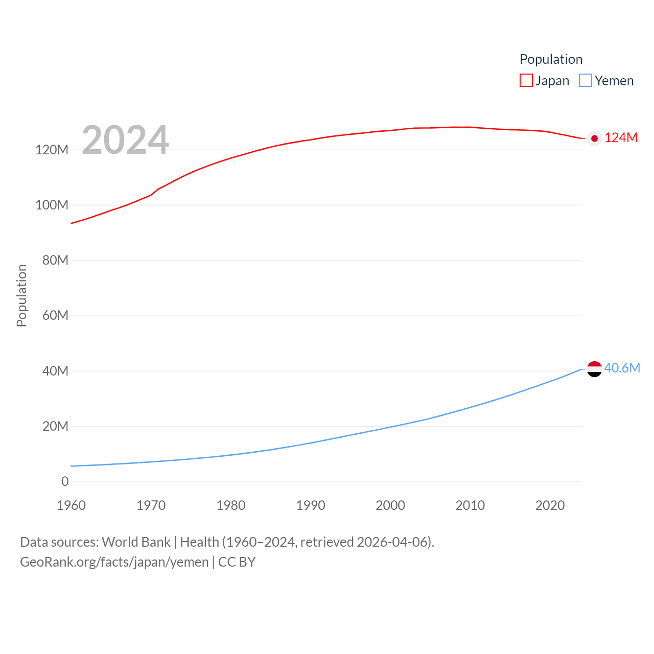 Japan has a population of 124M (ranked 12/197), compared with 40.6M in Yemen (ranked 38/197). Japan's land area is 140,761 sq mi versus 203,850 sq mi for Yemen (ranked 61st vs. 49th).