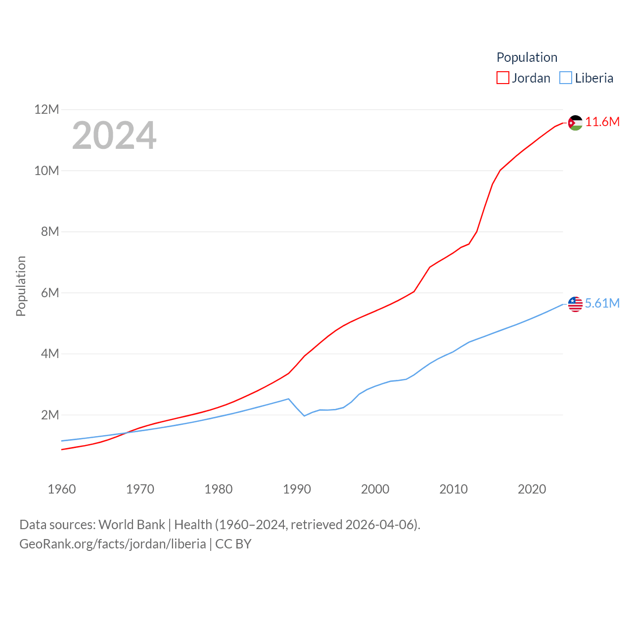 Jordan has a population of 11.6M (ranked 84/197), compared with 5.61M in Liberia (ranked 117/197). Jordan's land area is 34,284 sq mi versus 37,189 sq mi for Liberia (ranked 110th vs. 106th).