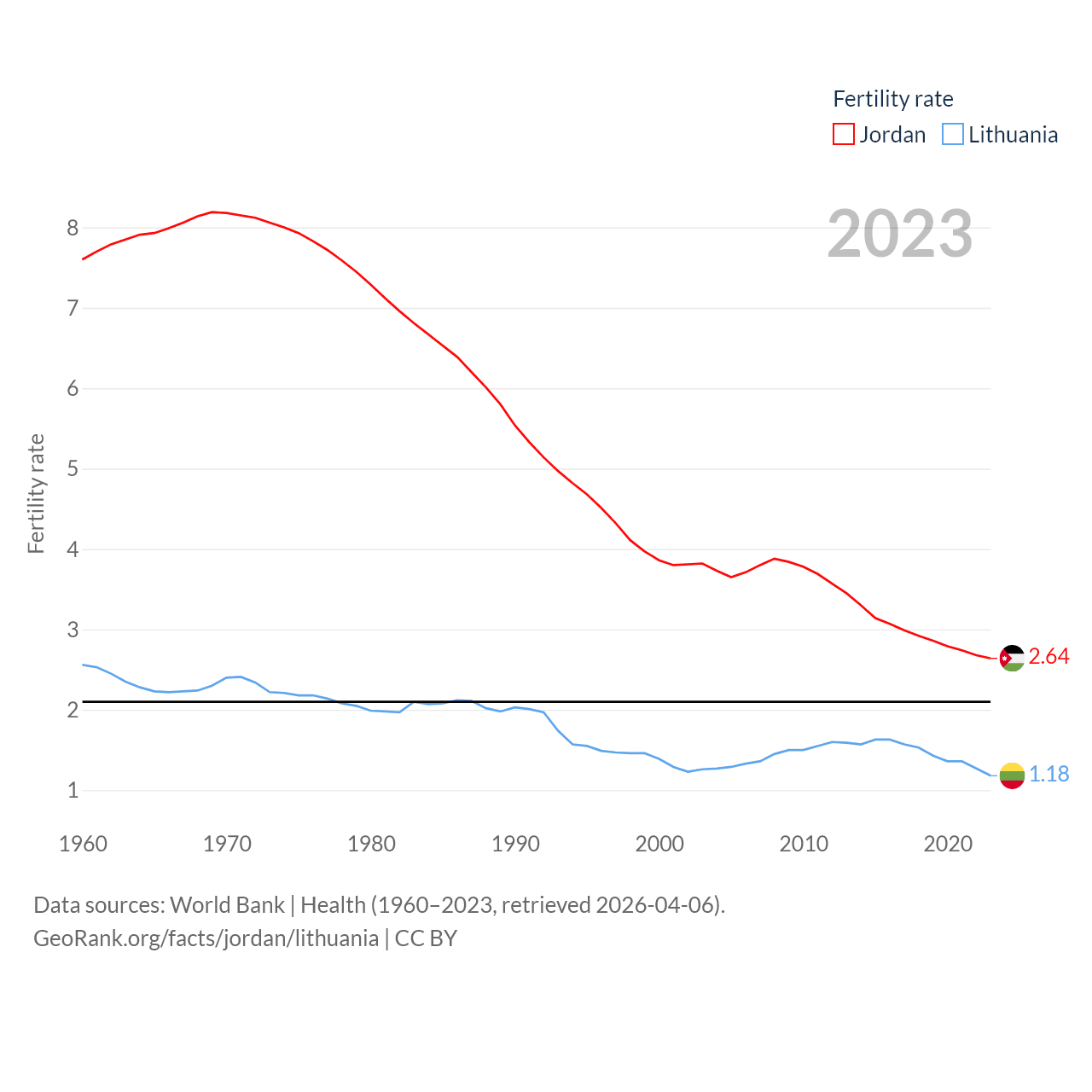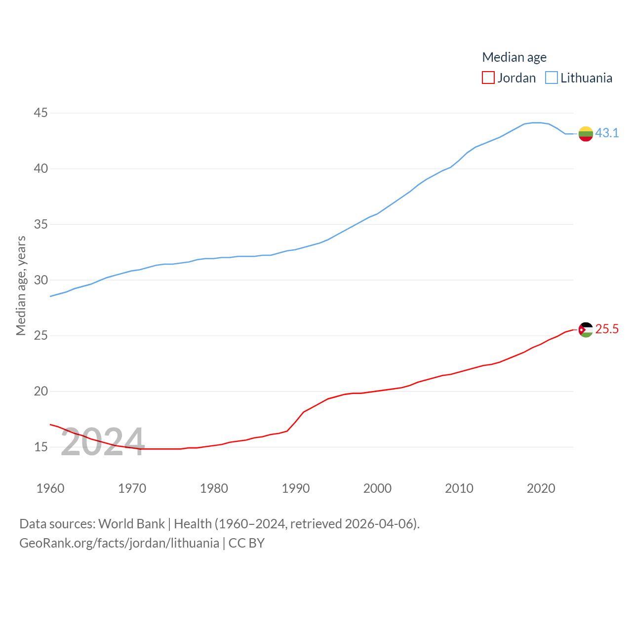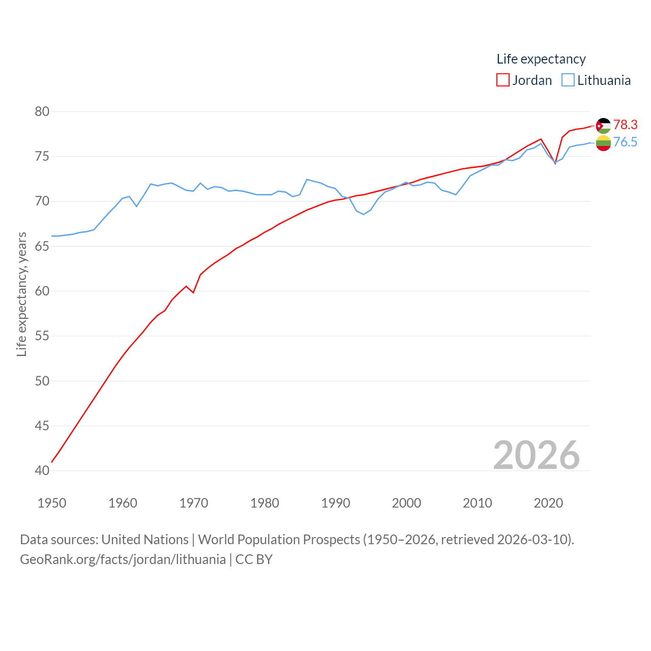 Jordan has a population of 11.6M (ranked 84/197), compared with 2.89M in Lithuania (ranked 137/197). Jordan's land area is 34,284 sq mi versus 24,170 sq mi for Lithuania (ranked 110th vs. 120th).
