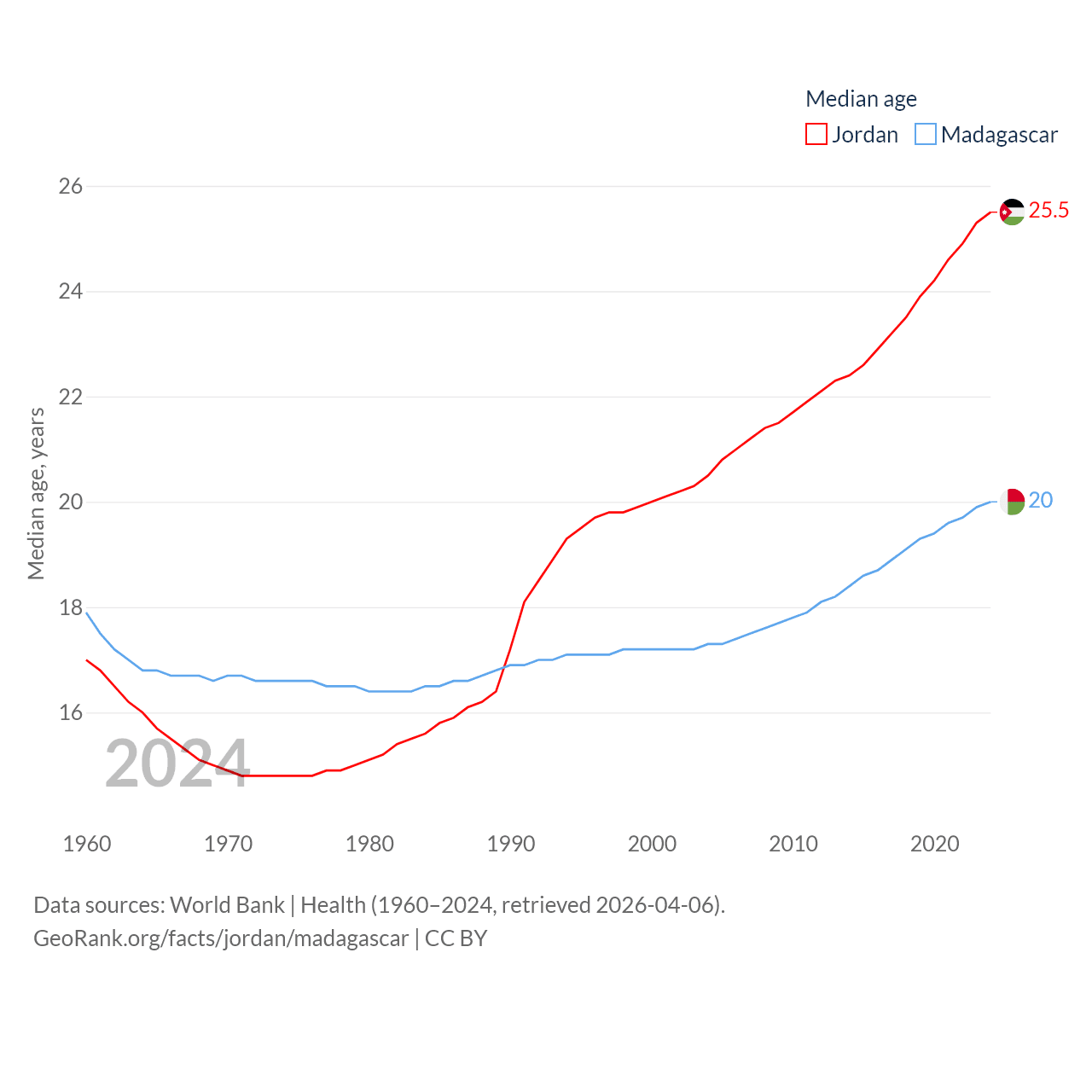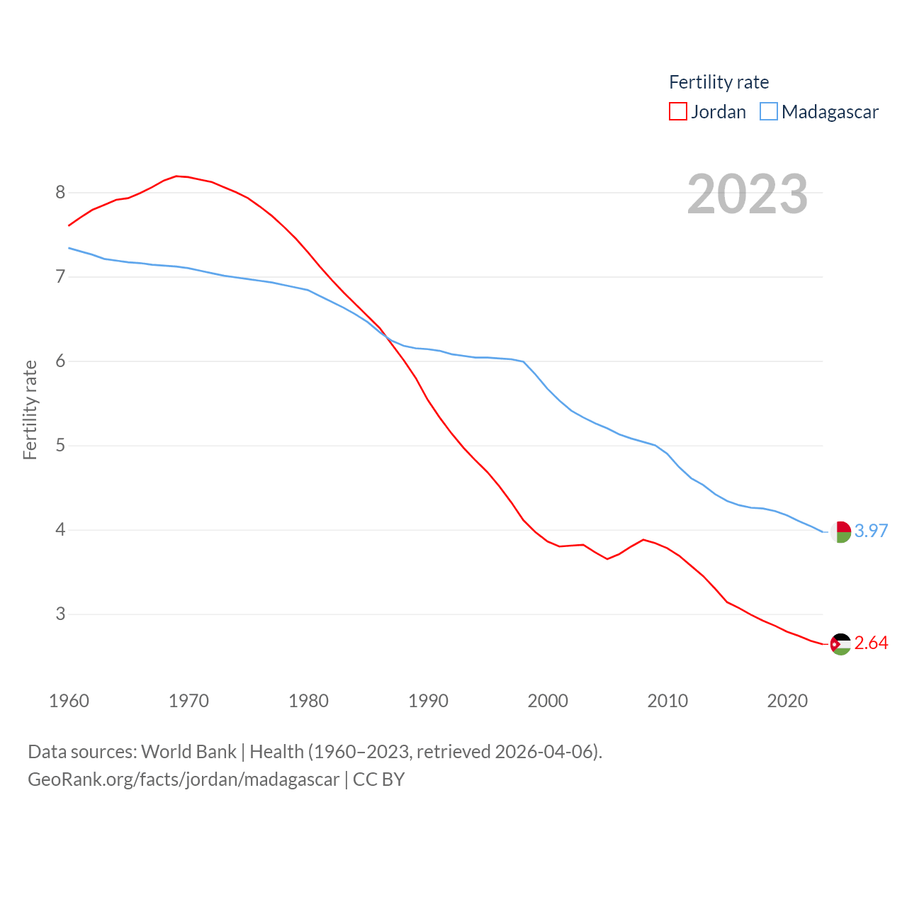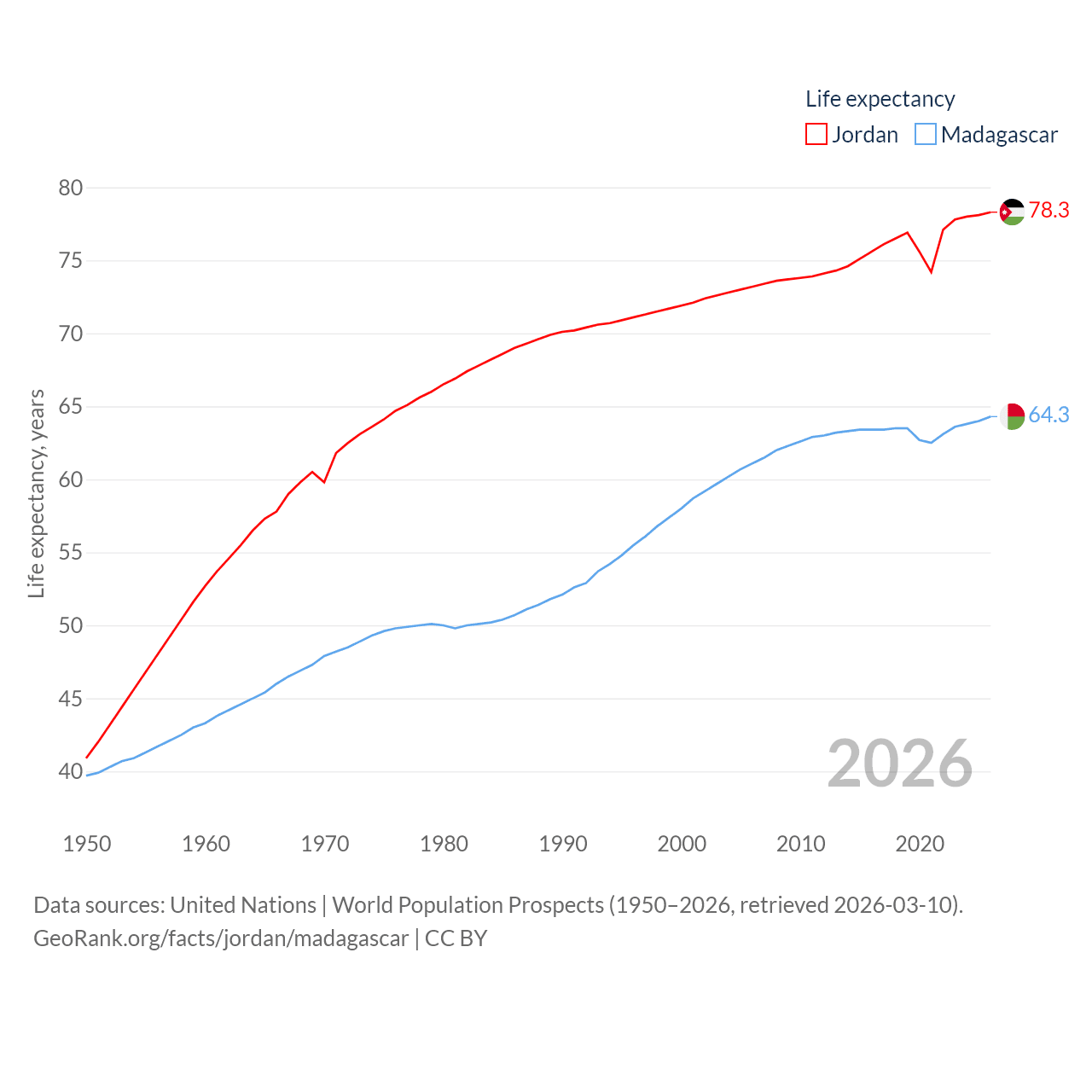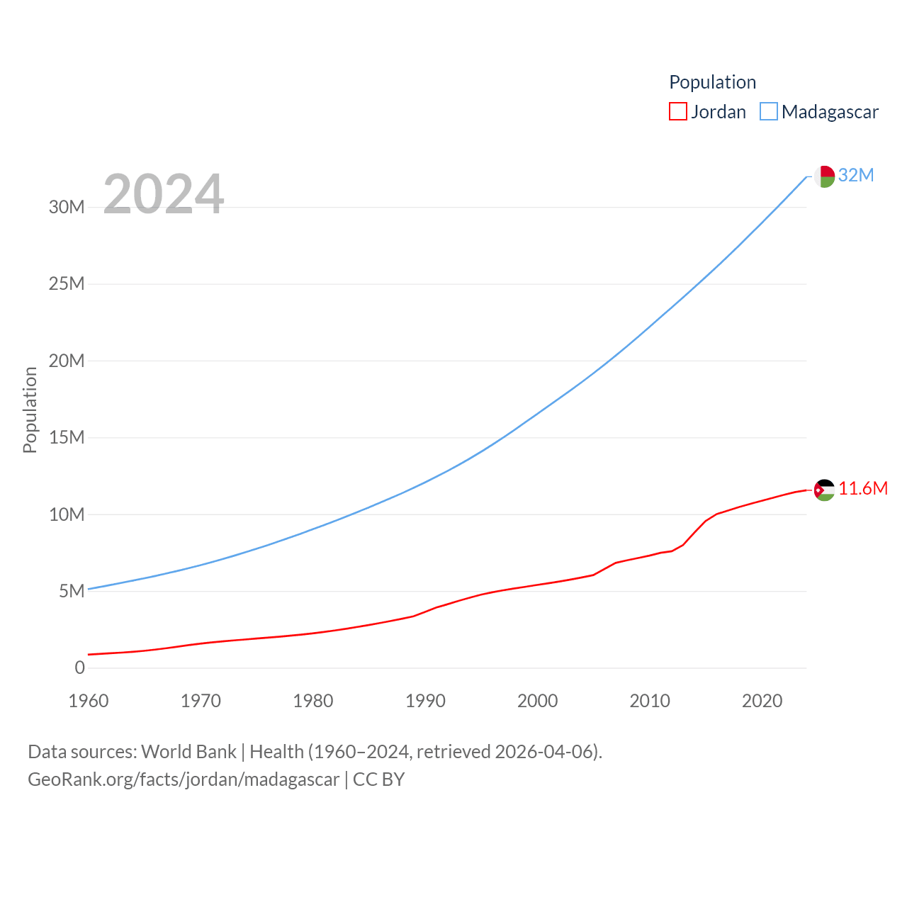 Jordan has a population of 11.6M (ranked 84/197), compared with 32M in Madagascar (ranked 49/197). Jordan's land area is 34,284 sq mi versus 224,634 sq mi for Madagascar (ranked 110th vs. 44th).