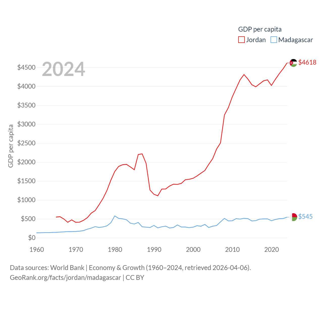 By GDP, Jordan ranks 90/197 ($53.4B) and Madagascar ranks 136/197 ($17.4B). By GDP per capita, Jordan ranks 123/197 ($4,618), while Madagascar ranks 193/197 ($545).