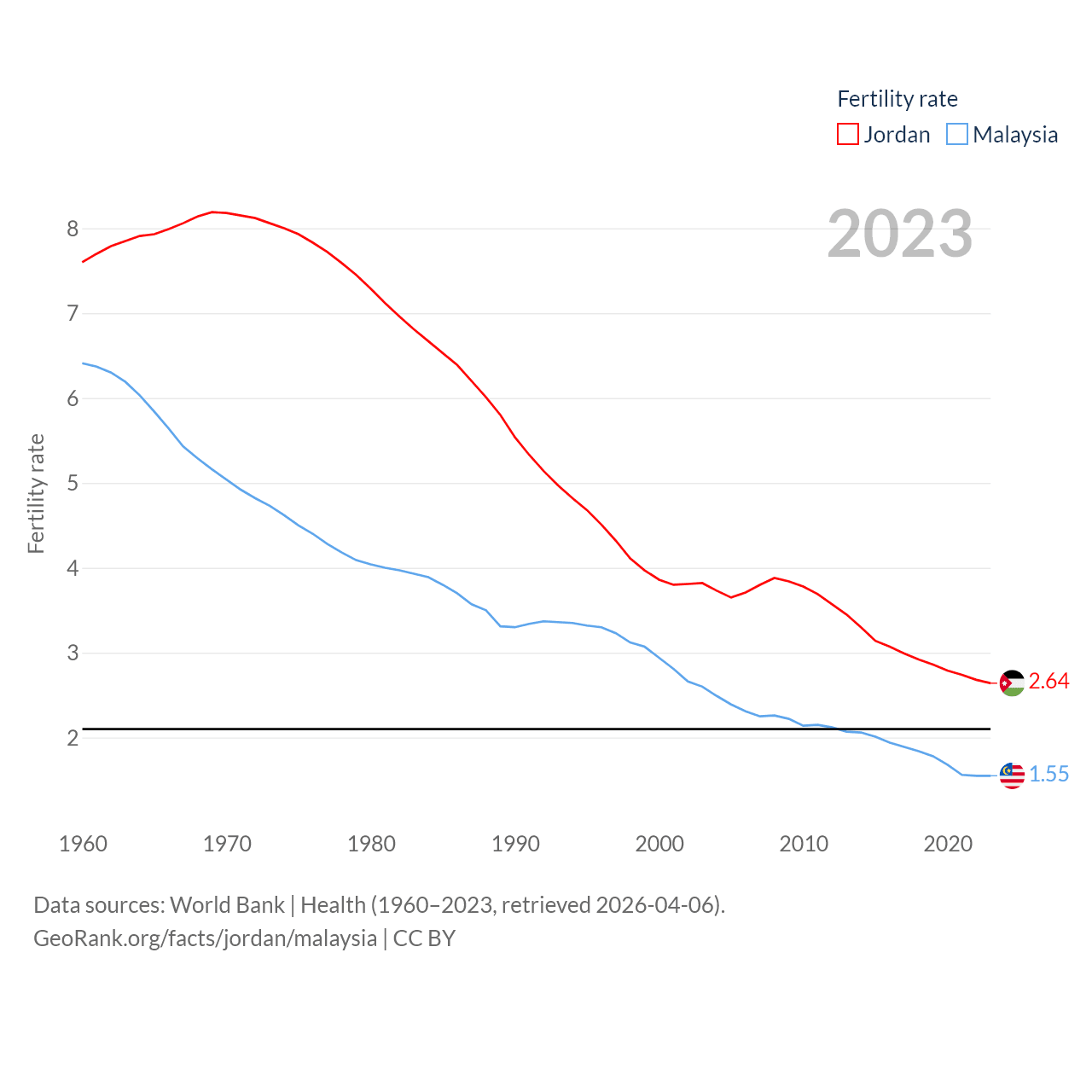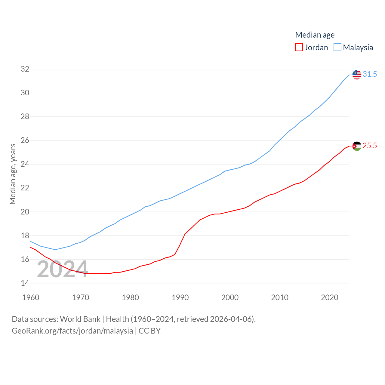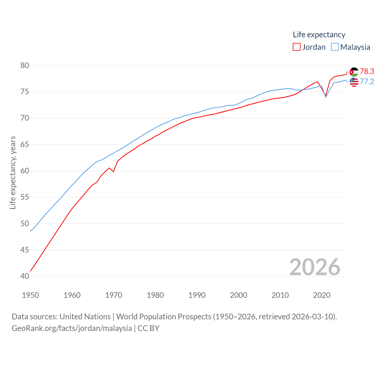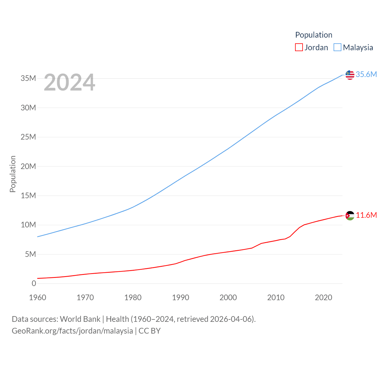 Jordan has a population of 11.6M (ranked 84/197), compared with 35.6M in Malaysia (ranked 44/197). Jordan's land area is 34,284 sq mi versus 126,854 sq mi for Malaysia (ranked 110th vs. 65th).