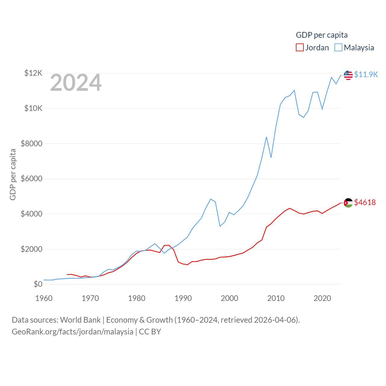 By GDP, Jordan ranks 90/197 ($53.4B) and Malaysia ranks 38/197 ($422B). By GDP per capita, Jordan ranks 123/197 ($4,618), while Malaysia ranks 79/197 ($11,874).