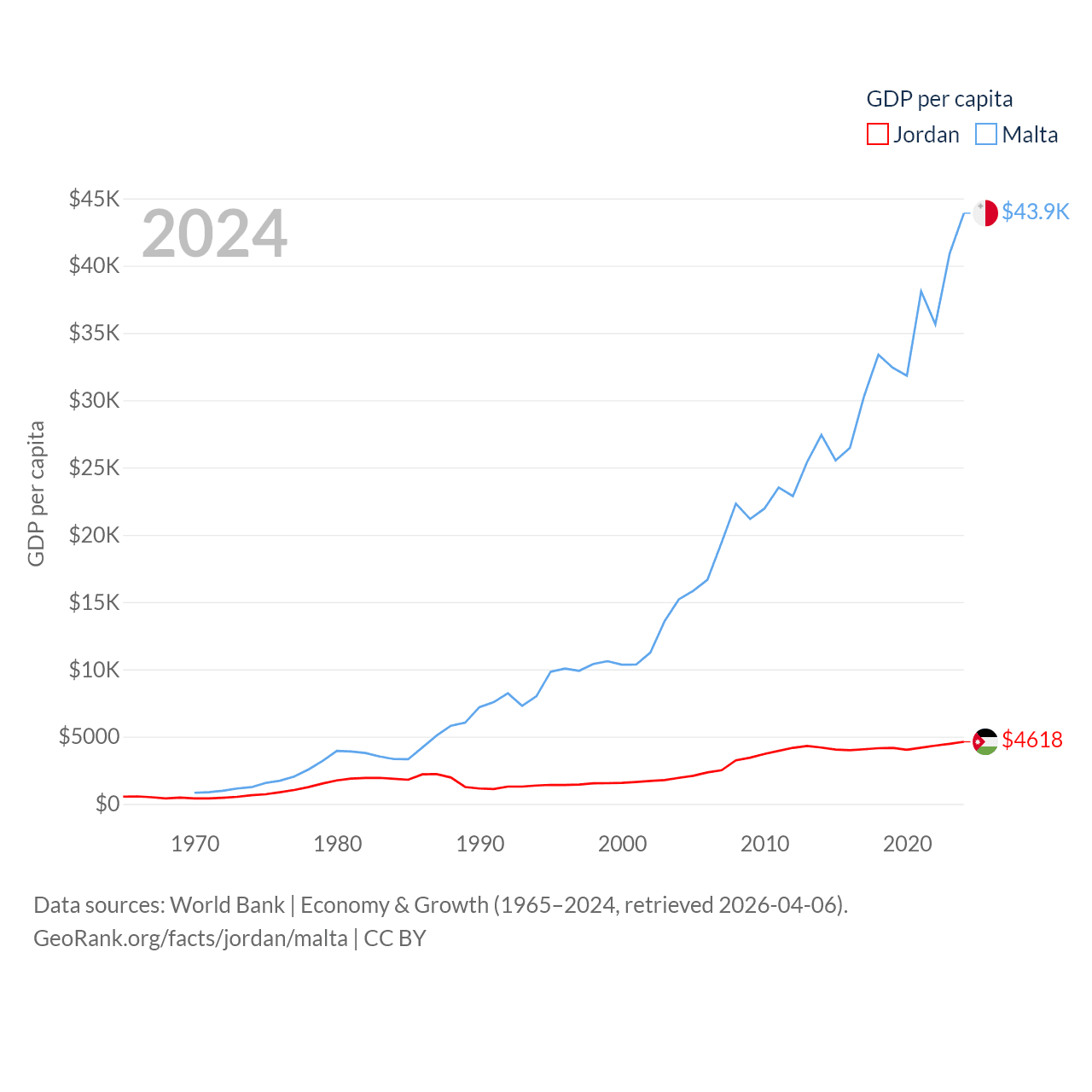 By GDP, Jordan ranks 90/197 ($53.4B) and Malta ranks 119/197 ($25B). By GDP per capita, Jordan ranks 123/197 ($4,618), while Malta ranks 28/197 ($43,899).
