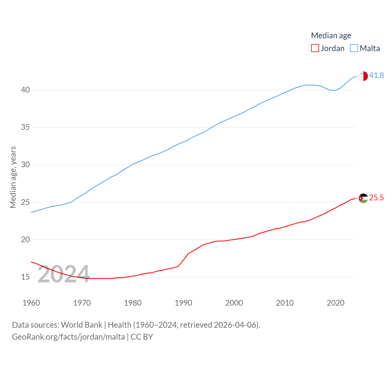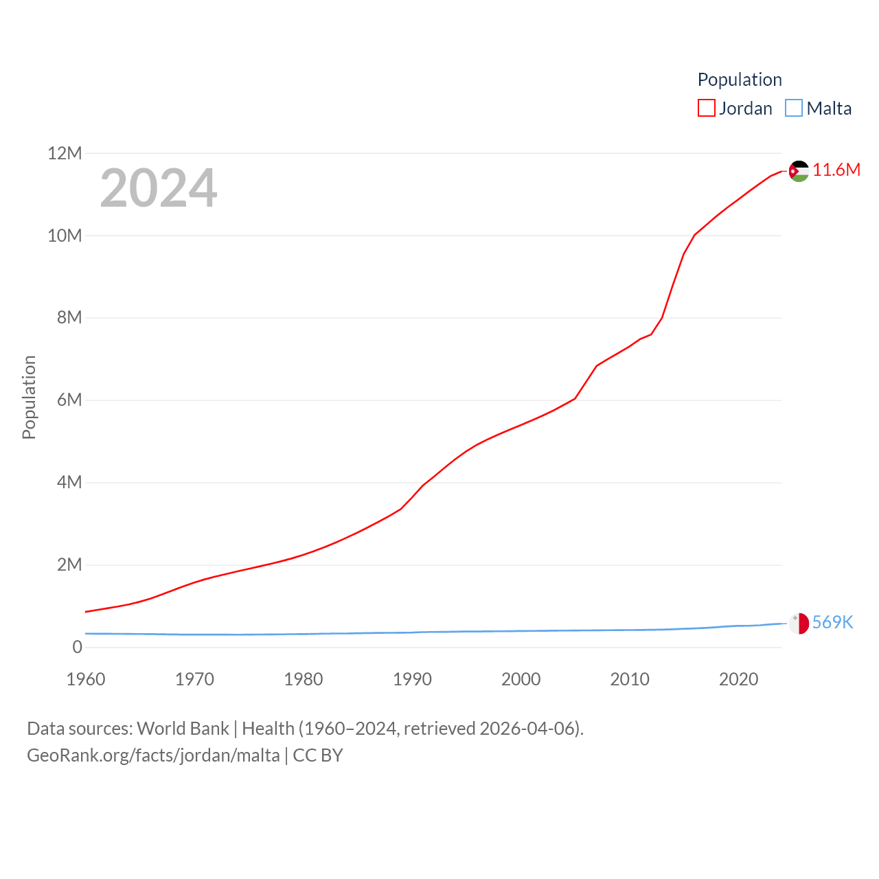 Jordan has a population of 11.6M (ranked 84/197), compared with 569K in Malta (ranked 167/197). Jordan's land area is 34,284 sq mi versus 123.6 sq mi for Malta (ranked 110th vs. 187th).