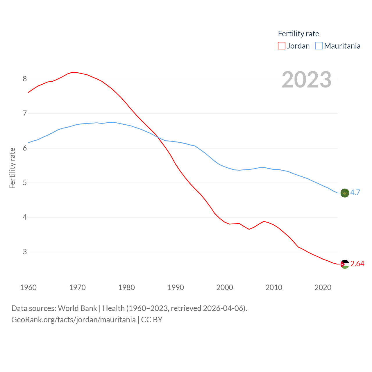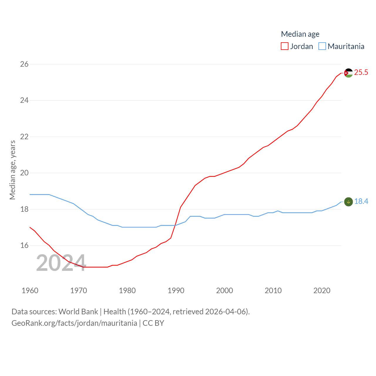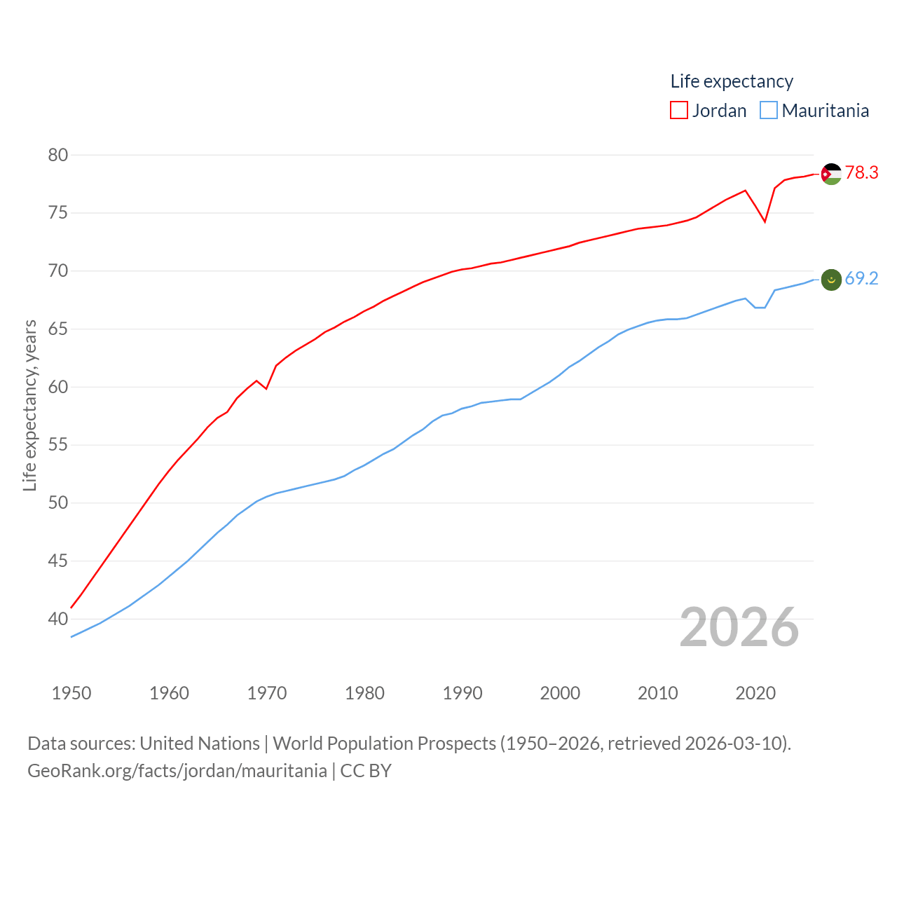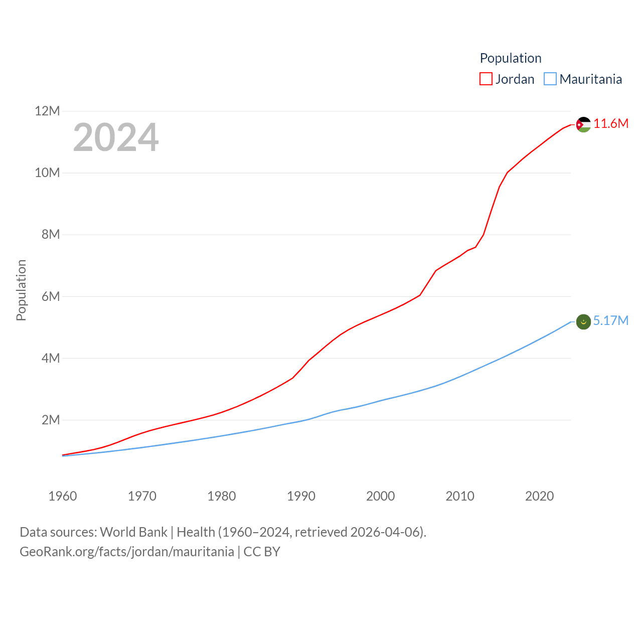 Jordan has a population of 11.6M (ranked 84/197), compared with 5.17M in Mauritania (ranked 125/197). Jordan's land area is 34,284 sq mi versus 397,955 sq mi for Mauritania (ranked 110th vs. 28th).