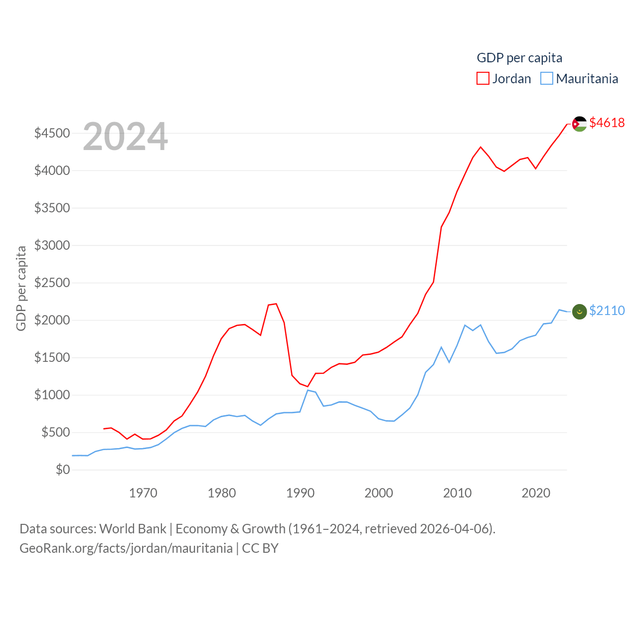 By GDP, Jordan ranks 90/197 ($53.4B) and Mauritania ranks 153/197 ($10.9B). By GDP per capita, Jordan ranks 123/197 ($4,618), while Mauritania ranks 156/197 ($2,110).