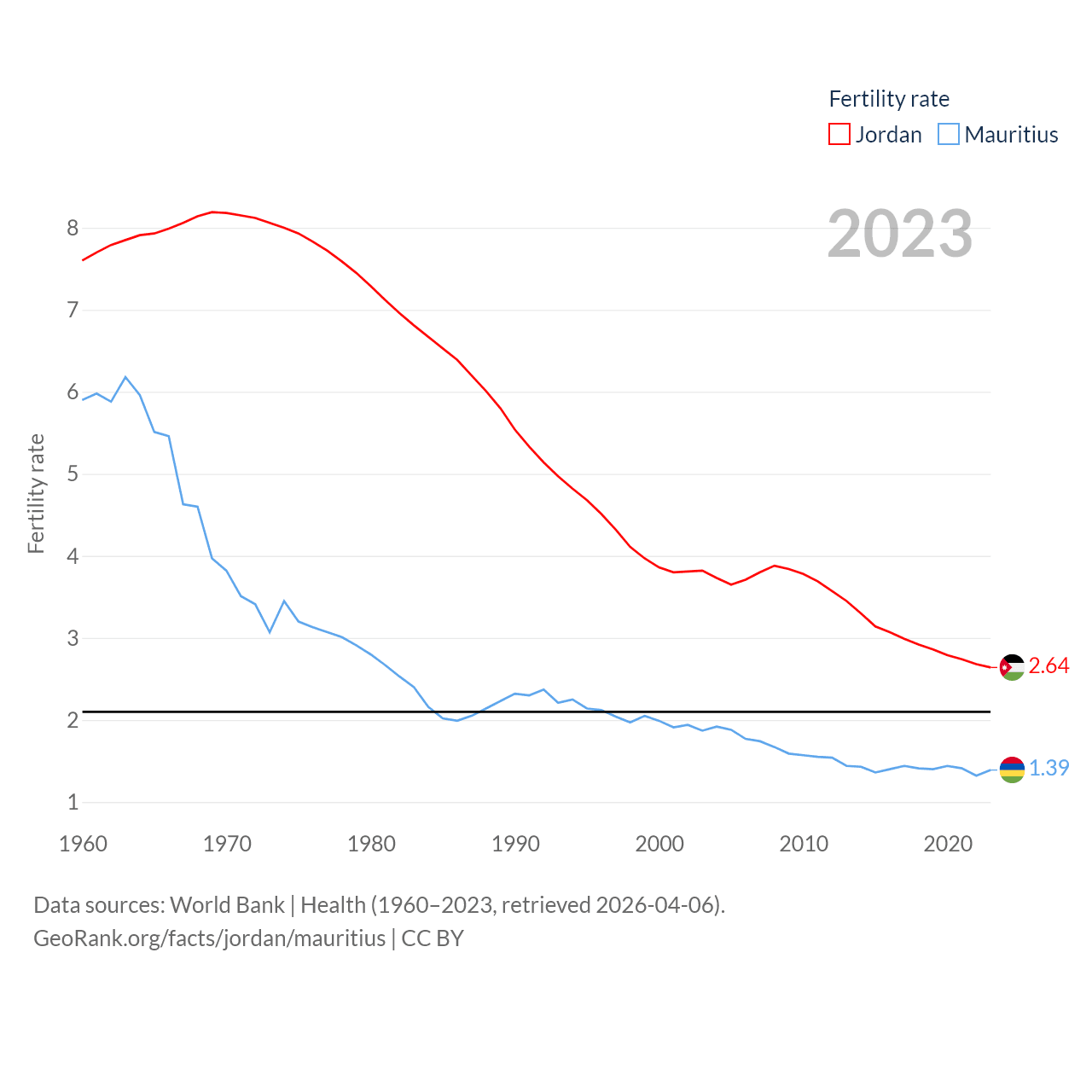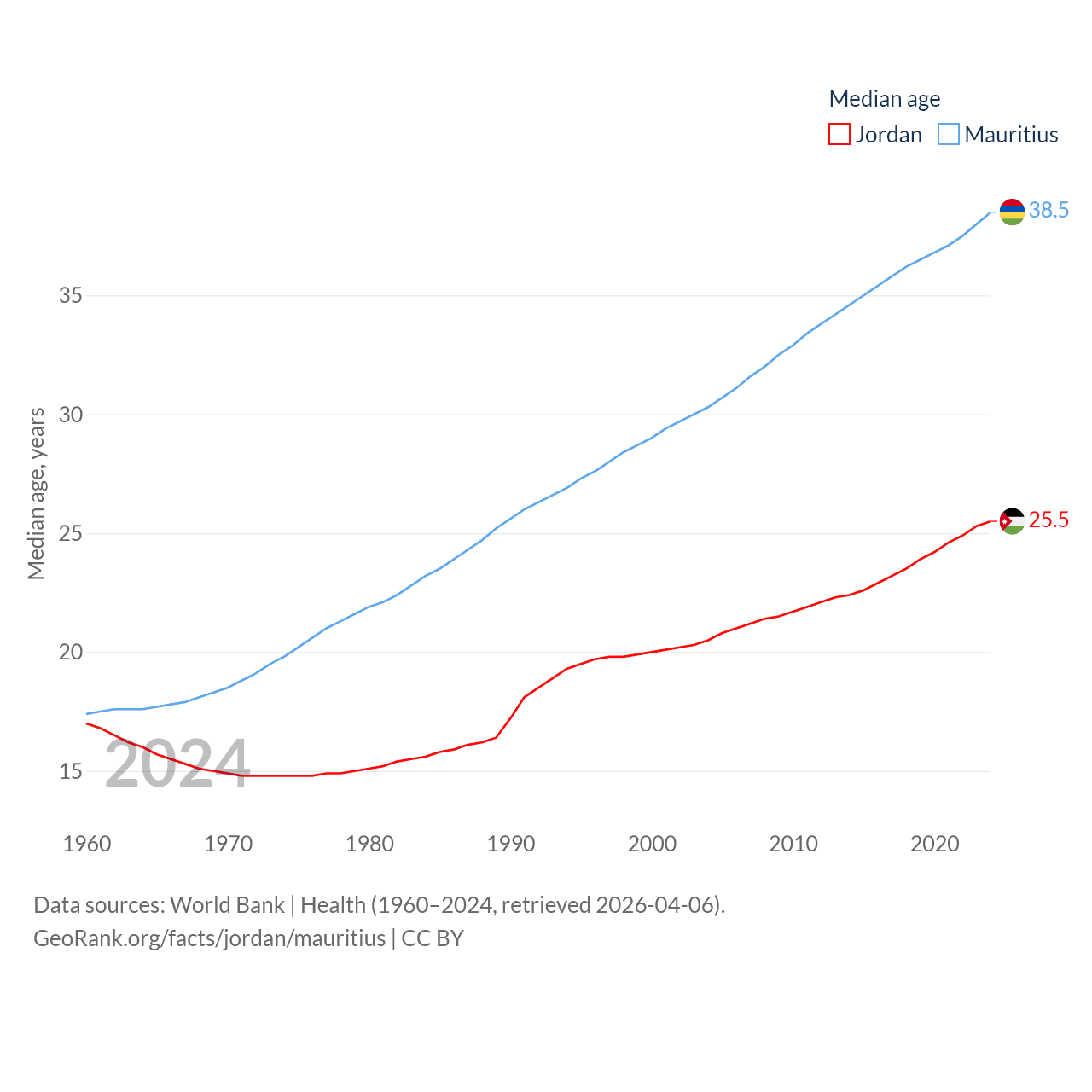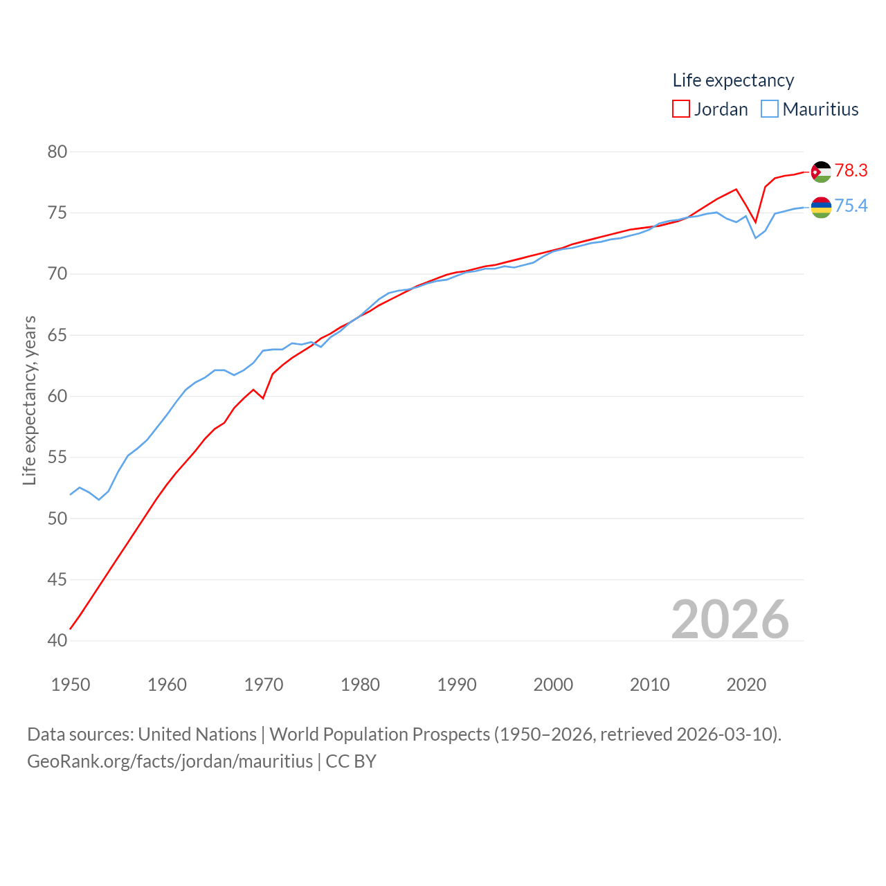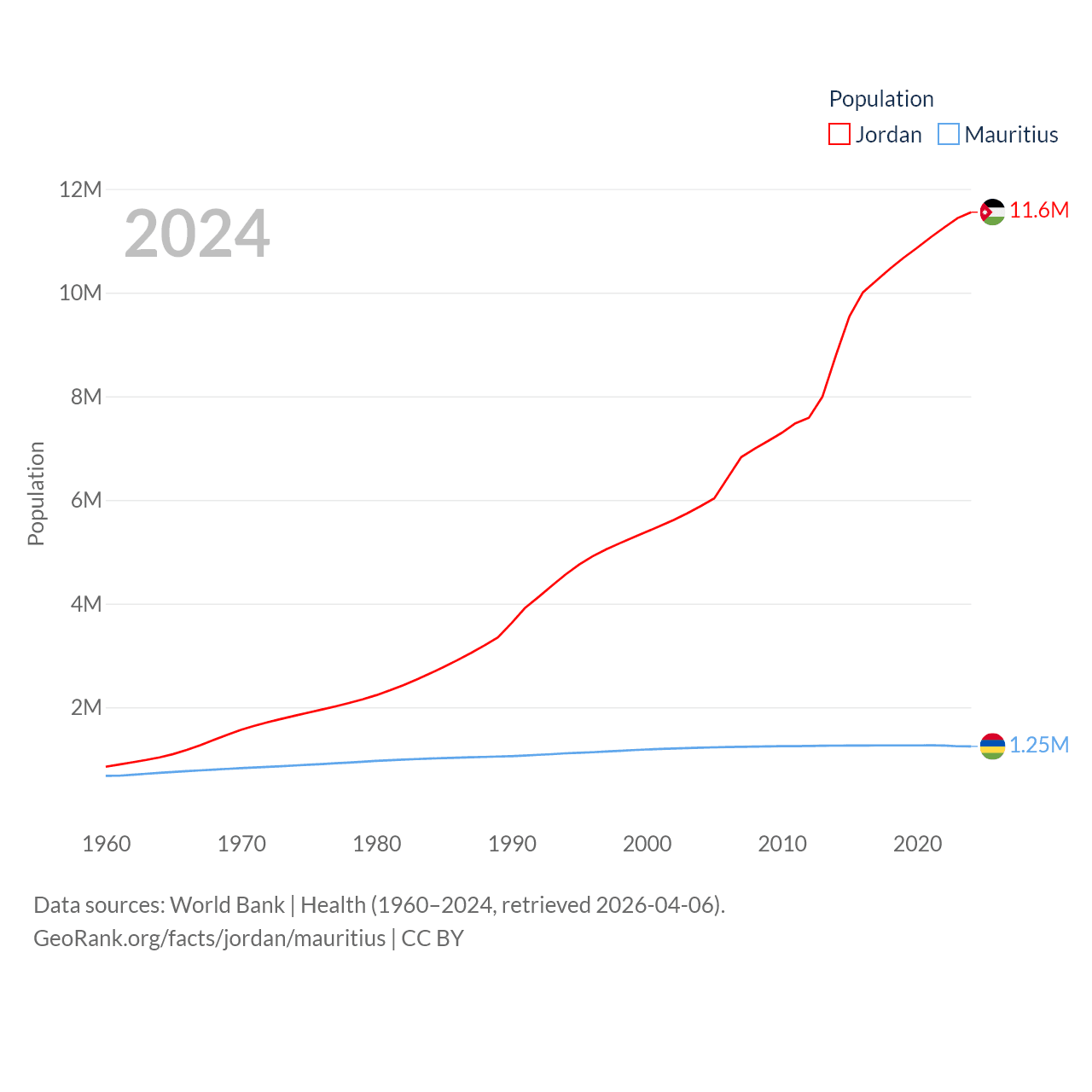 Jordan has a population of 11.6M (ranked 84/197), compared with 1.25M in Mauritius (ranked 156/197). Jordan's land area is 34,284 sq mi versus 771 sq mi for Mauritius (ranked 110th vs. 170th).