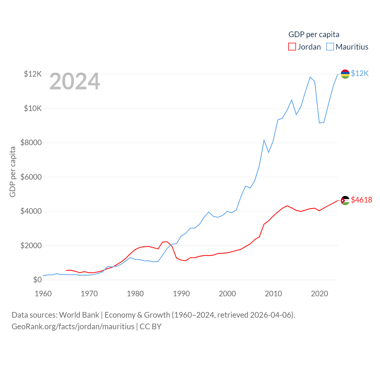 By GDP, Jordan ranks 90/197 ($53.4B) and Mauritius ranks 143/197 ($14.9B). By GDP per capita, Jordan ranks 123/197 ($4,618), while Mauritius ranks 78/197 ($11,991).