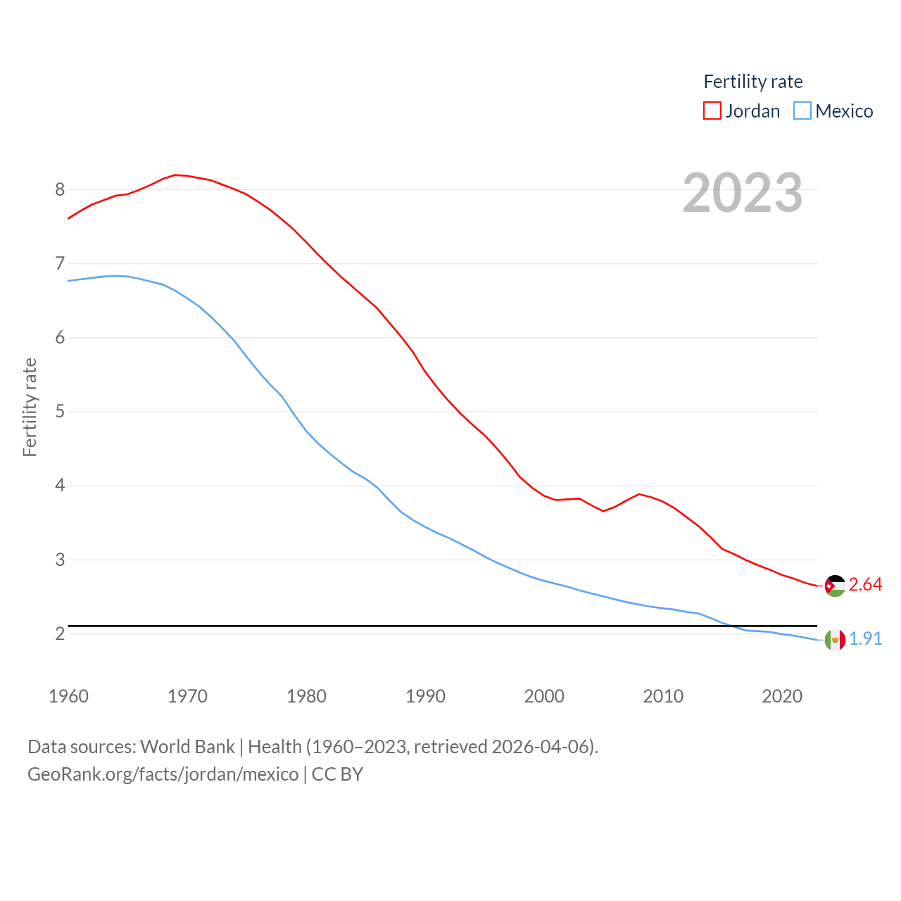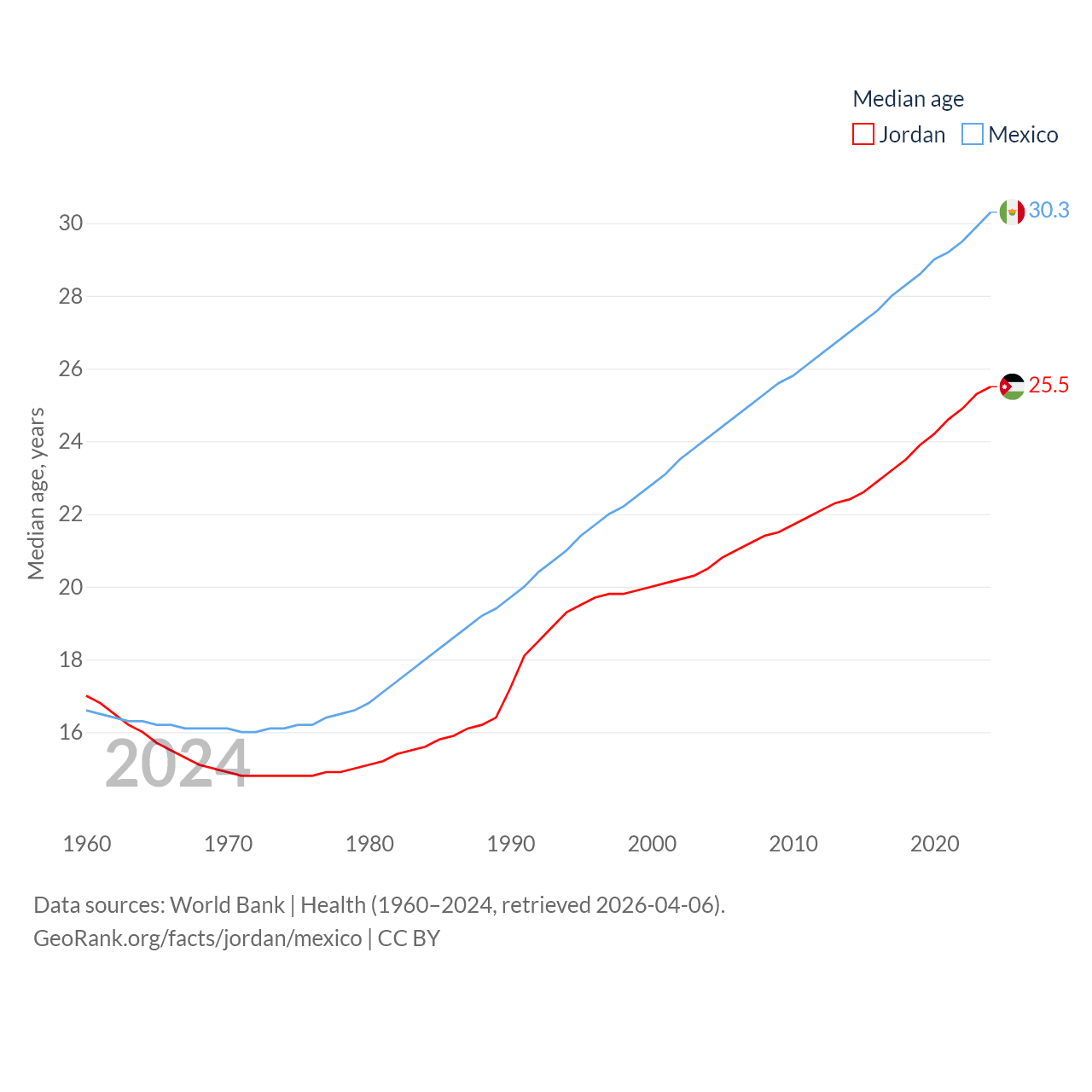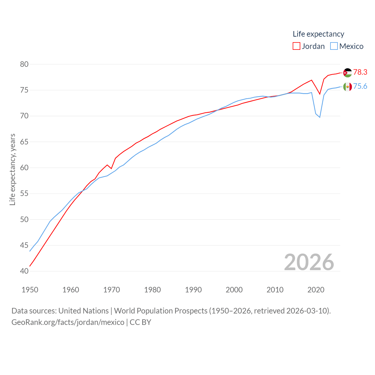 Jordan has a population of 11.6M (ranked 84/197), compared with 131M in Mexico (ranked 11/197). Jordan's land area is 34,284 sq mi versus 750,563 sq mi for Mexico (ranked 110th vs. 13th).