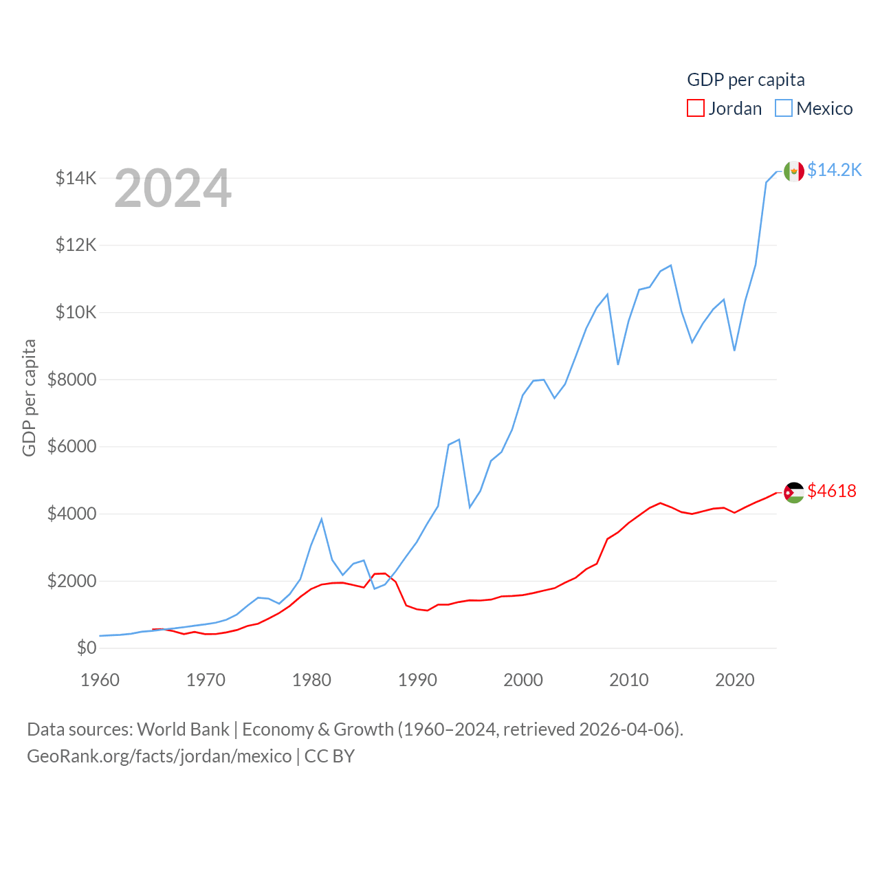 By GDP, Jordan ranks 90/197 ($53.4B) and Mexico ranks 13/197 ($1.86T). By GDP per capita, Jordan ranks 123/197 ($4,618), while Mexico ranks 69/197 ($14,186).