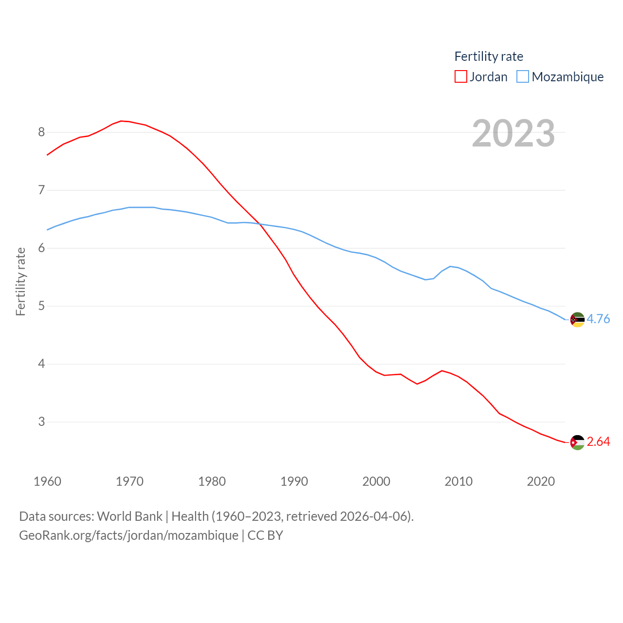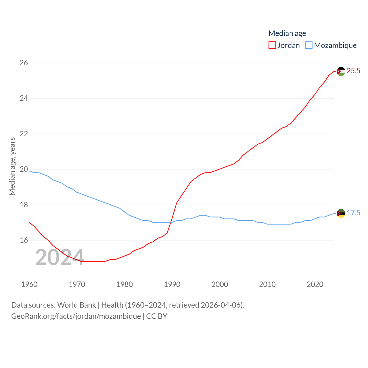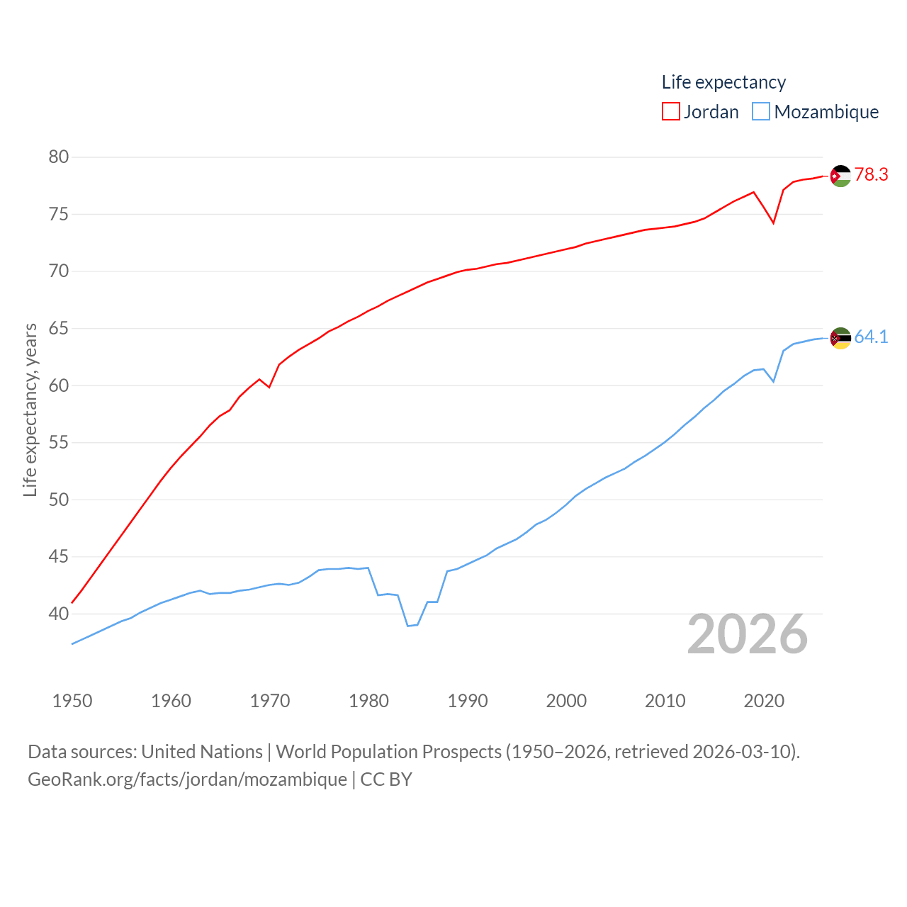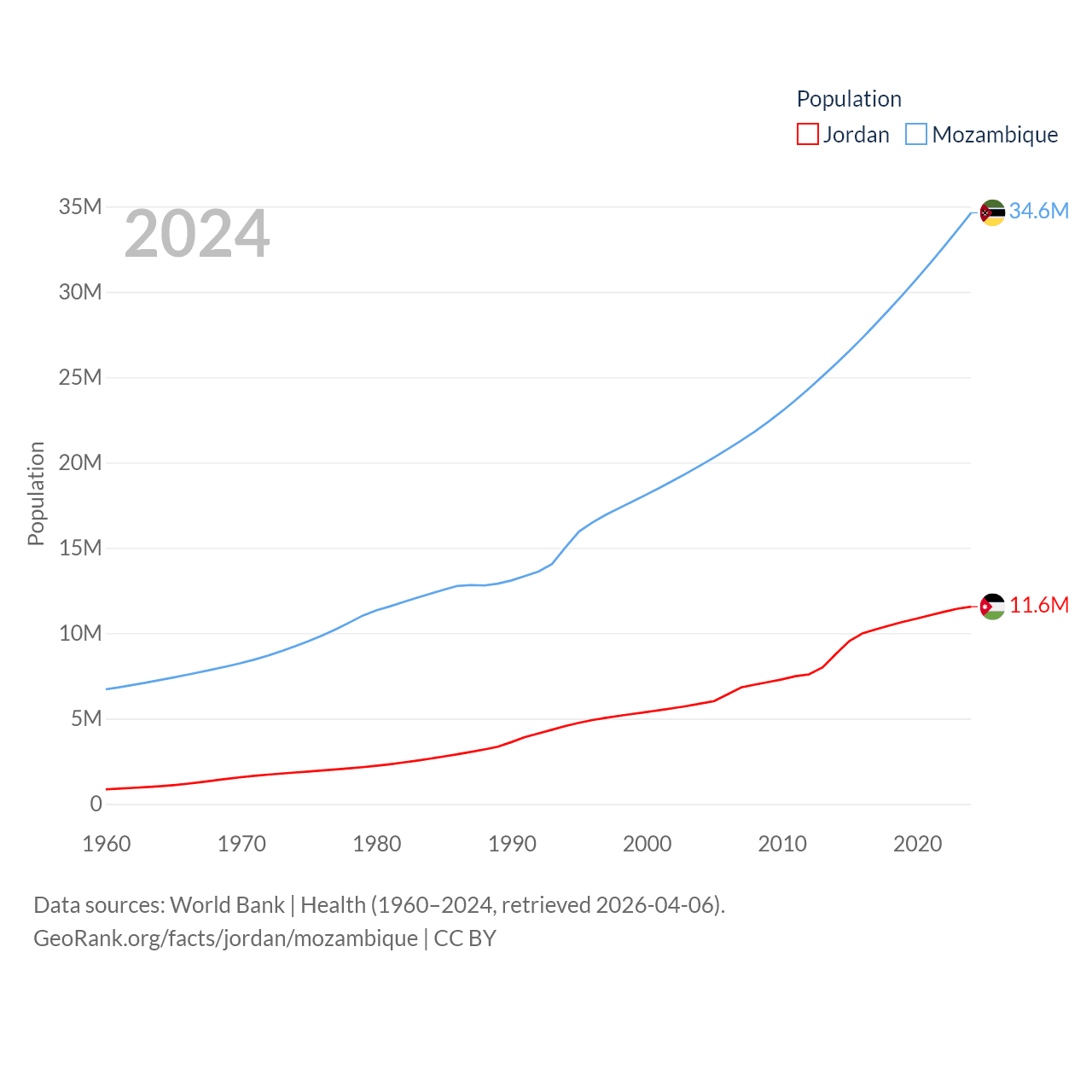 Jordan has a population of 11.6M (ranked 84/197), compared with 34.6M in Mozambique (ranked 46/197). Jordan's land area is 34,284 sq mi versus 303,623 sq mi for Mozambique (ranked 110th vs. 34th).