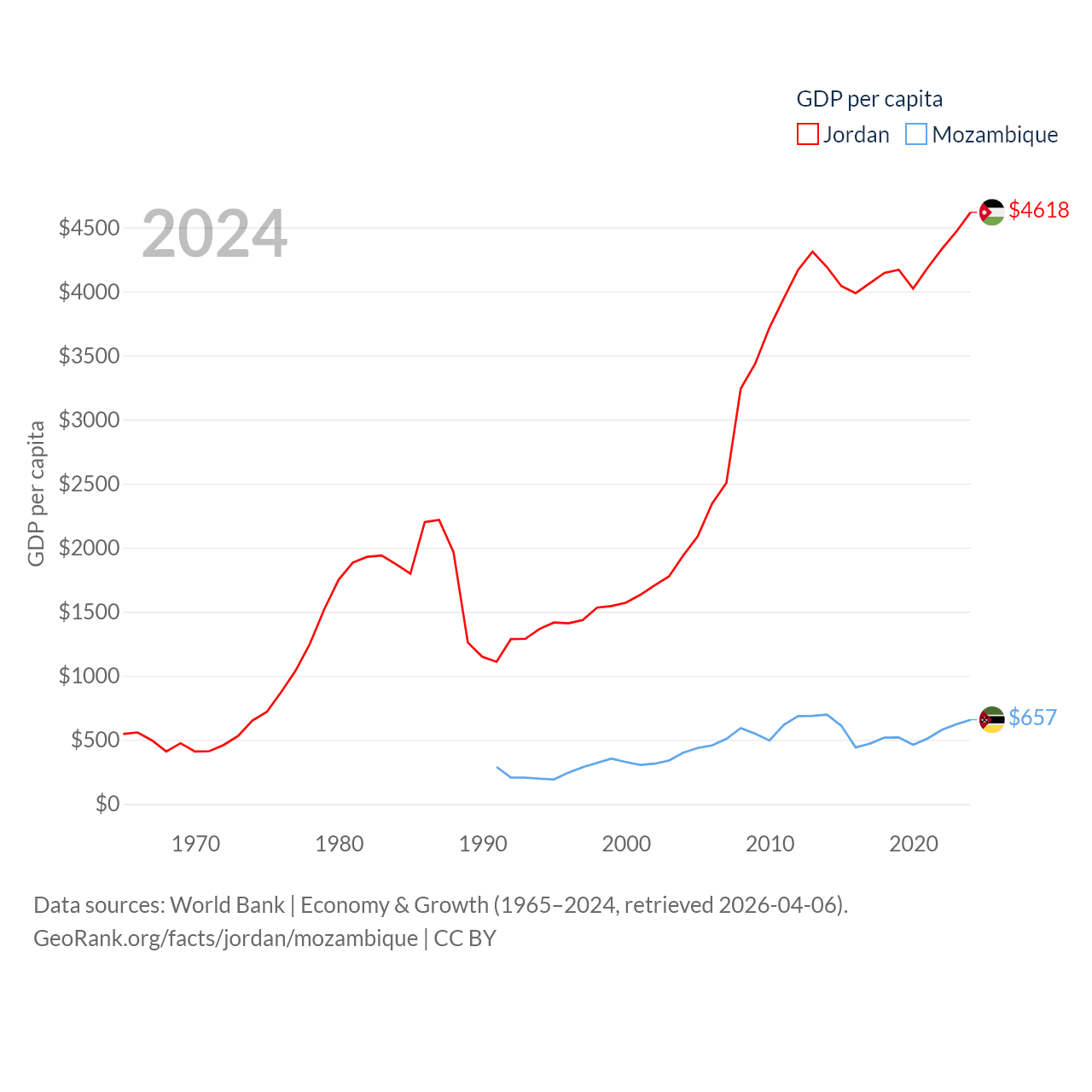 By GDP, Jordan ranks 90/197 ($53.4B) and Mozambique ranks 123/197 ($22.7B). By GDP per capita, Jordan ranks 123/197 ($4,618), while Mozambique ranks 189/197 ($657).