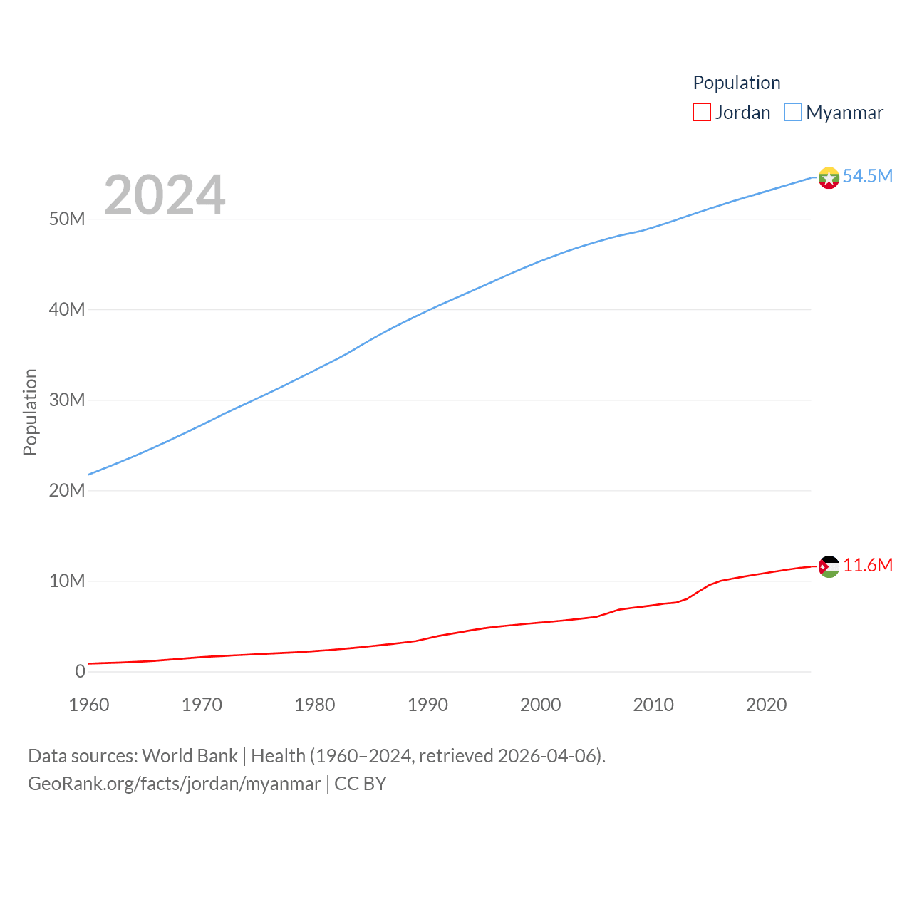 Jordan has a population of 11.6M (ranked 84/197), compared with 54.5M in Myanmar (ranked 27/197). Jordan's land area is 34,284 sq mi versus 251,997 sq mi for Myanmar (ranked 110th vs. 39th).