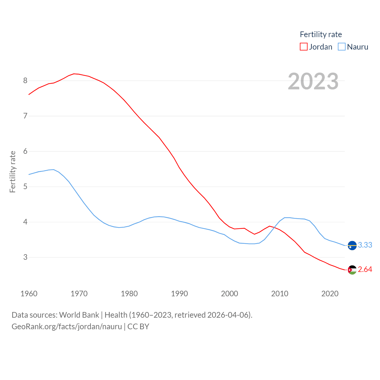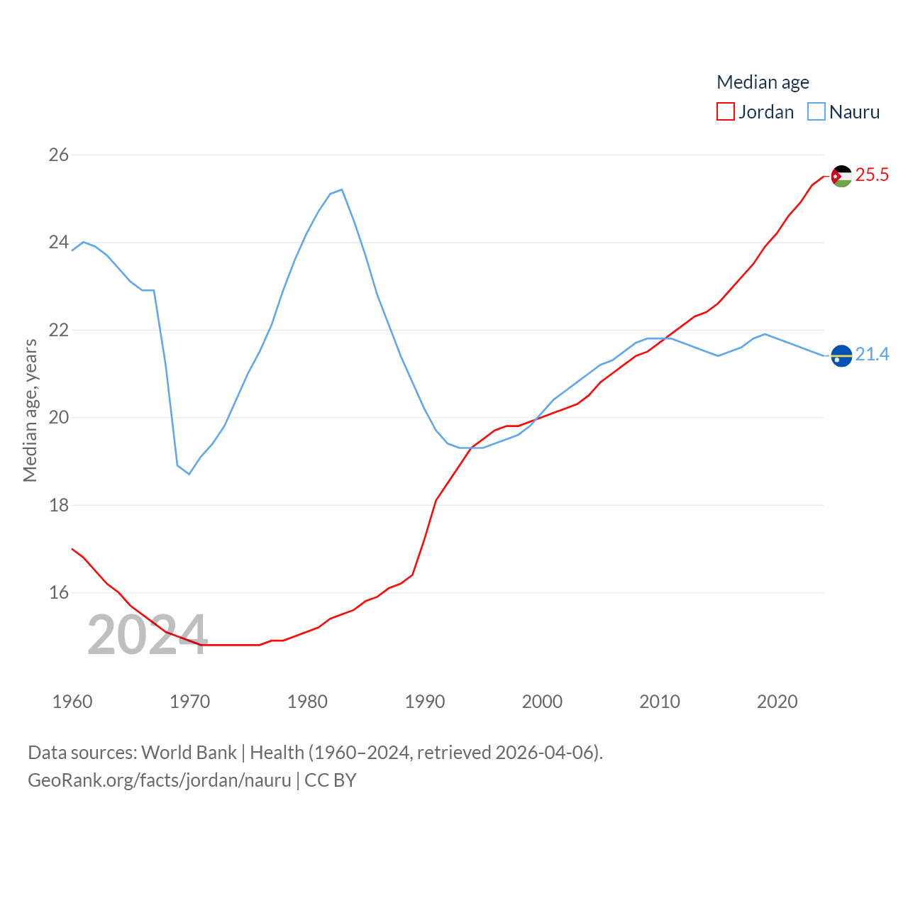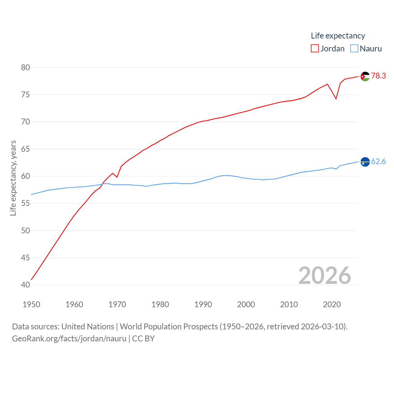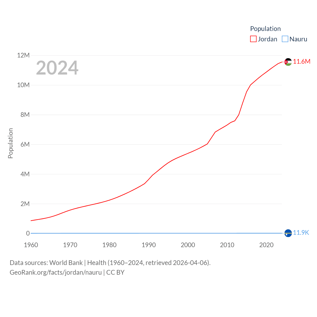 Jordan has a population of 11.6M (ranked 84/197), compared with 11.9K in Nauru (ranked 195/197). Jordan's land area is 34,284 sq mi versus 7.72 sq mi for Nauru (ranked 110th vs. 195th).