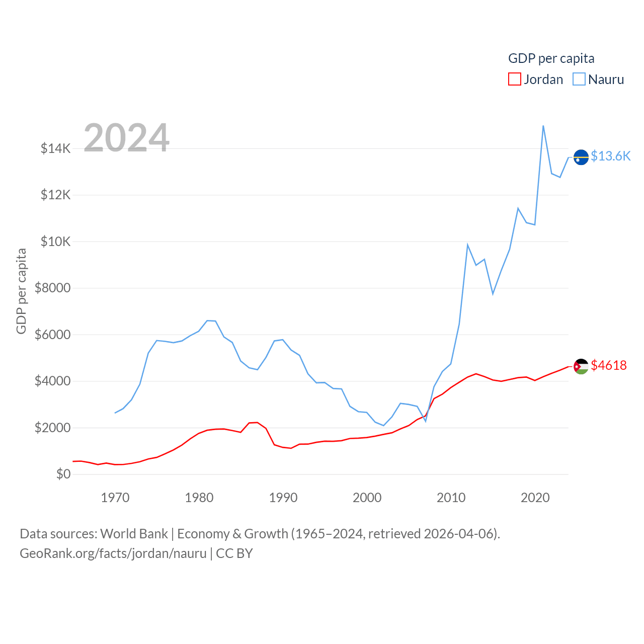 By GDP, Jordan ranks 90/197 ($53.4B) and Nauru ranks 195/197 ($163M). By GDP per capita, Jordan ranks 123/197 ($4,618), while Nauru ranks 74/197 ($13,609).