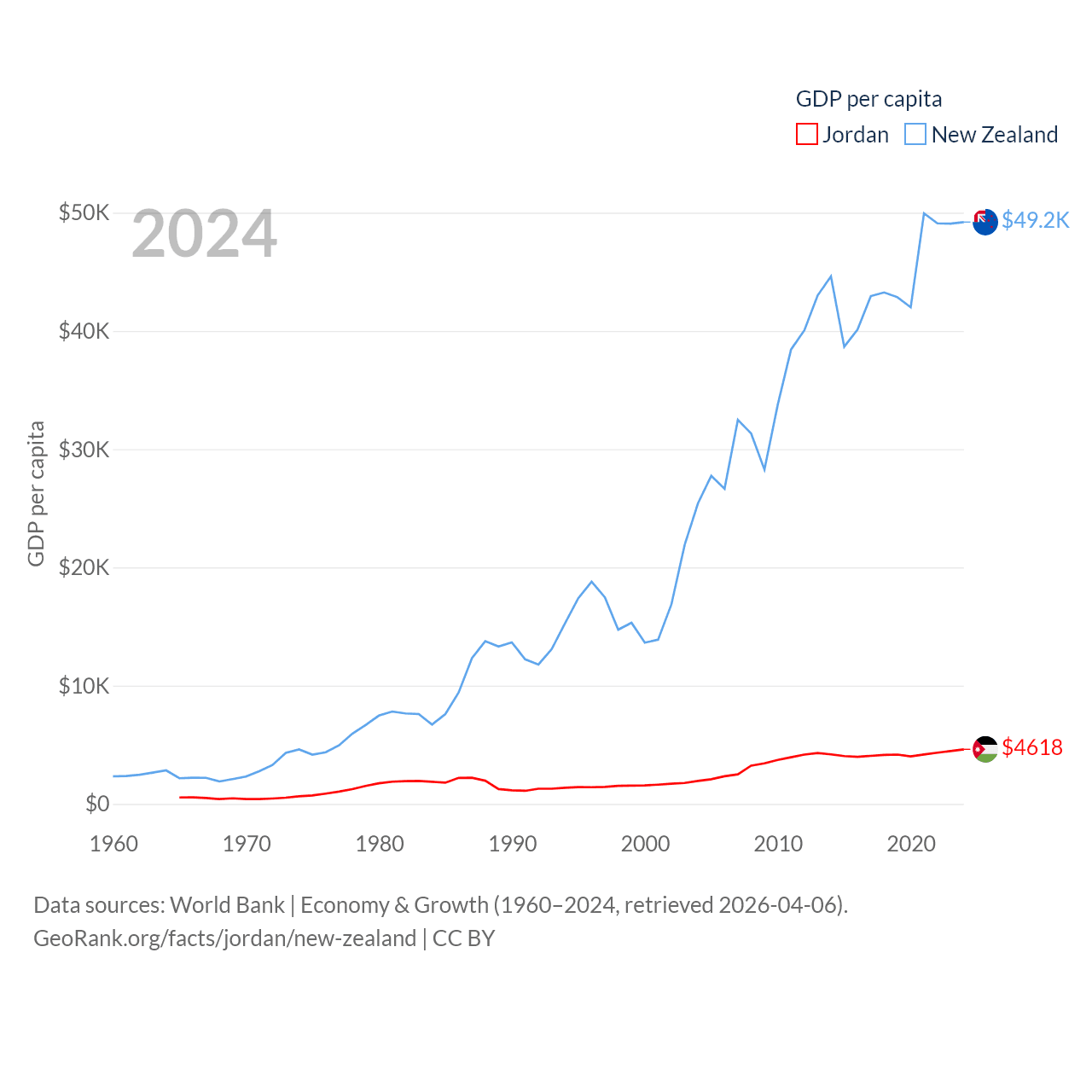 By GDP, Jordan ranks 90/197 ($53.4B) and New Zealand ranks 52/197 ($260B). By GDP per capita, Jordan ranks 123/197 ($4,618), while New Zealand ranks 26/197 ($49,205).