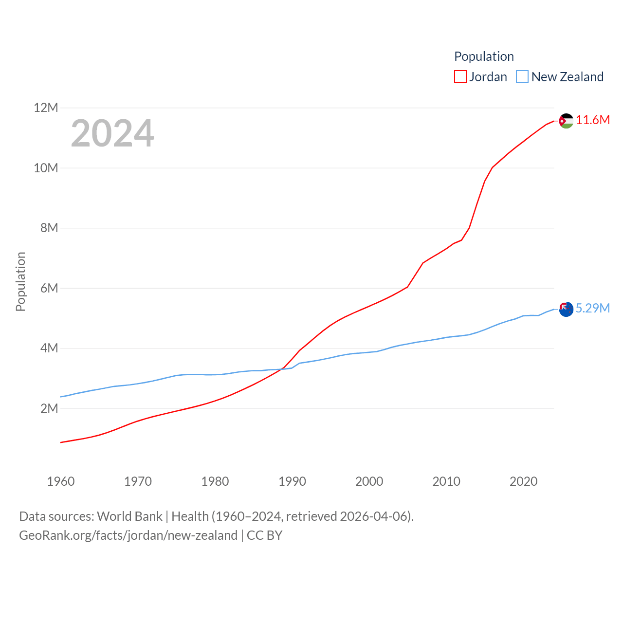 Jordan has a population of 11.6M (ranked 84/197), compared with 5.29M in New Zealand (ranked 123/197). Jordan's land area is 34,284 sq mi versus 101,665 sq mi for New Zealand (ranked 110th vs. 74th).