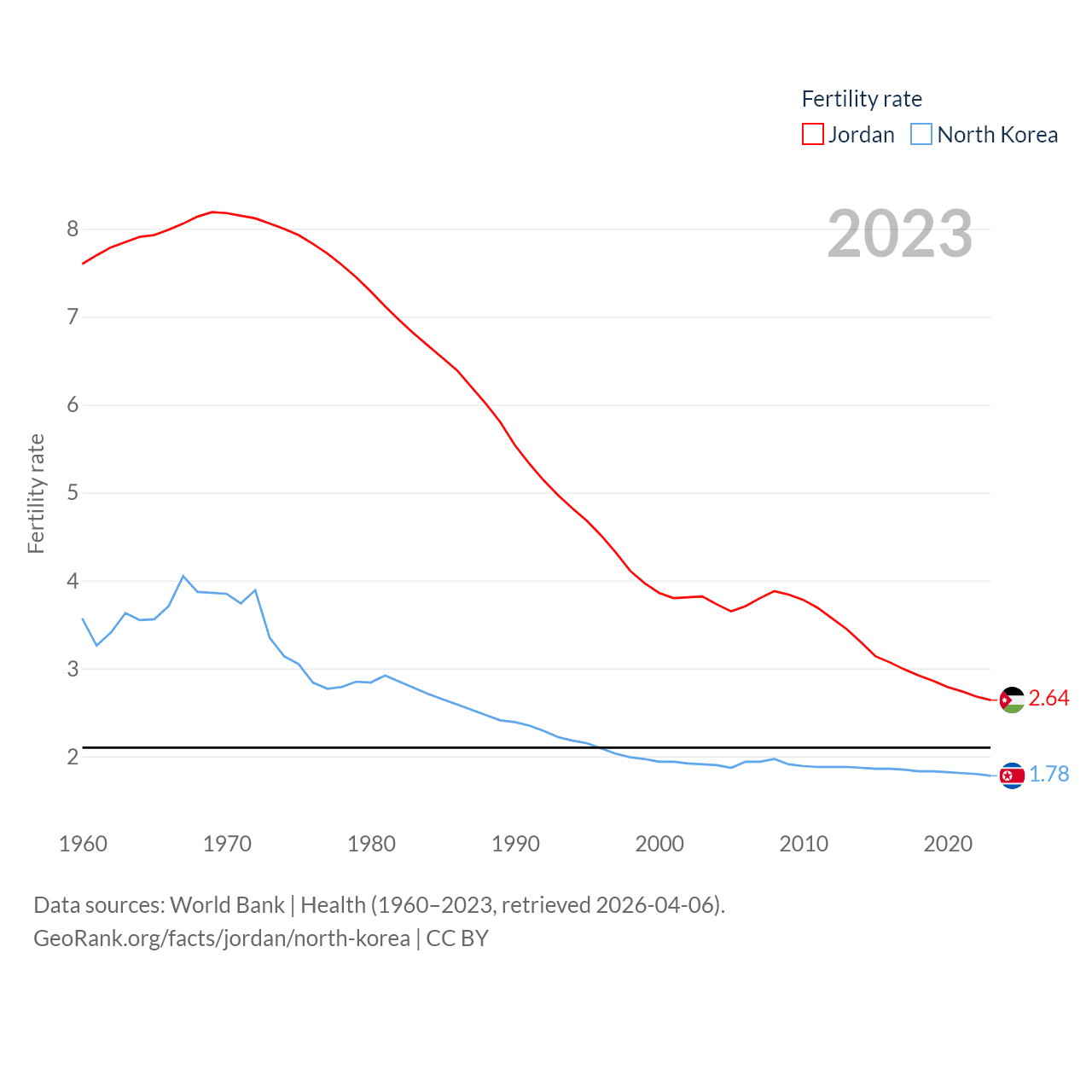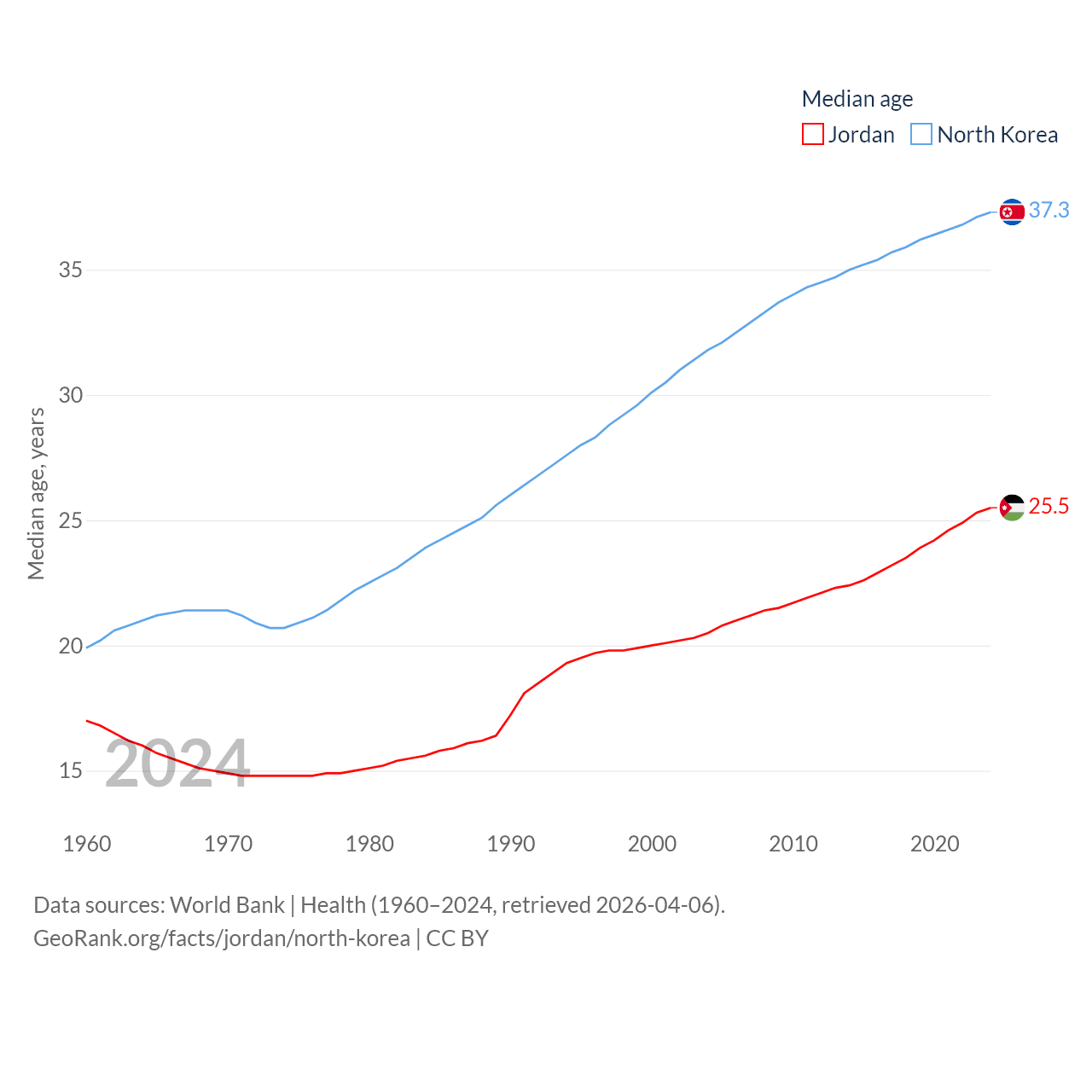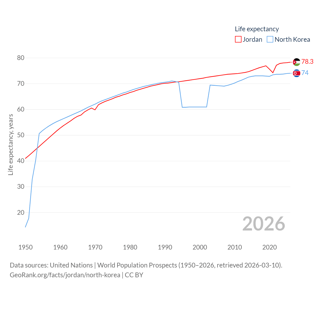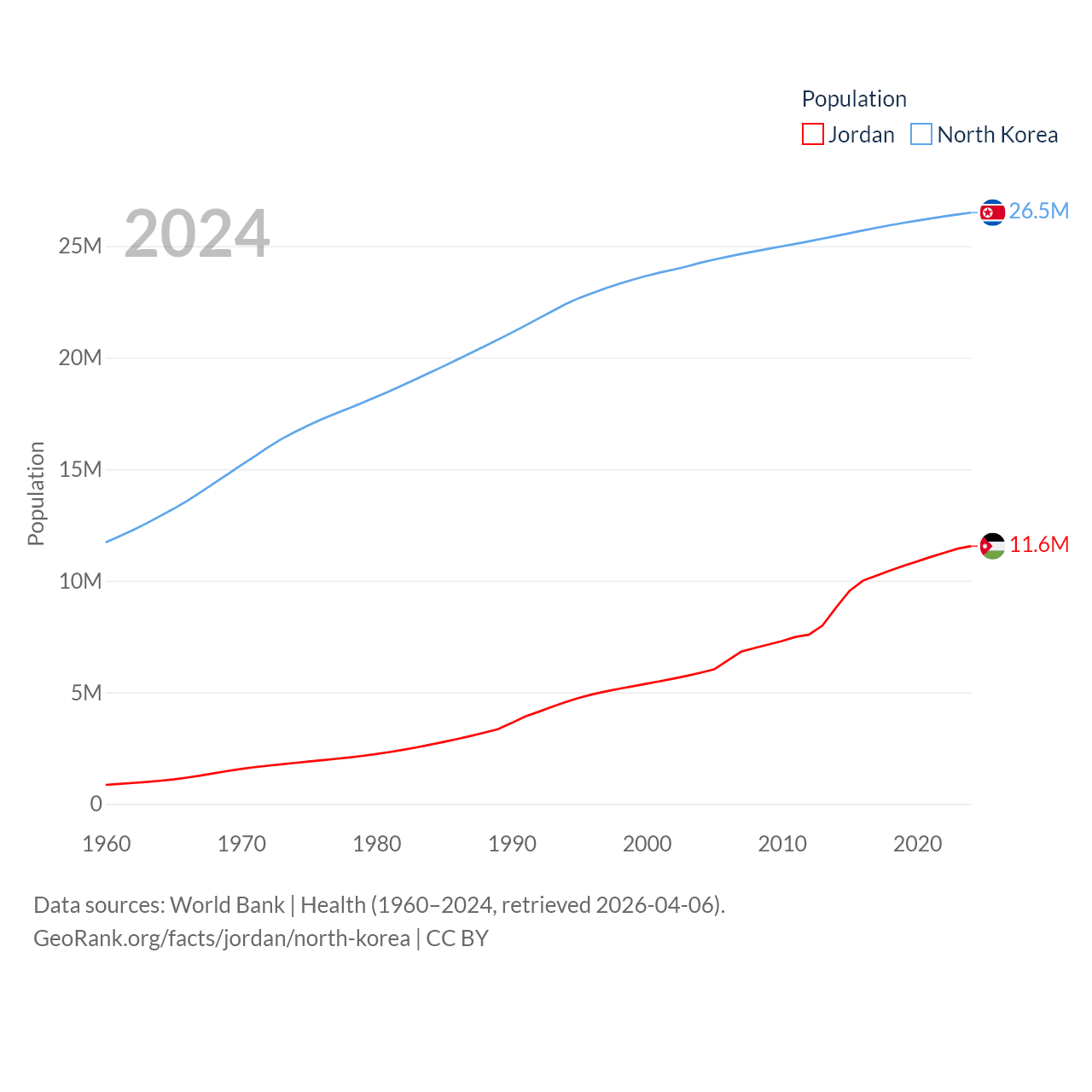 Jordan has a population of 11.6M (ranked 84/197), compared with 26.5M in North Korea (ranked 56/197). Jordan's land area is 34,284 sq mi versus 46,491 sq mi for North Korea (ranked 110th vs. 97th).