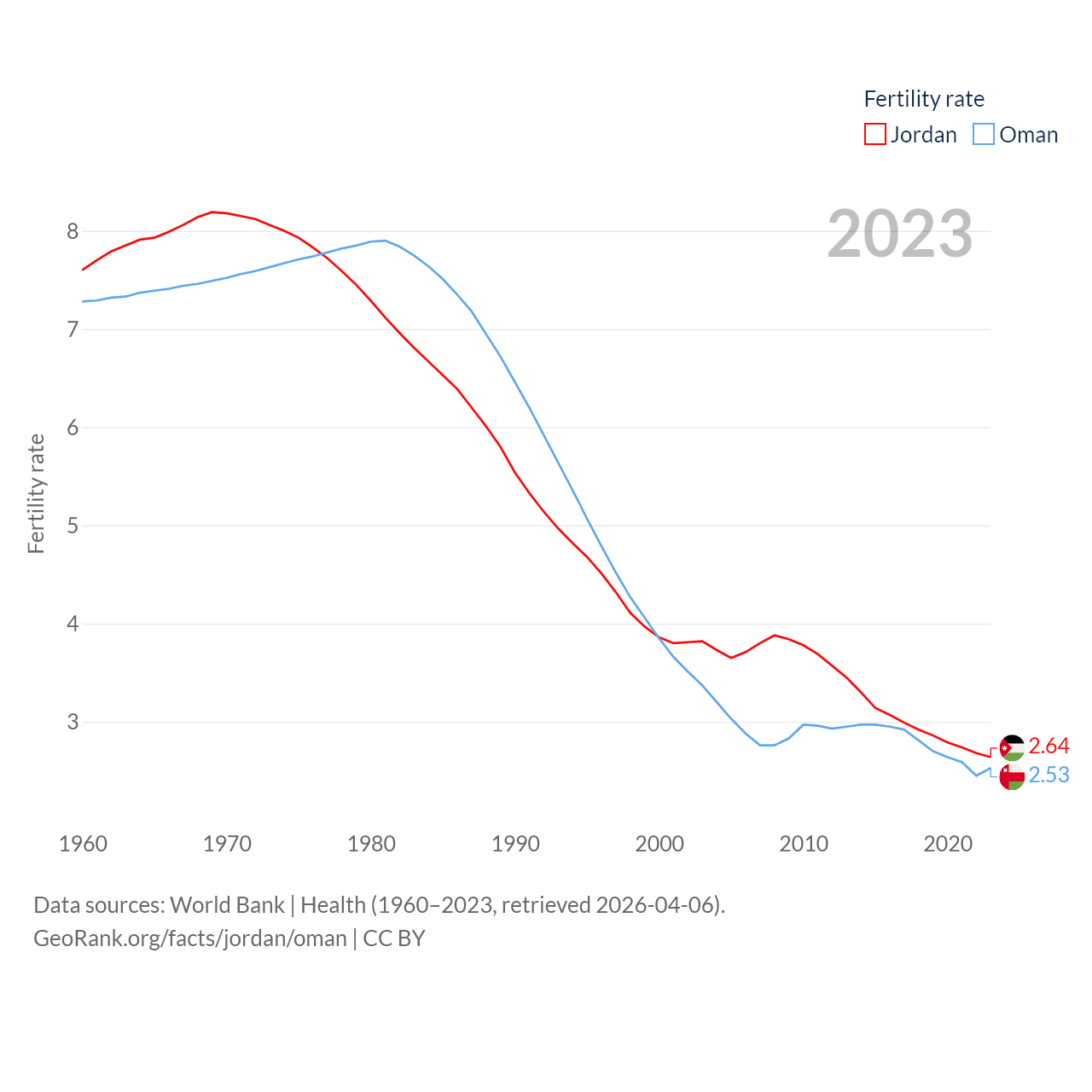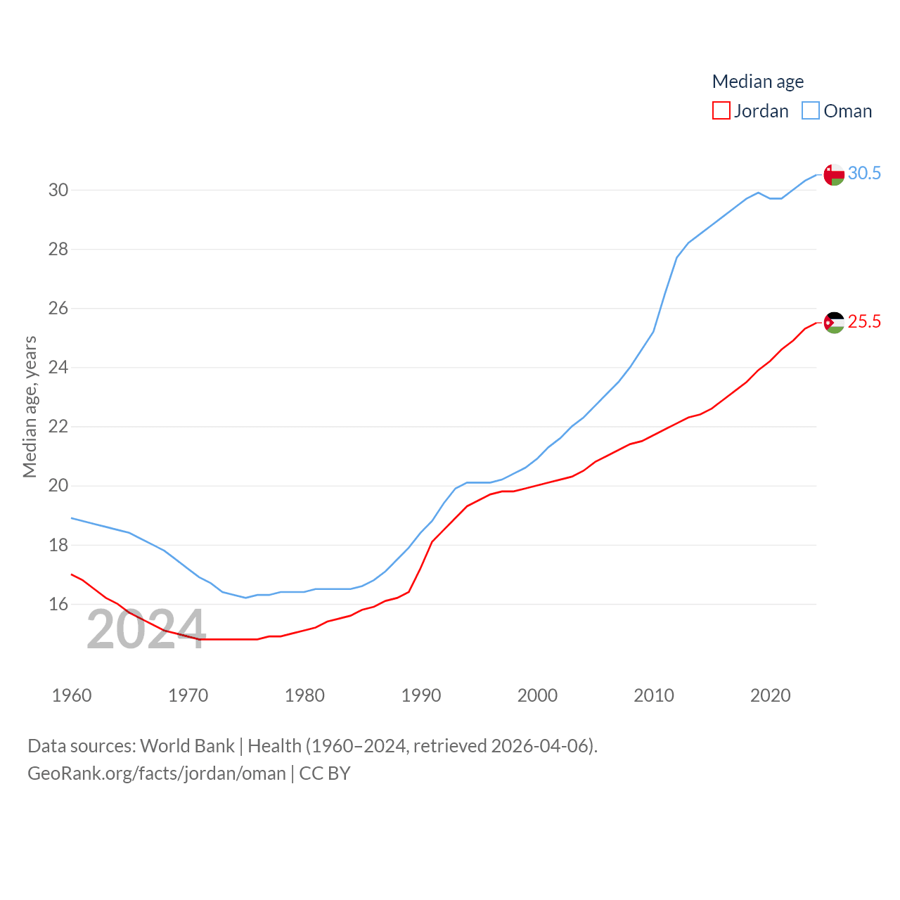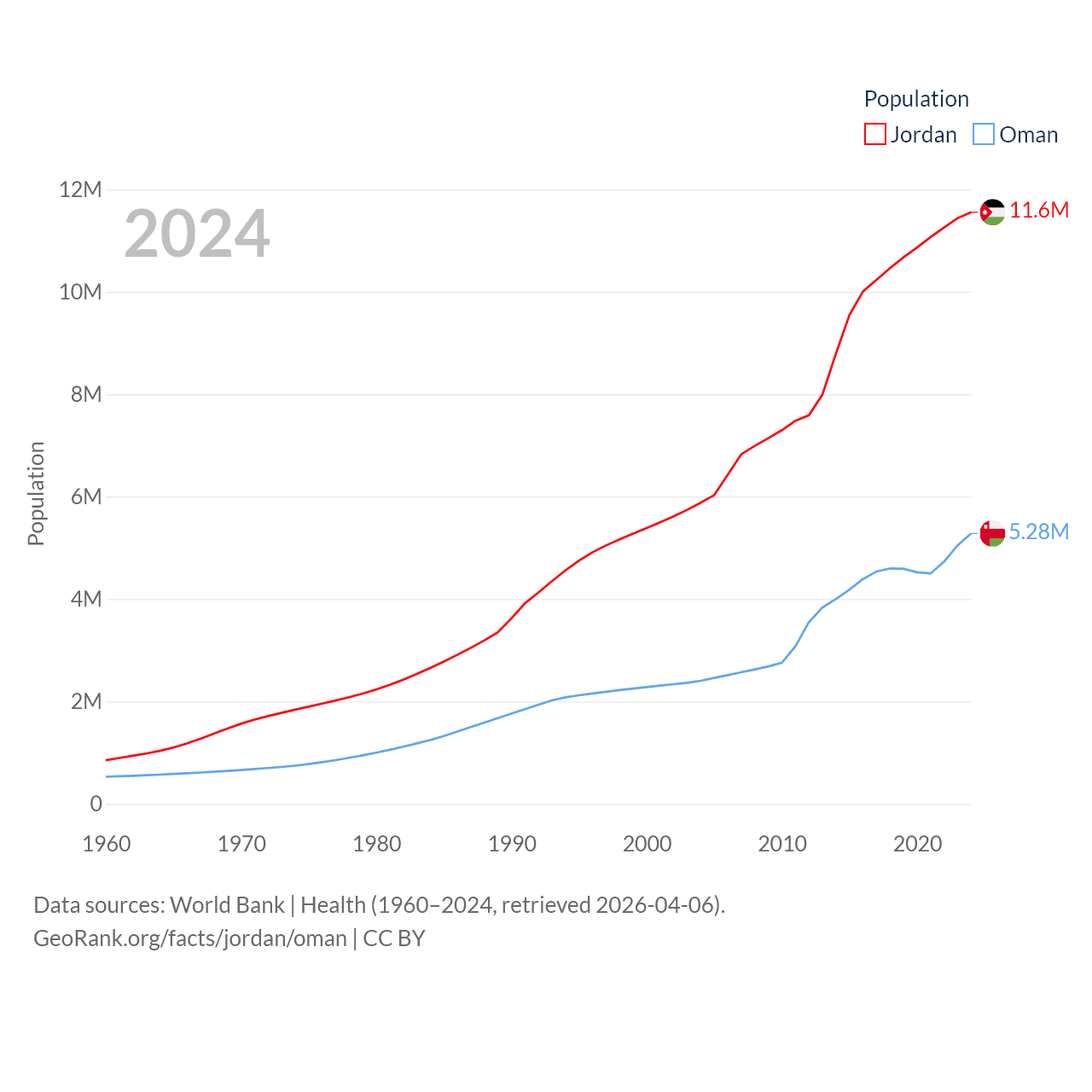 Jordan has a population of 11.6M (ranked 84/197), compared with 5.28M in Oman (ranked 124/197). Jordan's land area is 34,284 sq mi versus 119,499 sq mi for Oman (ranked 110th vs. 68th).