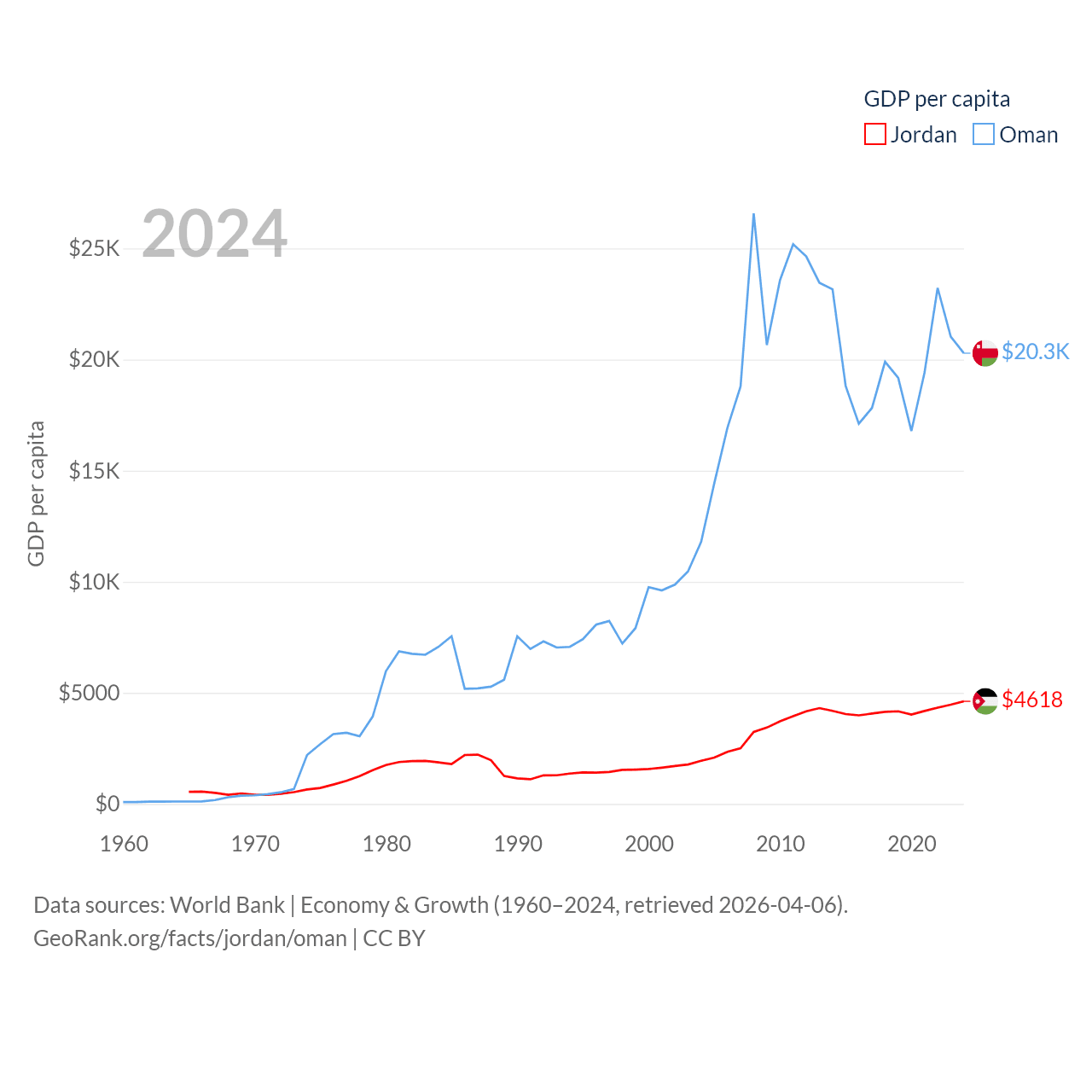 By GDP, Jordan ranks 90/197 ($53.4B) and Oman ranks 70/197 ($107B). By GDP per capita, Jordan ranks 123/197 ($4,618), while Oman ranks 57/197 ($20,285).