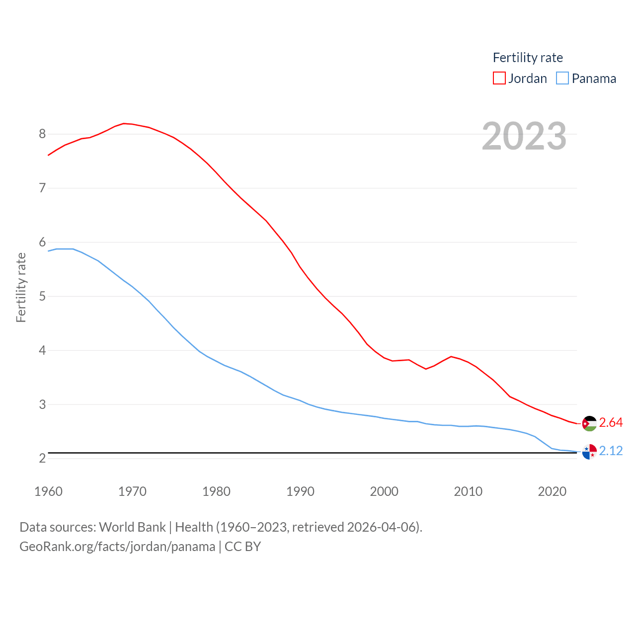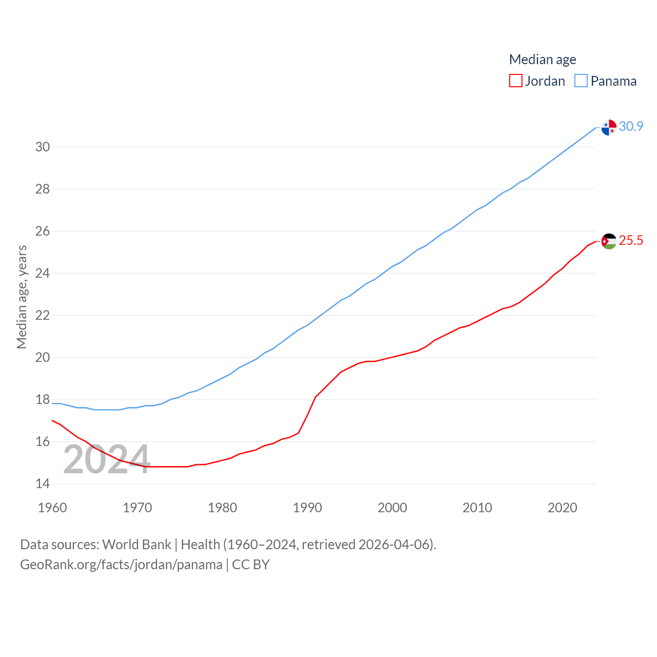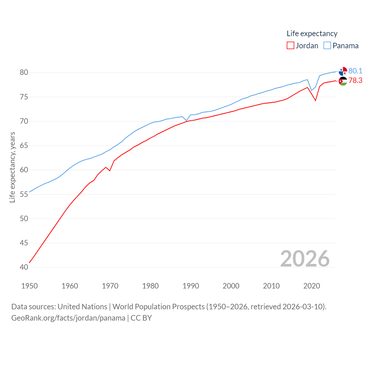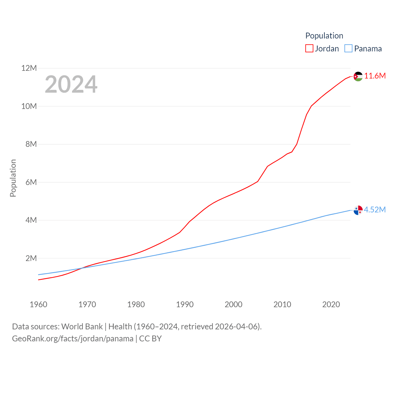 Jordan has a population of 11.6M (ranked 84/197), compared with 4.52M in Panama (ranked 128/197). Jordan's land area is 34,284 sq mi versus 28,641 sq mi for Panama (ranked 110th vs. 115th).