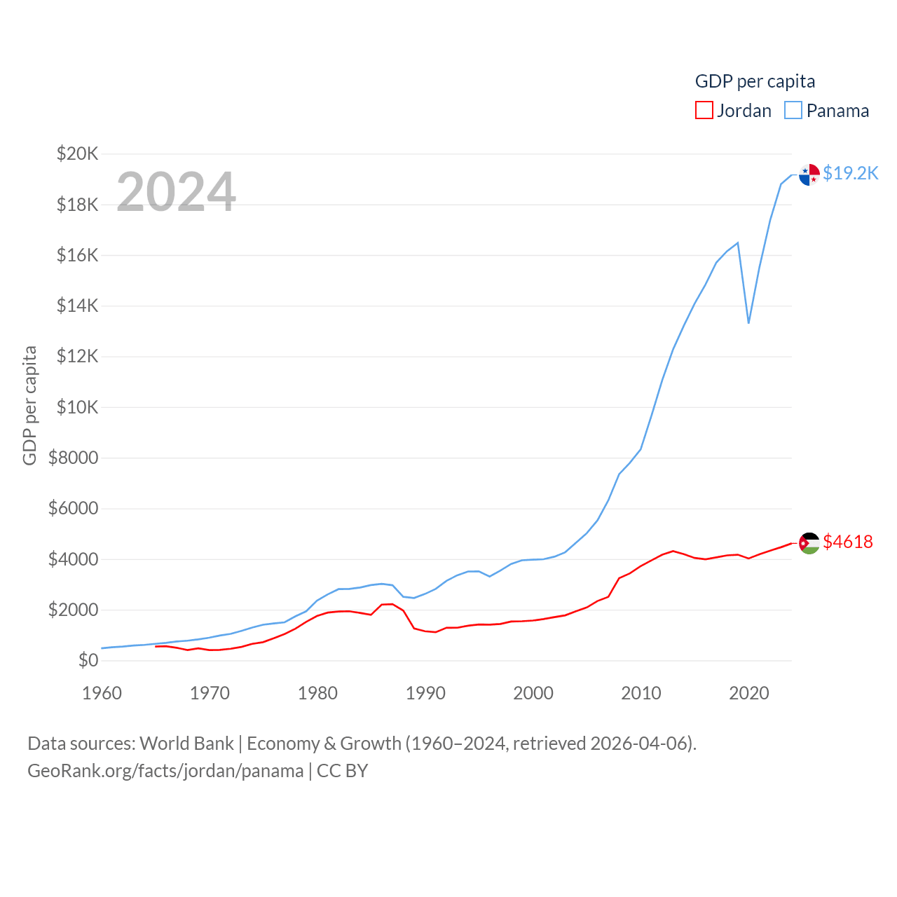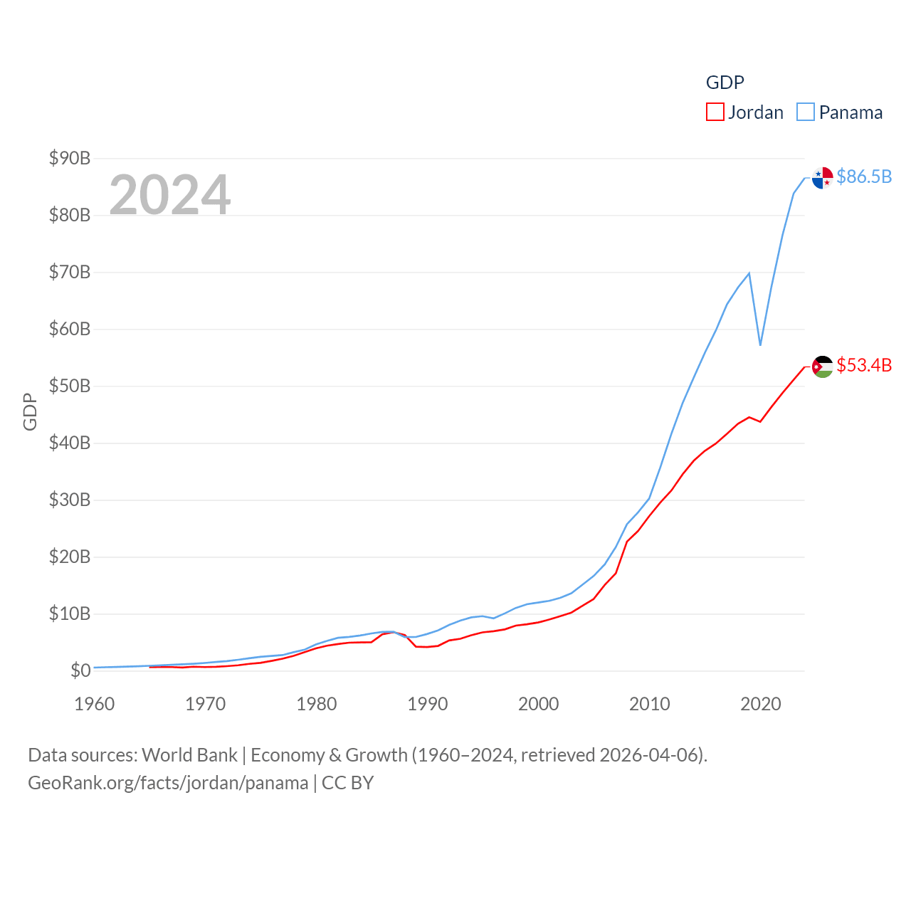 By GDP, Jordan ranks 90/197 ($53.4B) and Panama ranks 78/197 ($86.5B). By GDP per capita, Jordan ranks 123/197 ($4,618), while Panama ranks 60/197 ($19,161).