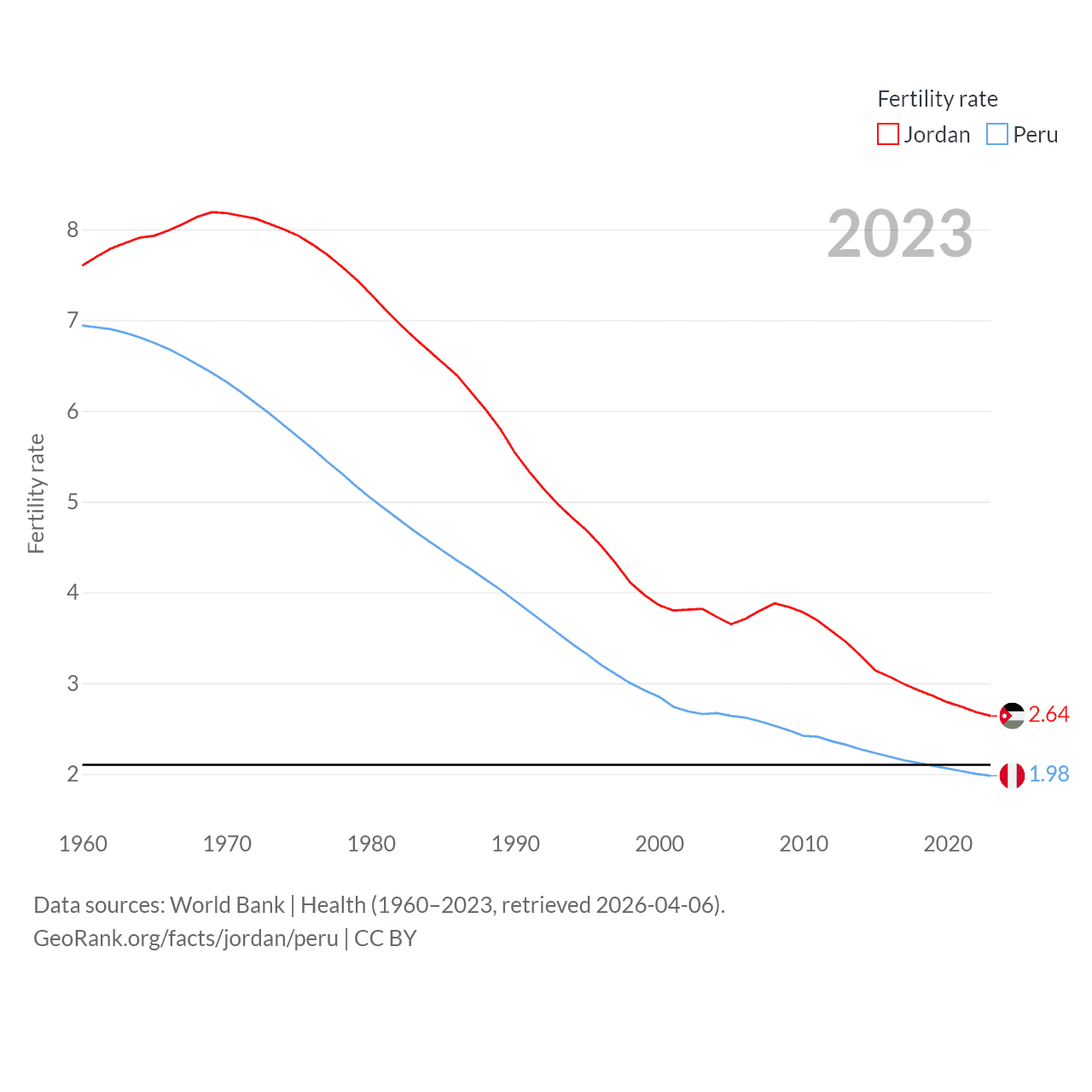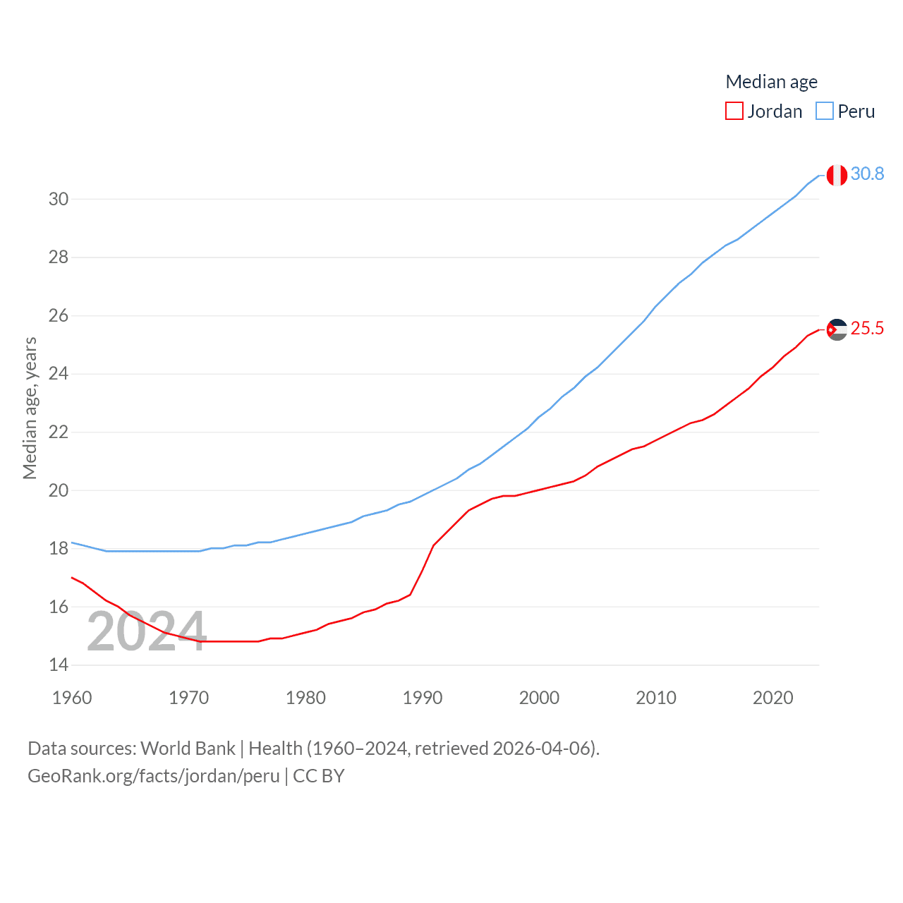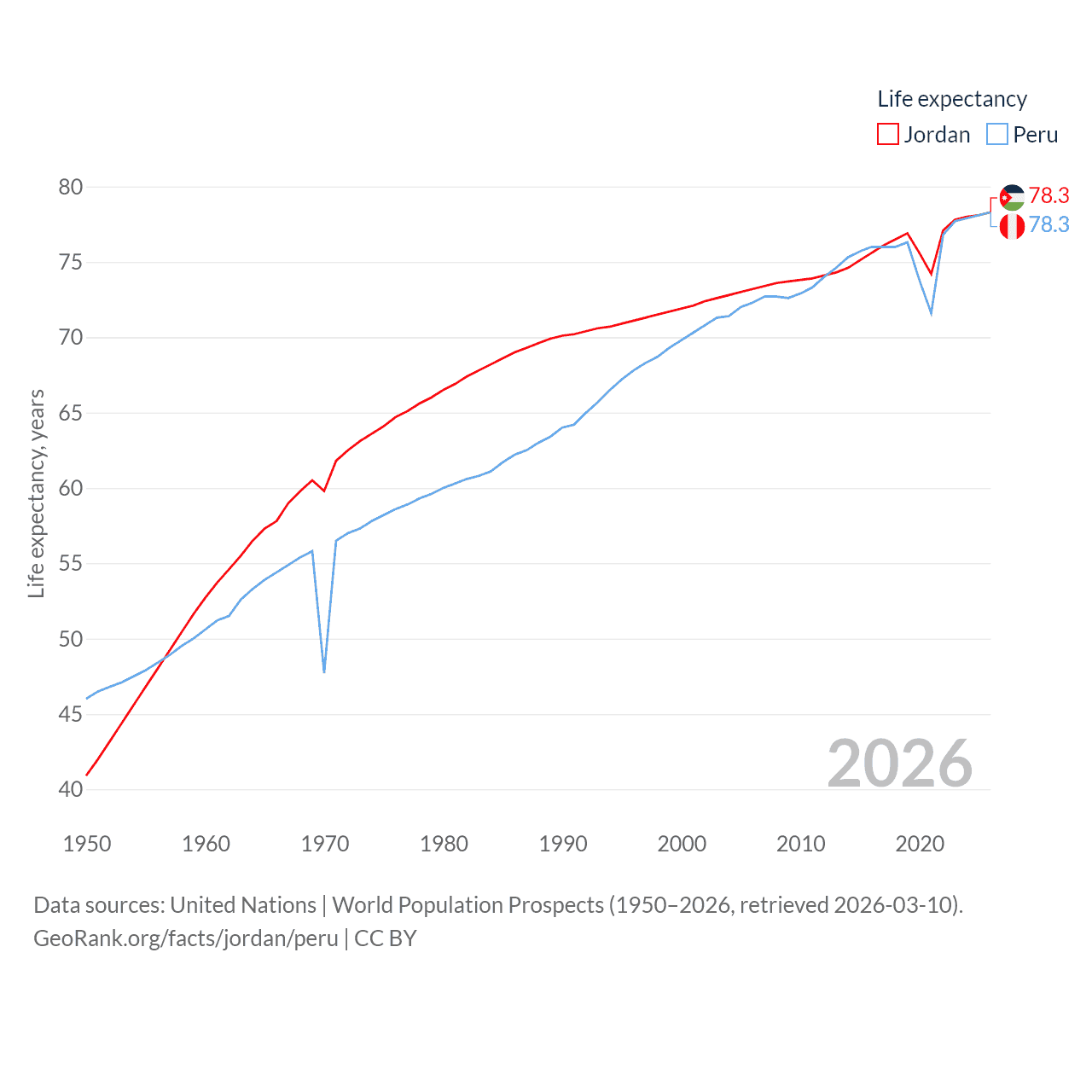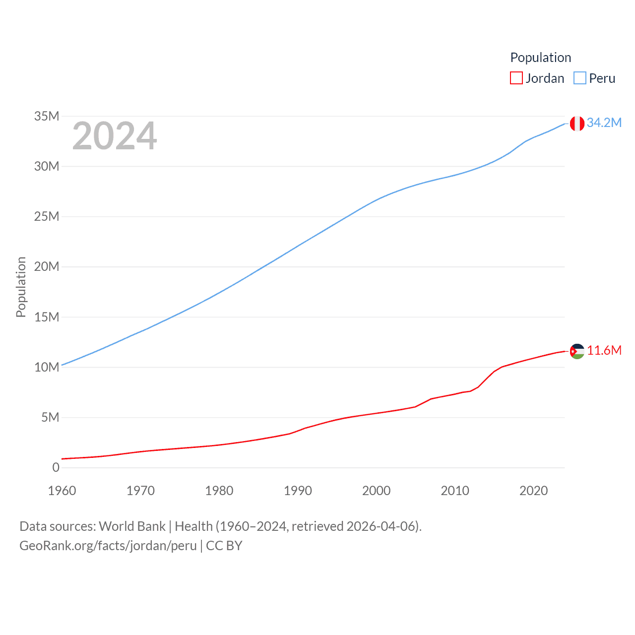 Jordan has a population of 11.6M (ranked 84/197), compared with 34.2M in Peru (ranked 48/197). Jordan's land area is 34,284 sq mi versus 494,211 sq mi for Peru (ranked 110th vs. 19th).