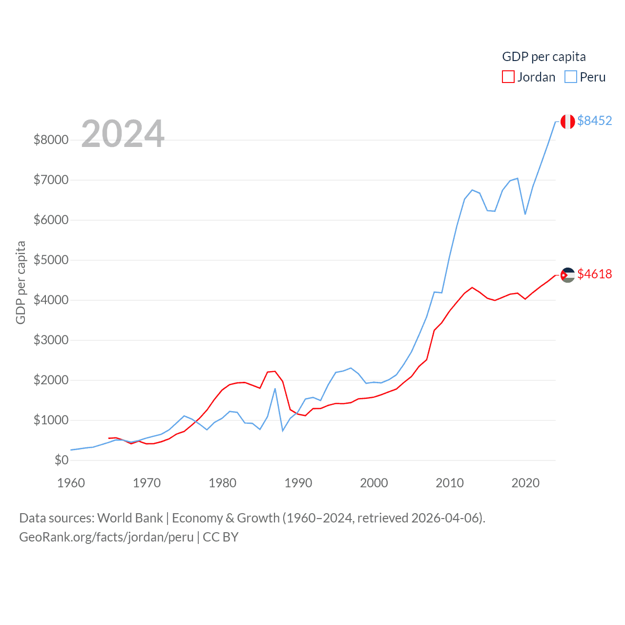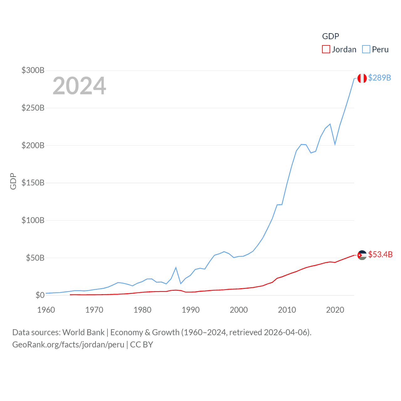 By GDP, Jordan ranks 90/197 ($53.4B) and Peru ranks 49/197 ($289B). By GDP per capita, Jordan ranks 123/197 ($4,618), while Peru ranks 91/197 ($8,452).