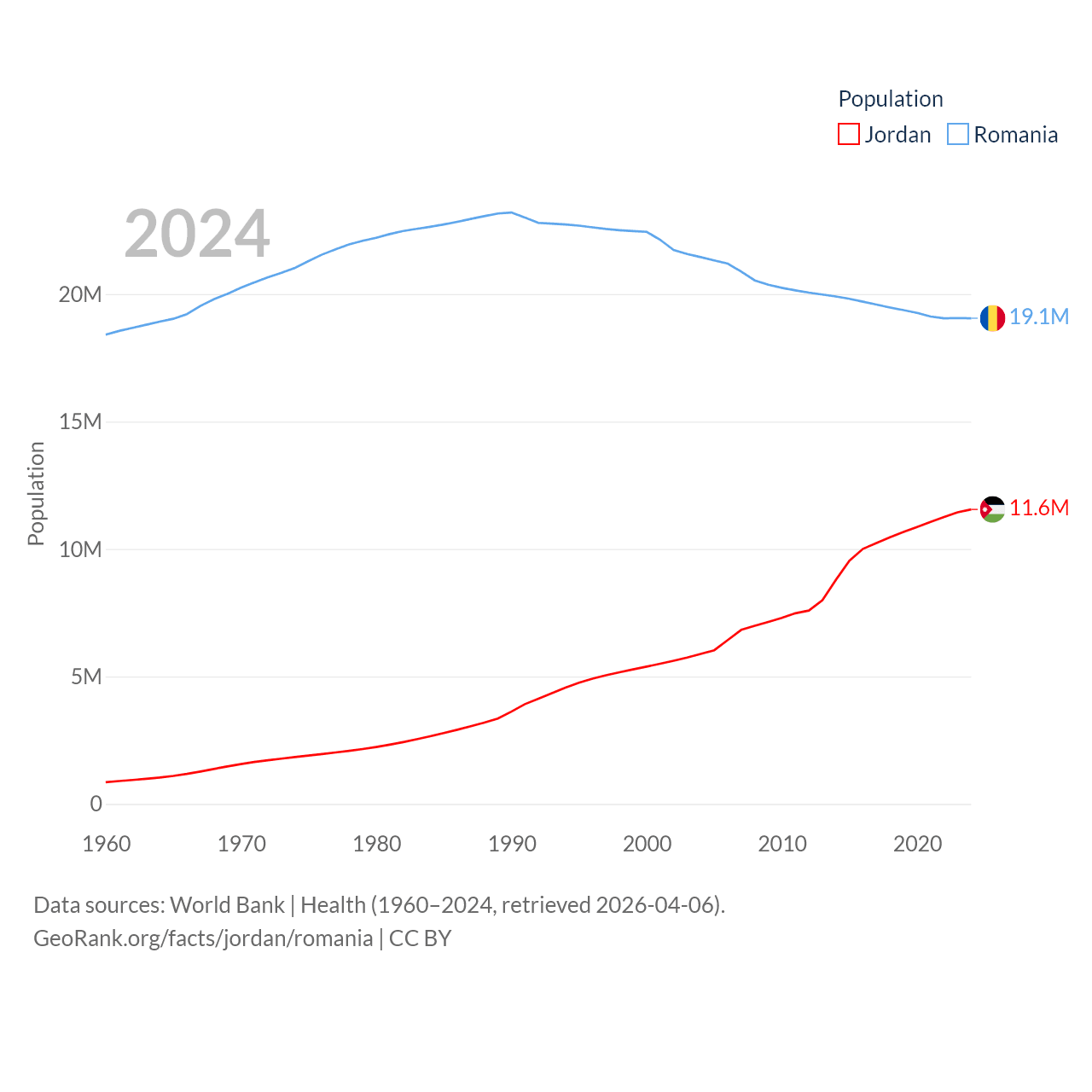 Jordan has a population of 11.6M (ranked 84/197), compared with 19.1M in Romania (ranked 67/197). Jordan's land area is 34,284 sq mi versus 88,834 sq mi for Romania (ranked 110th vs. 80th).