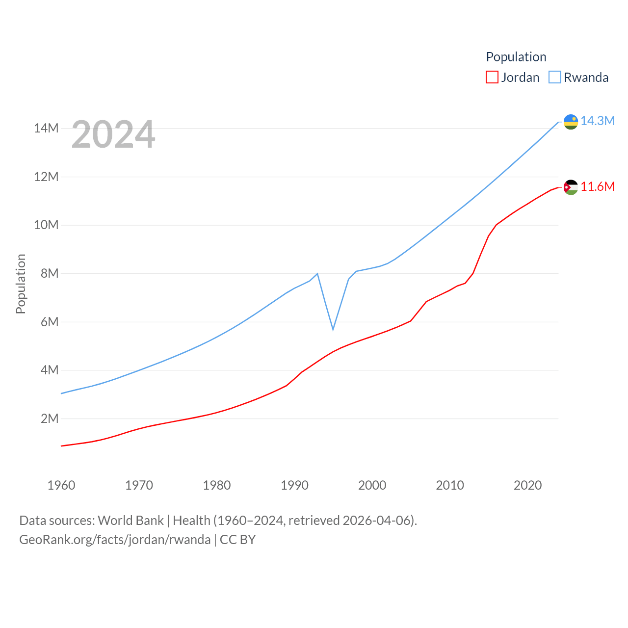 Jordan has a population of 11.6M (ranked 84/197), compared with 14.3M in Rwanda (ranked 77/197). Jordan's land area is 34,284 sq mi versus 9,525 sq mi for Rwanda (ranked 110th vs. 146th).