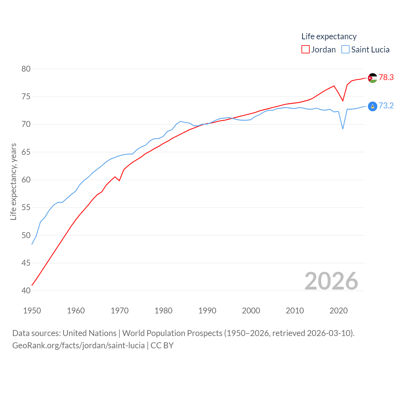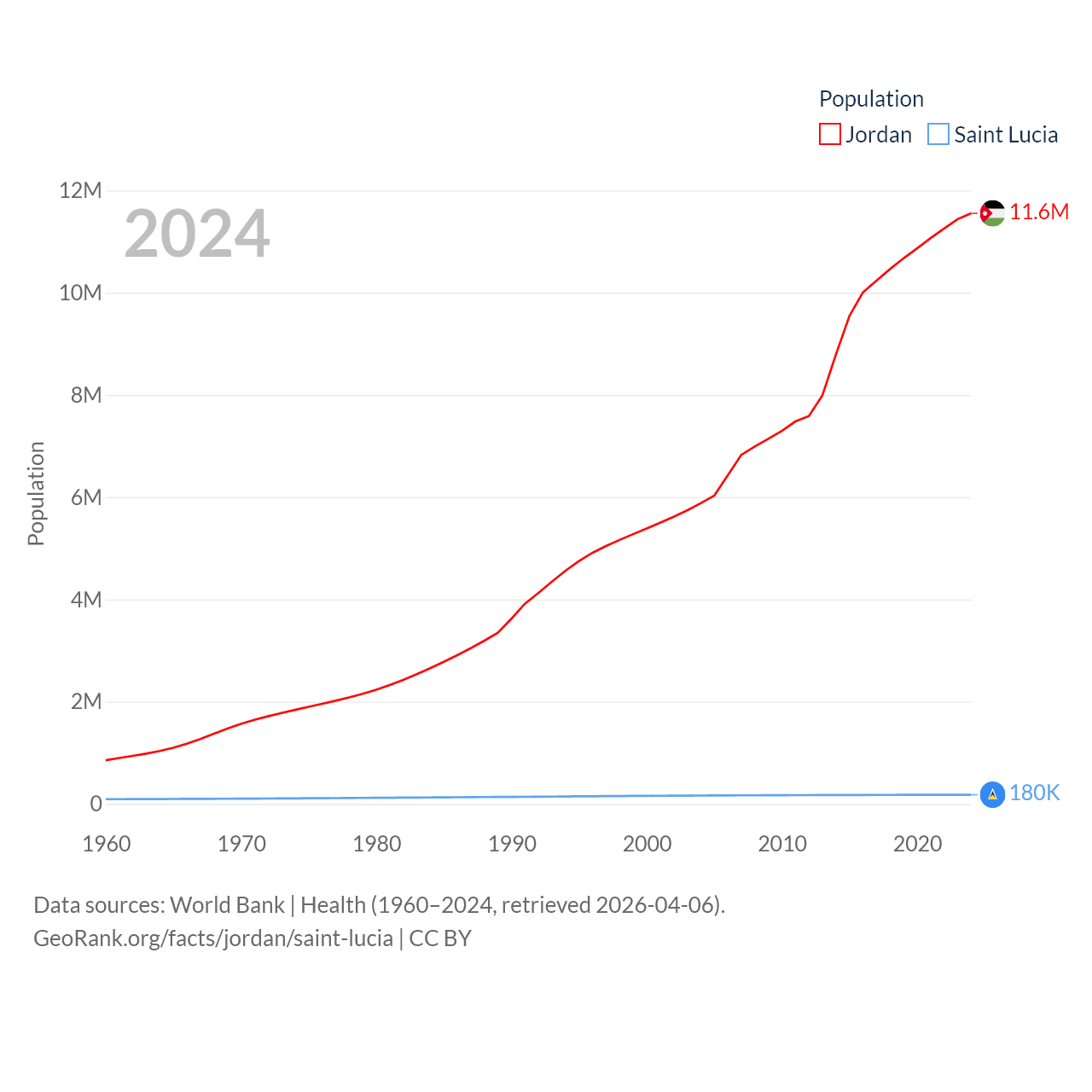 Jordan has a population of 11.6M (ranked 84/197), compared with 180K in Saint Lucia (ranked 178/197). Jordan's land area is 34,284 sq mi versus 235.5 sq mi for Saint Lucia (ranked 110th vs. 178th).