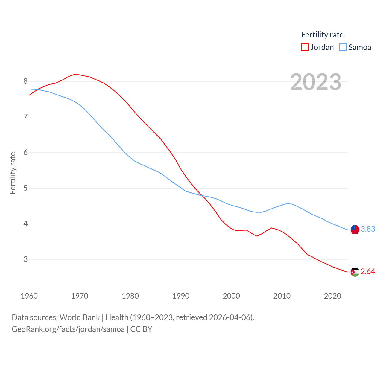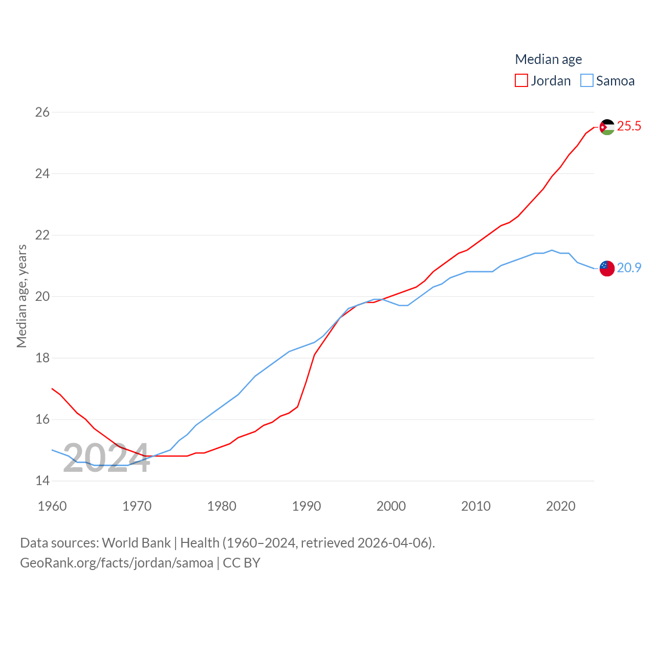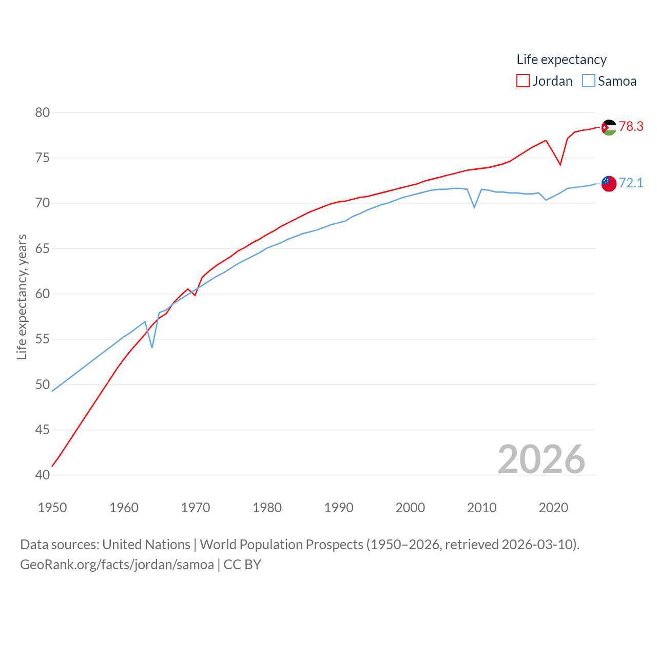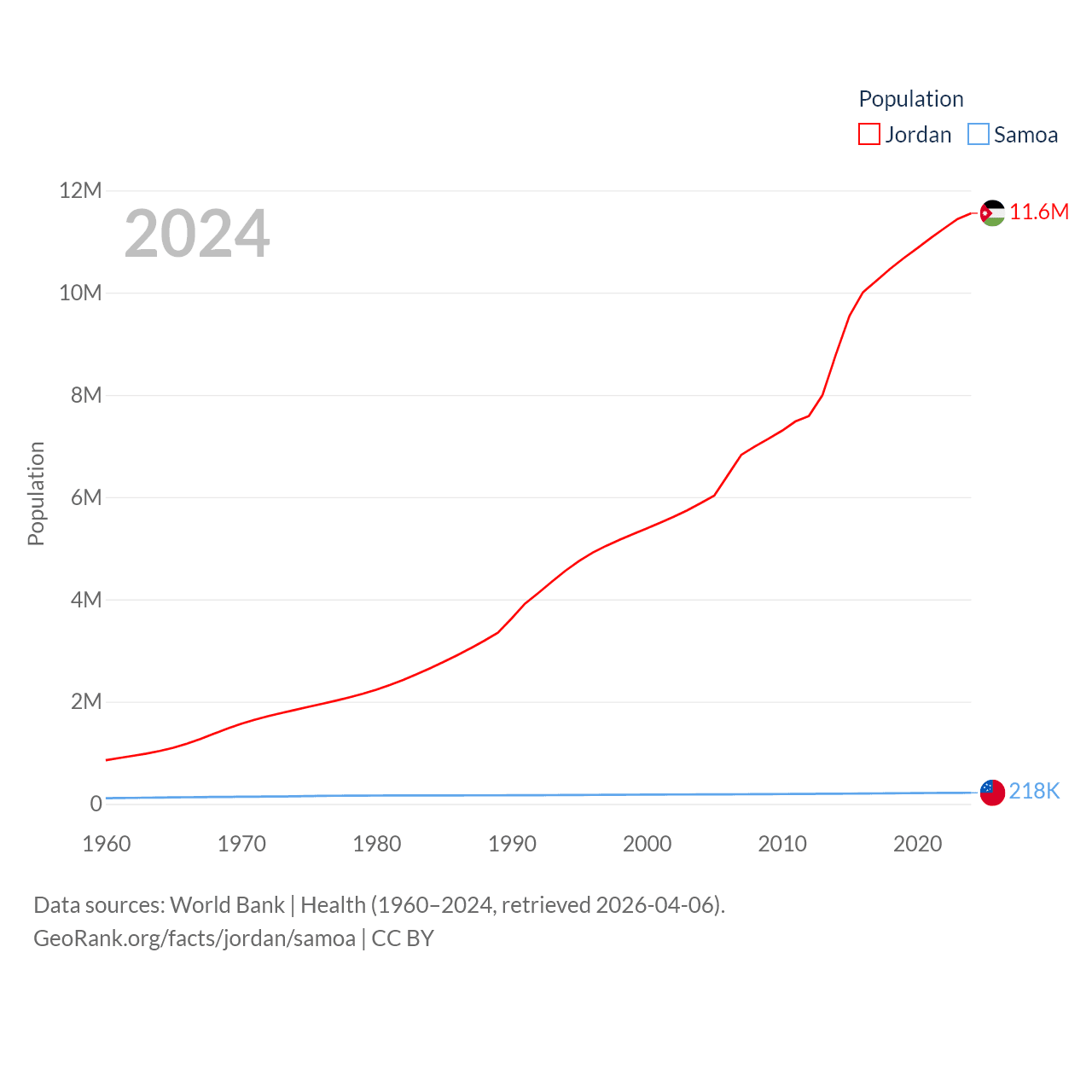Jordan has a population of 11.6M (ranked 84/197), compared with 218K in Samoa (ranked 177/197). Jordan's land area is 34,284 sq mi versus 1,073 sq mi for Samoa (ranked 110th vs. 168th).