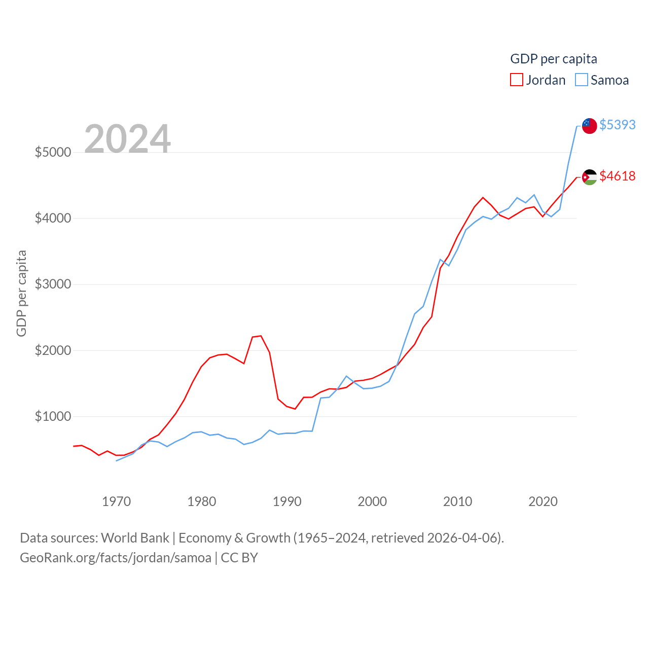 By GDP, Jordan ranks 90/197 ($53.4B) and Samoa ranks 185/197 ($1.18B). By GDP per capita, Jordan ranks 123/197 ($4,618), while Samoa ranks 117/197 ($5,393).