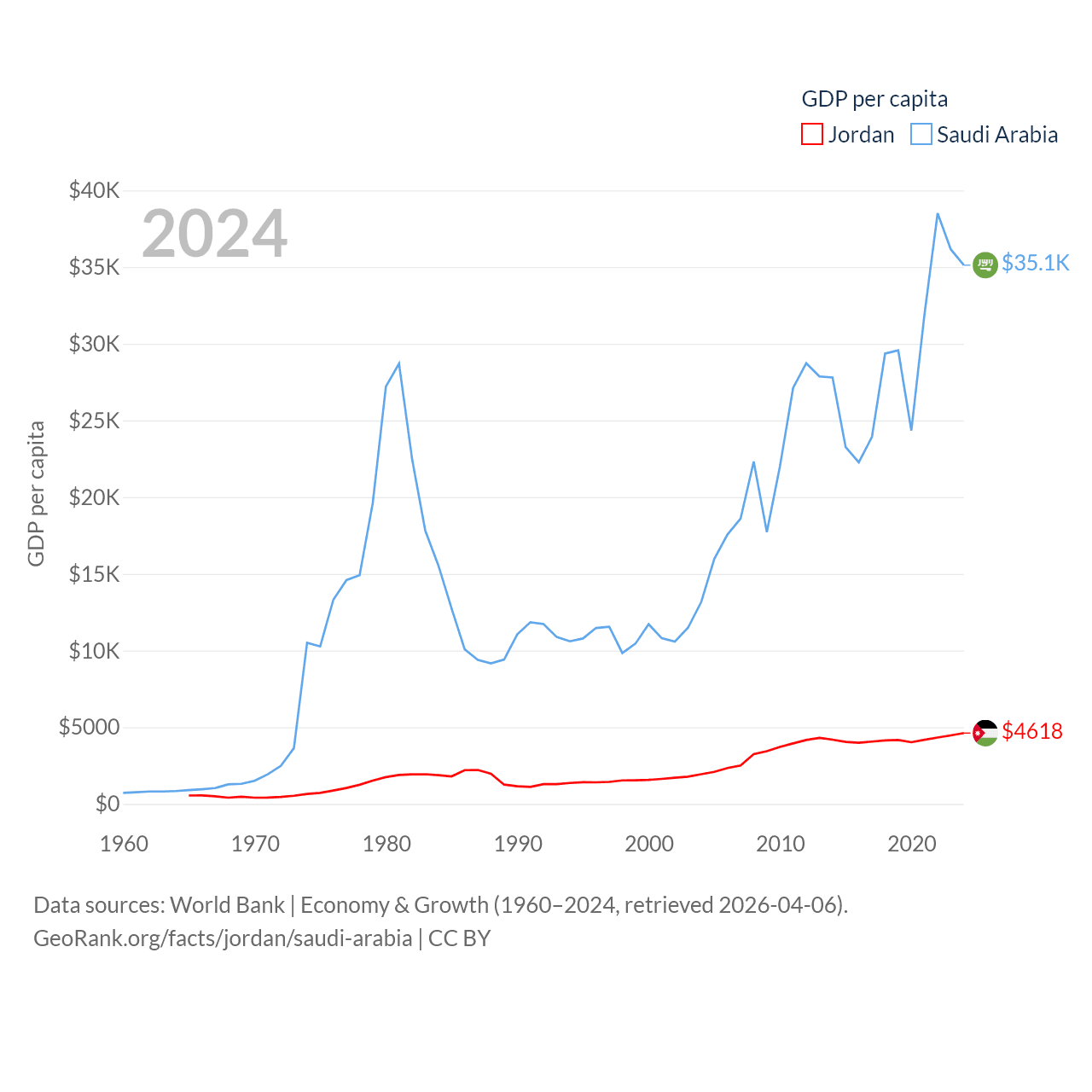 By GDP, Jordan ranks 90/197 ($53.4B) and Saudi Arabia ranks 18/197 ($1.24T). By GDP per capita, Jordan ranks 123/197 ($4,618), while Saudi Arabia ranks 33/197 ($35,122).