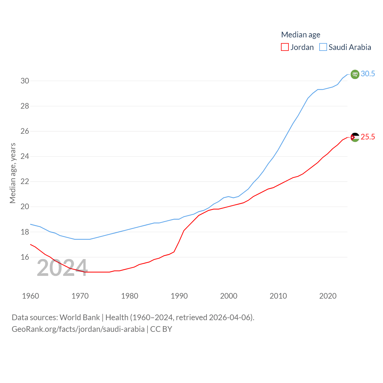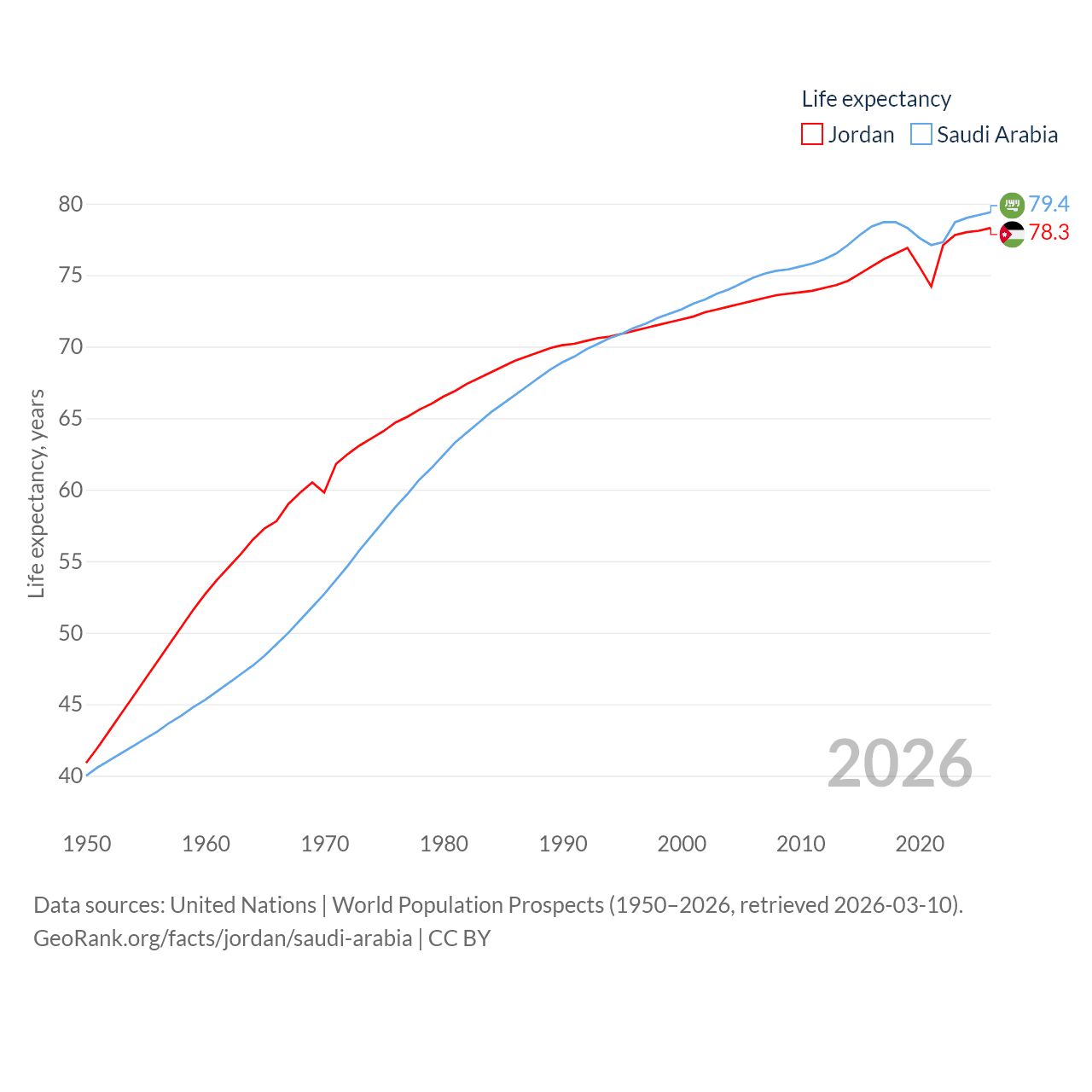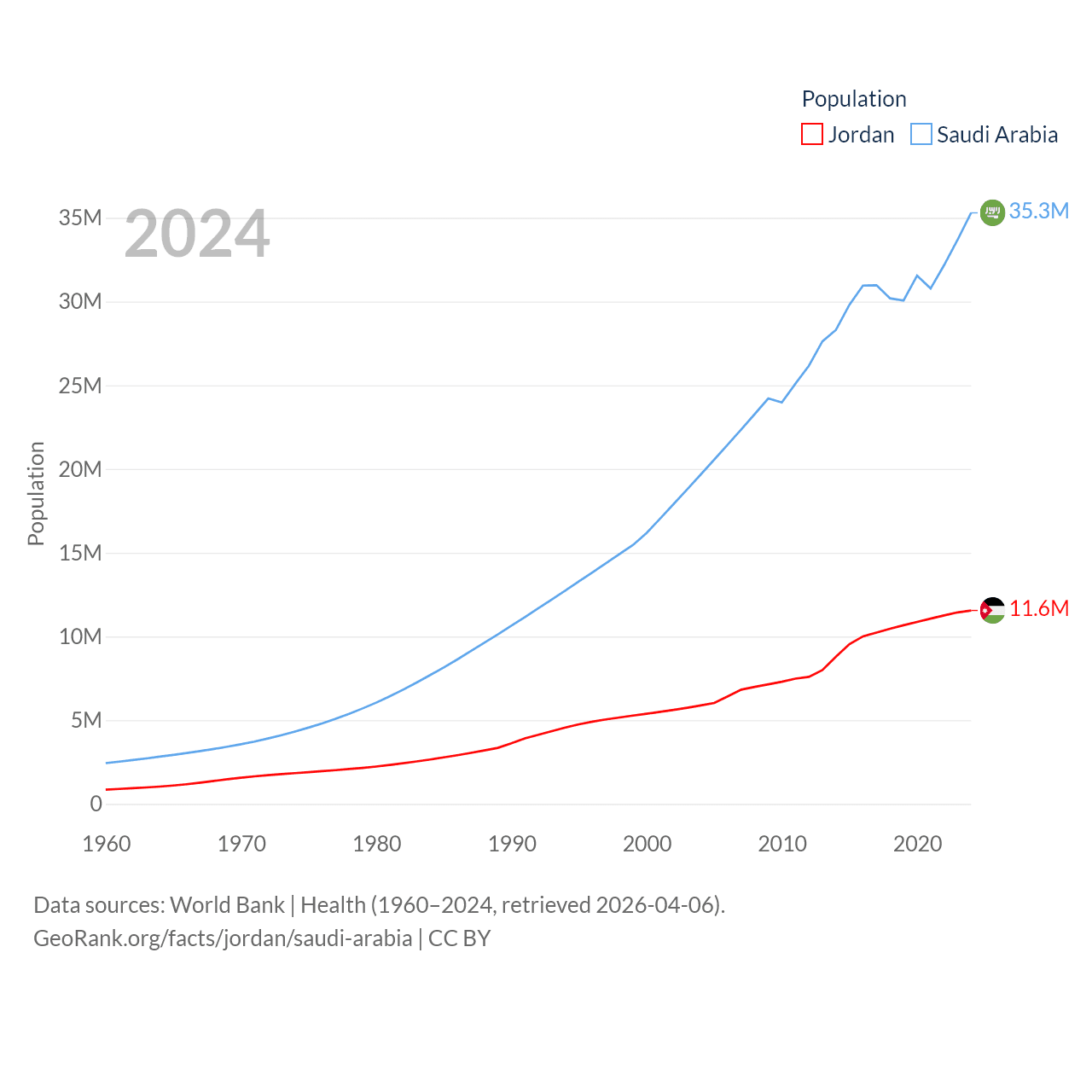 Jordan has a population of 11.6M (ranked 84/197), compared with 35.3M in Saudi Arabia (ranked 45/197). Jordan's land area is 34,284 sq mi versus 830,000 sq mi for Saudi Arabia (ranked 110th vs. 12th).