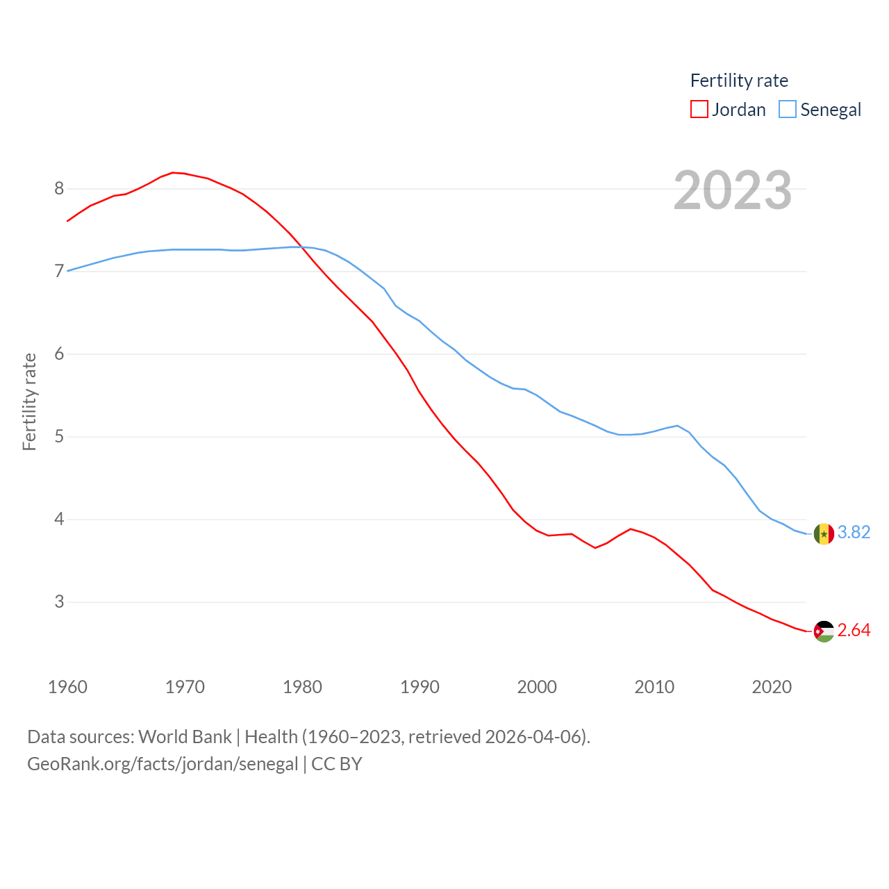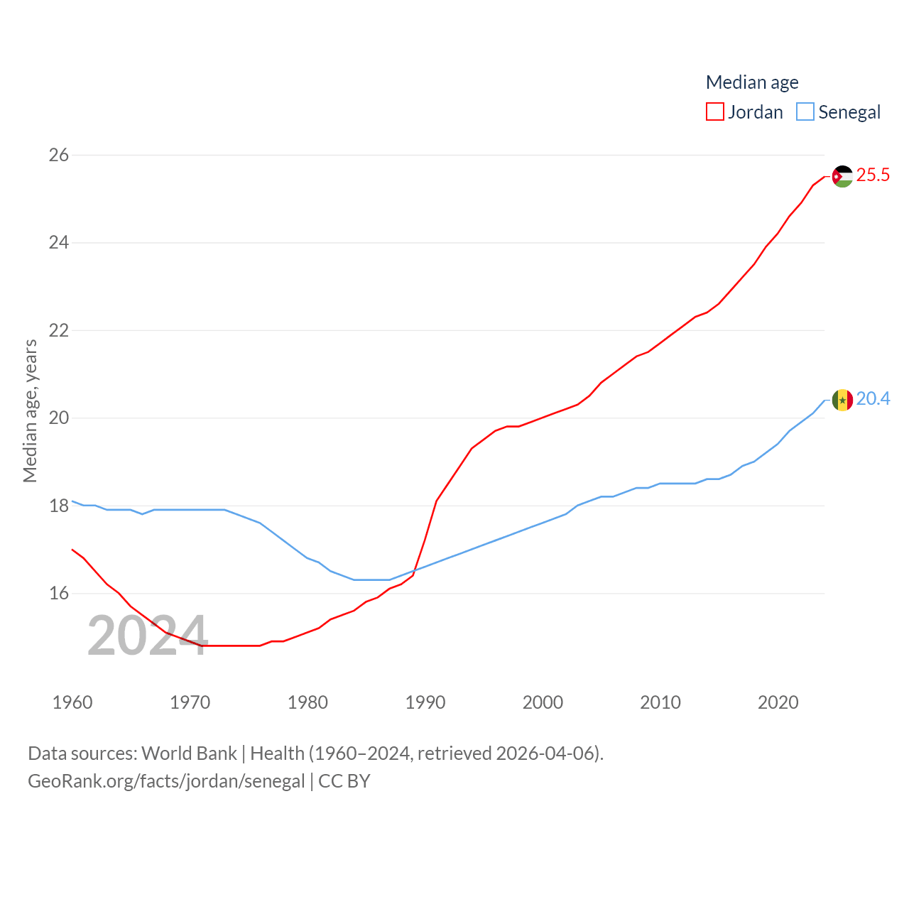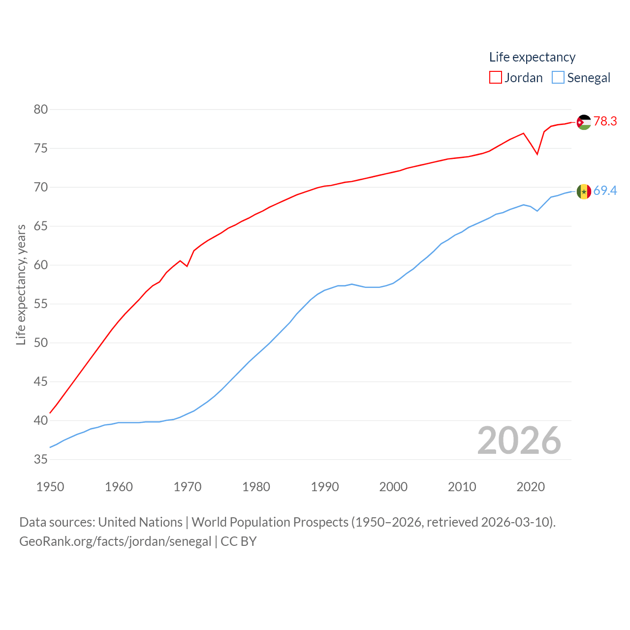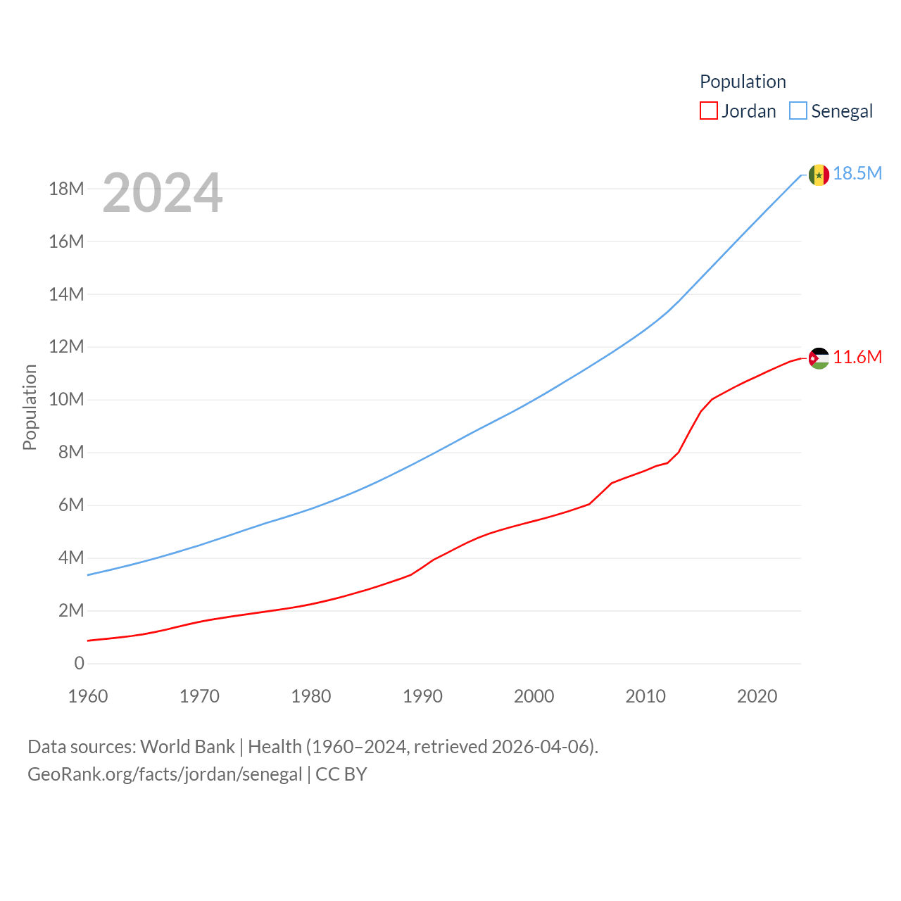 Jordan has a population of 11.6M (ranked 84/197), compared with 18.5M in Senegal (ranked 69/197). Jordan's land area is 34,284 sq mi versus 74,336 sq mi for Senegal (ranked 110th vs. 85th).