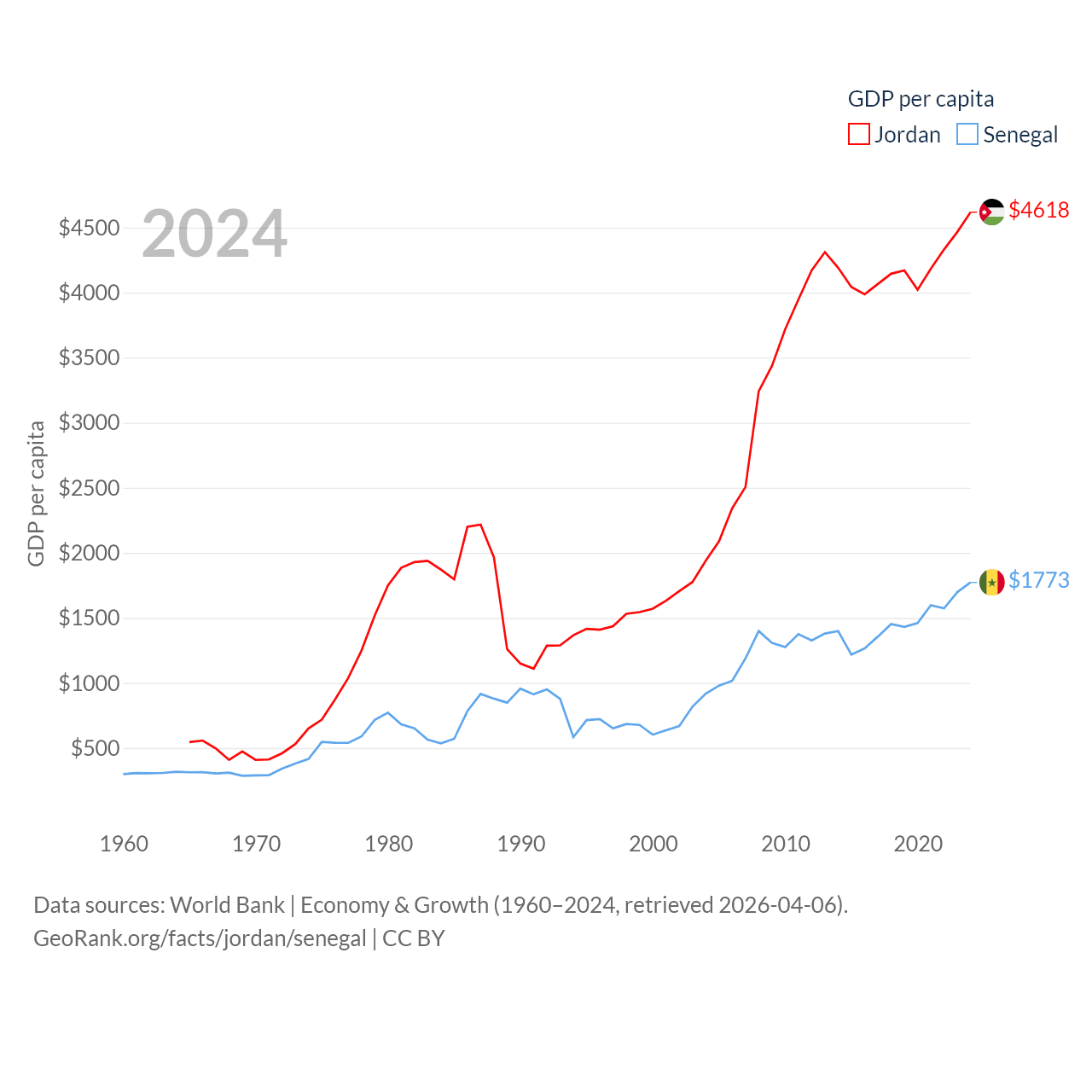 By GDP, Jordan ranks 90/197 ($53.4B) and Senegal ranks 109/197 ($32.8B). By GDP per capita, Jordan ranks 123/197 ($4,618), while Senegal ranks 159/197 ($1,773).