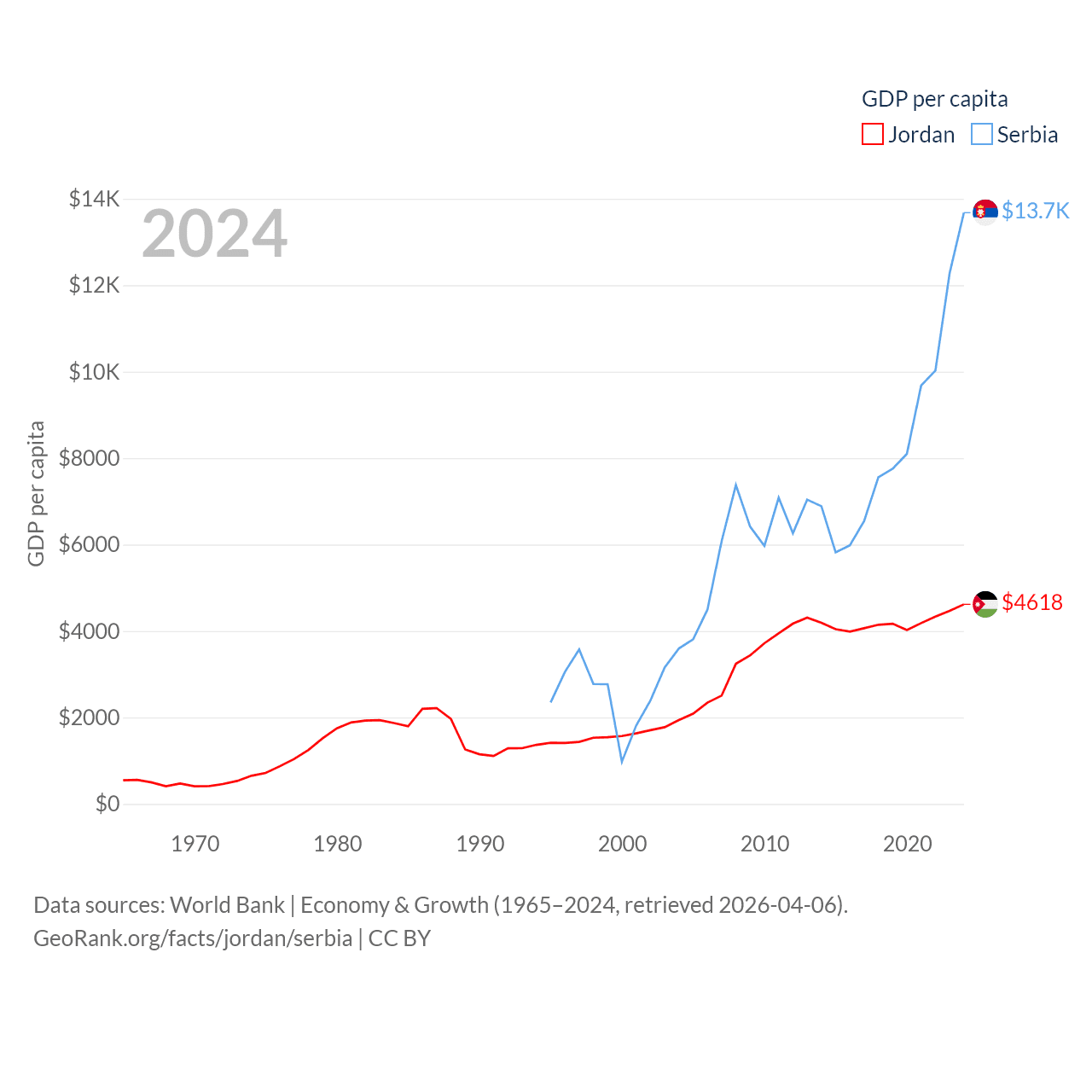 By GDP, Jordan ranks 90/197 ($53.4B) and Serbia ranks 76/197 ($90.1B). By GDP per capita, Jordan ranks 123/197 ($4,618), while Serbia ranks 73/197 ($13,679).