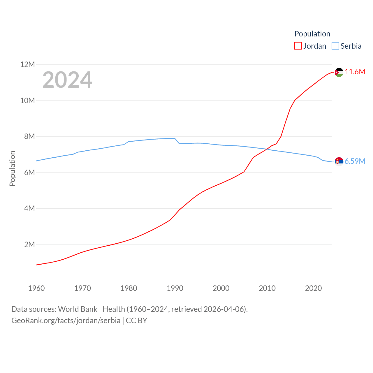 Jordan has a population of 11.6M (ranked 84/197), compared with 6.59M in Serbia (ranked 109/197). Jordan's land area is 34,284 sq mi versus 32,467 sq mi for Serbia (ranked 110th vs. 111th).
