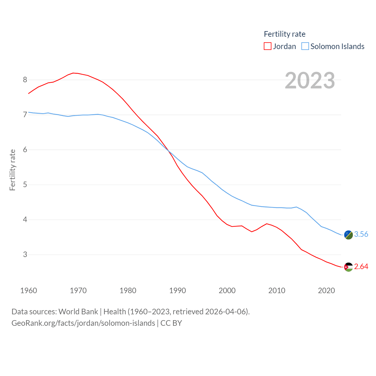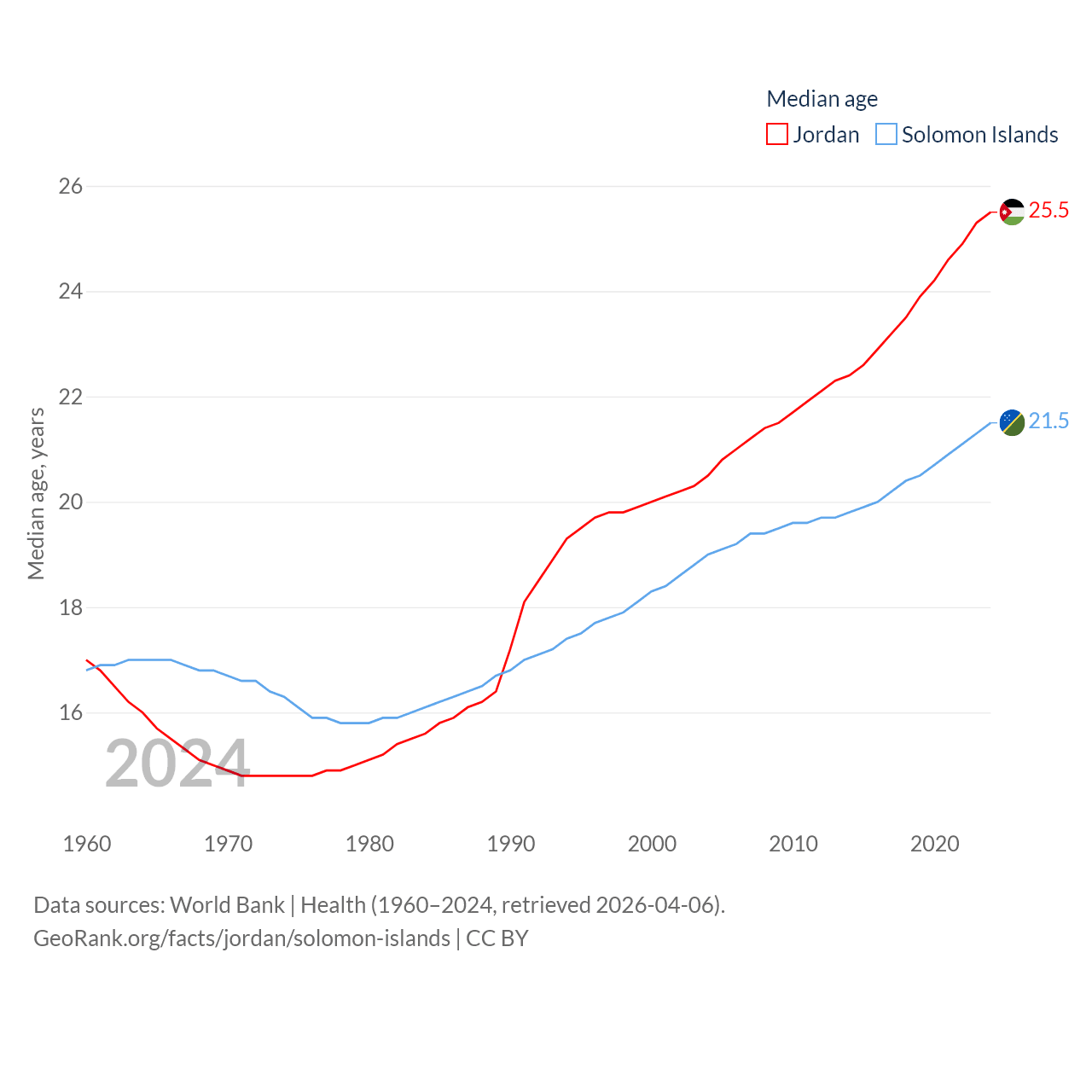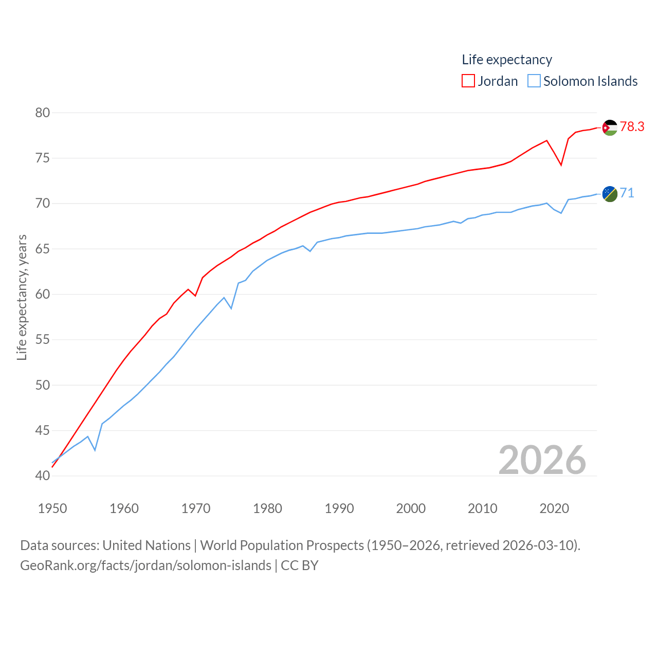 Jordan has a population of 11.6M (ranked 84/197), compared with 819K in The Solomon Islands (ranked 162/197). Jordan's land area is 34,284 sq mi versus 10,807 sq mi for The Solomon Islands (ranked 110th vs. 141st).