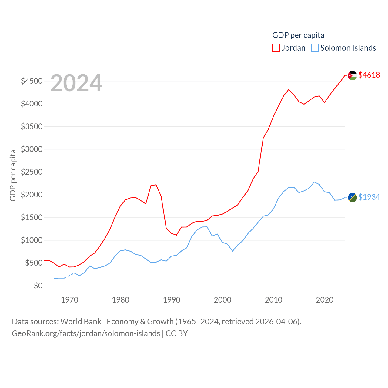 By GDP, Jordan ranks 90/197 ($53.4B) and The Solomon Islands ranks 182/197 ($1.58B). By GDP per capita, Jordan ranks 123/197 ($4,618), while The Solomon Islands ranks 157/197 ($1,934).