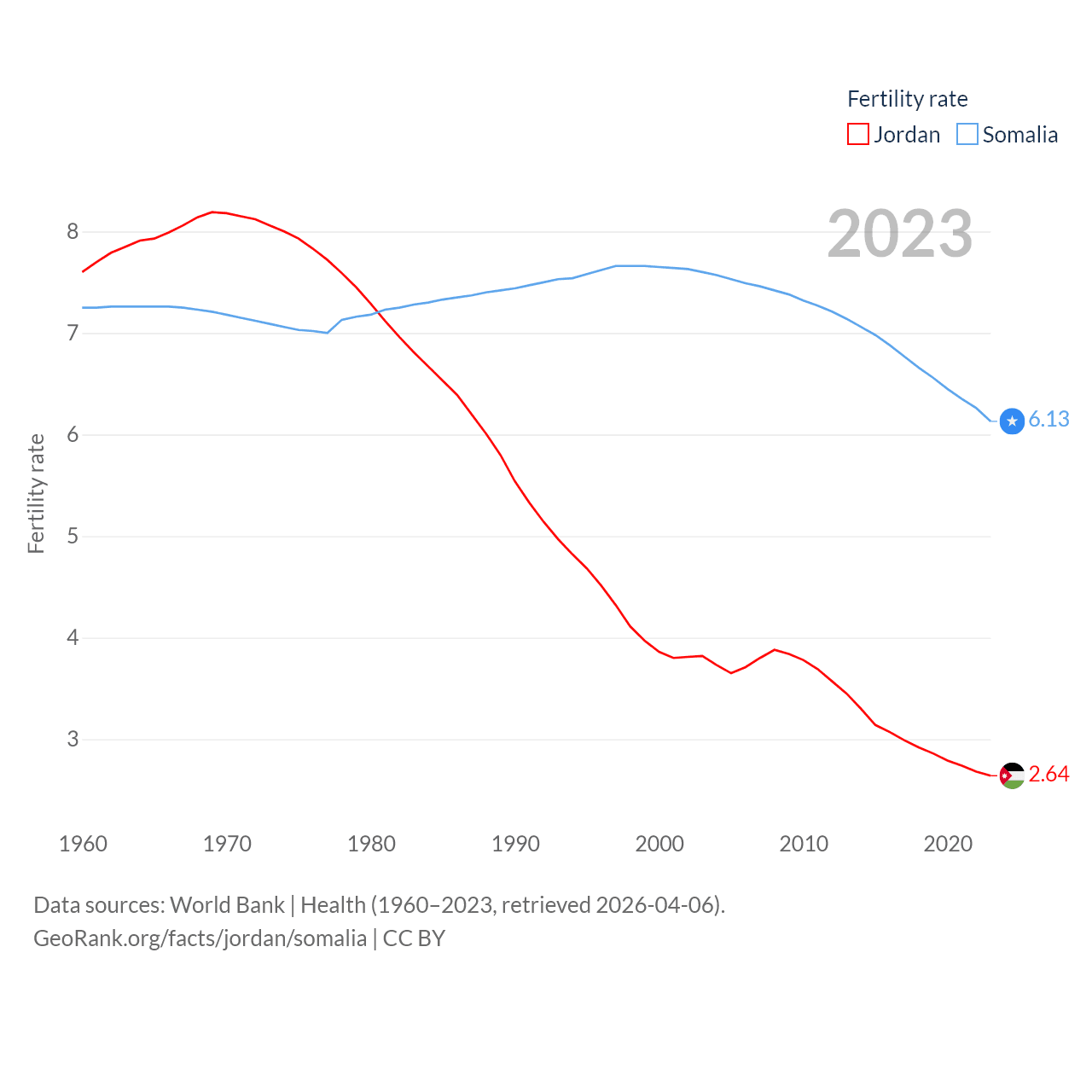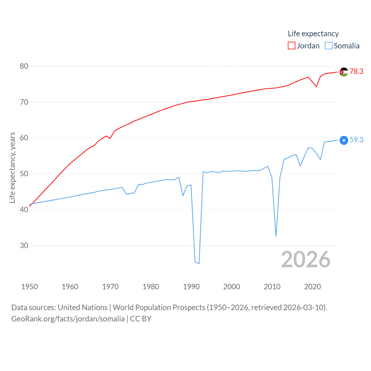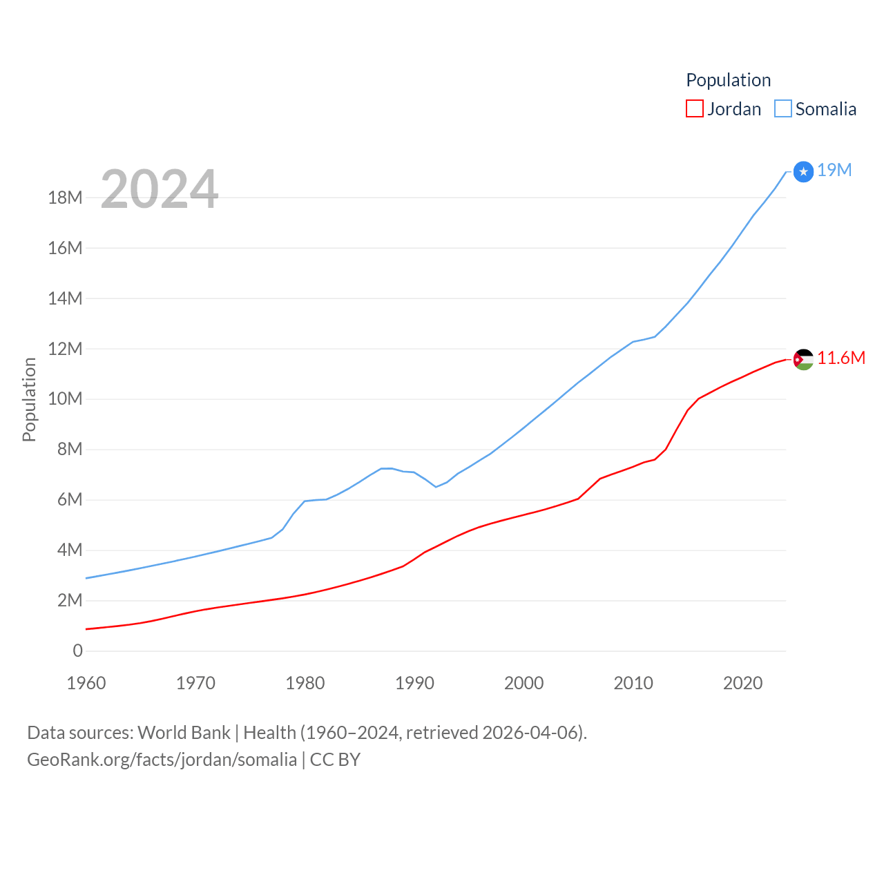 Jordan has a population of 11.6M (ranked 84/197), compared with 19M in Somalia (ranked 68/197). Jordan's land area is 34,284 sq mi versus 242,217 sq mi for Somalia (ranked 110th vs. 42nd).