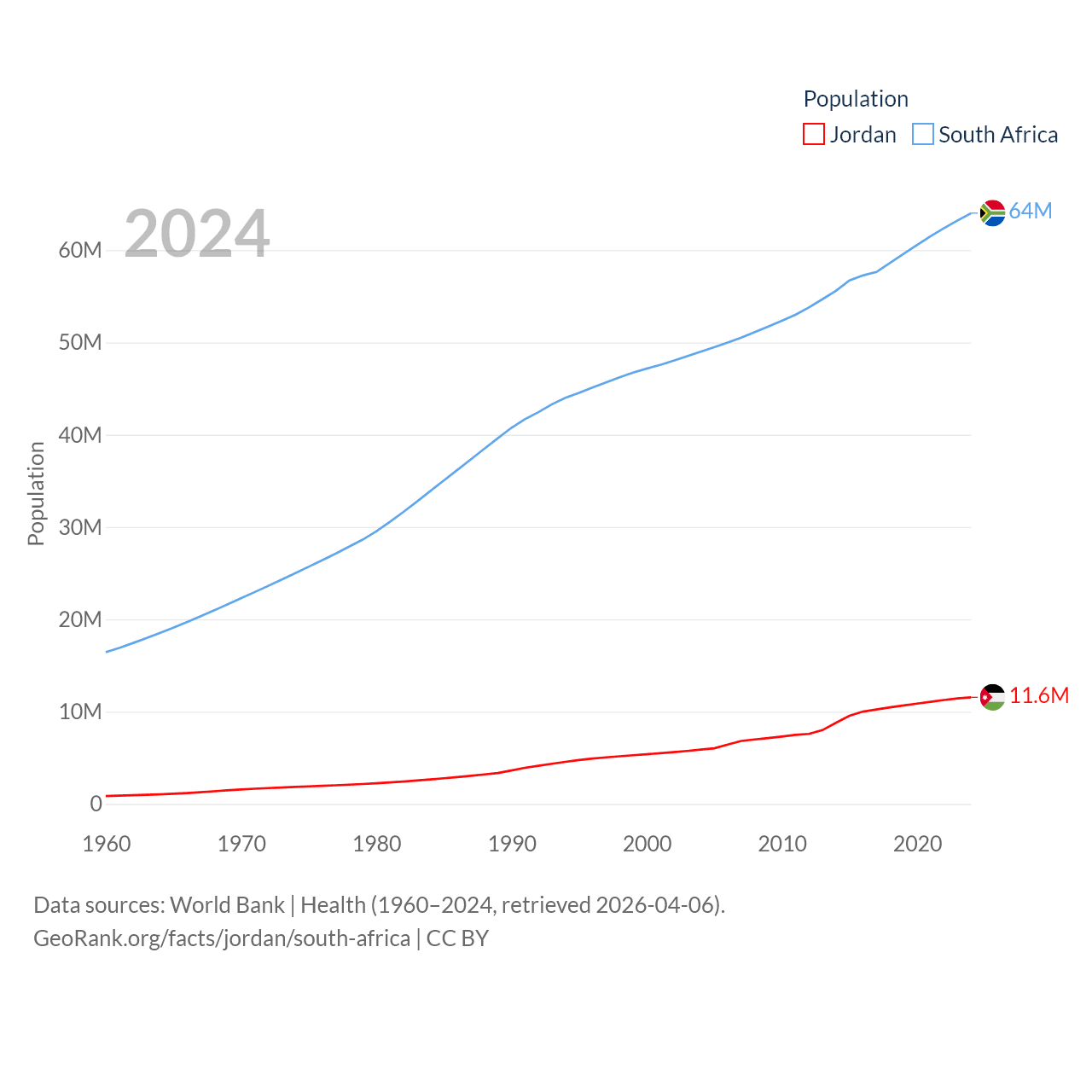 Jordan has a population of 11.6M (ranked 84/197), compared with 64M in South Africa (ranked 24/197). Jordan's land area is 34,284 sq mi versus 468,377 sq mi for South Africa (ranked 110th vs. 24th).