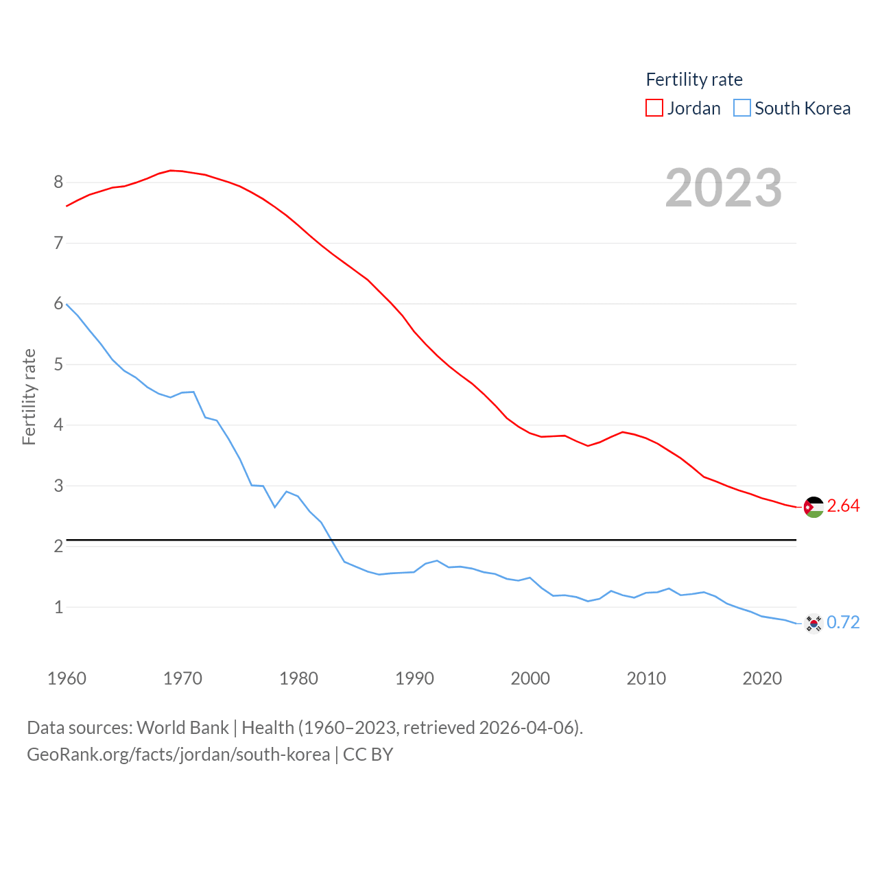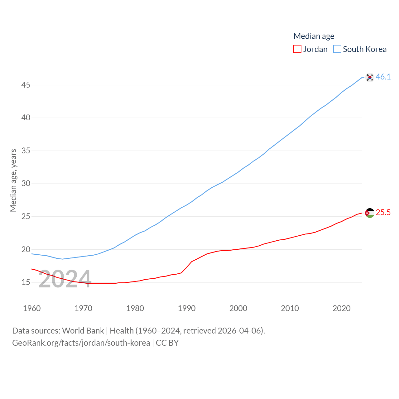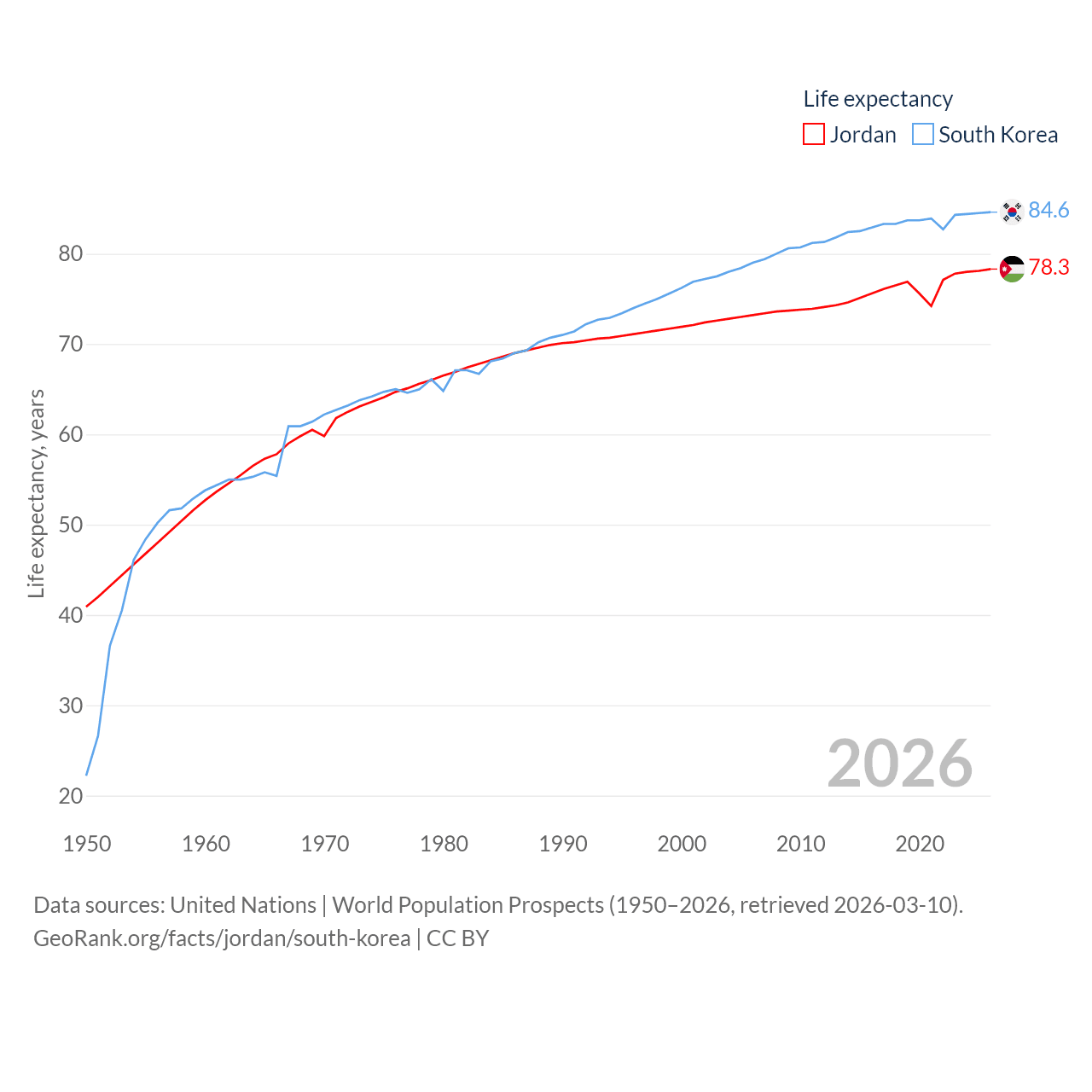 Jordan has a population of 11.6M (ranked 84/197), compared with 51.8M in South Korea (ranked 29/197). Jordan's land area is 34,284 sq mi versus 37,684 sq mi for South Korea (ranked 110th vs. 105th).