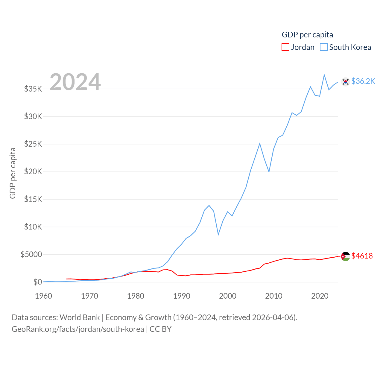 By GDP, Jordan ranks 90/197 ($53.4B) and South Korea ranks 12/197 ($1.88T). By GDP per capita, Jordan ranks 123/197 ($4,618), while South Korea ranks 31/197 ($36,239).