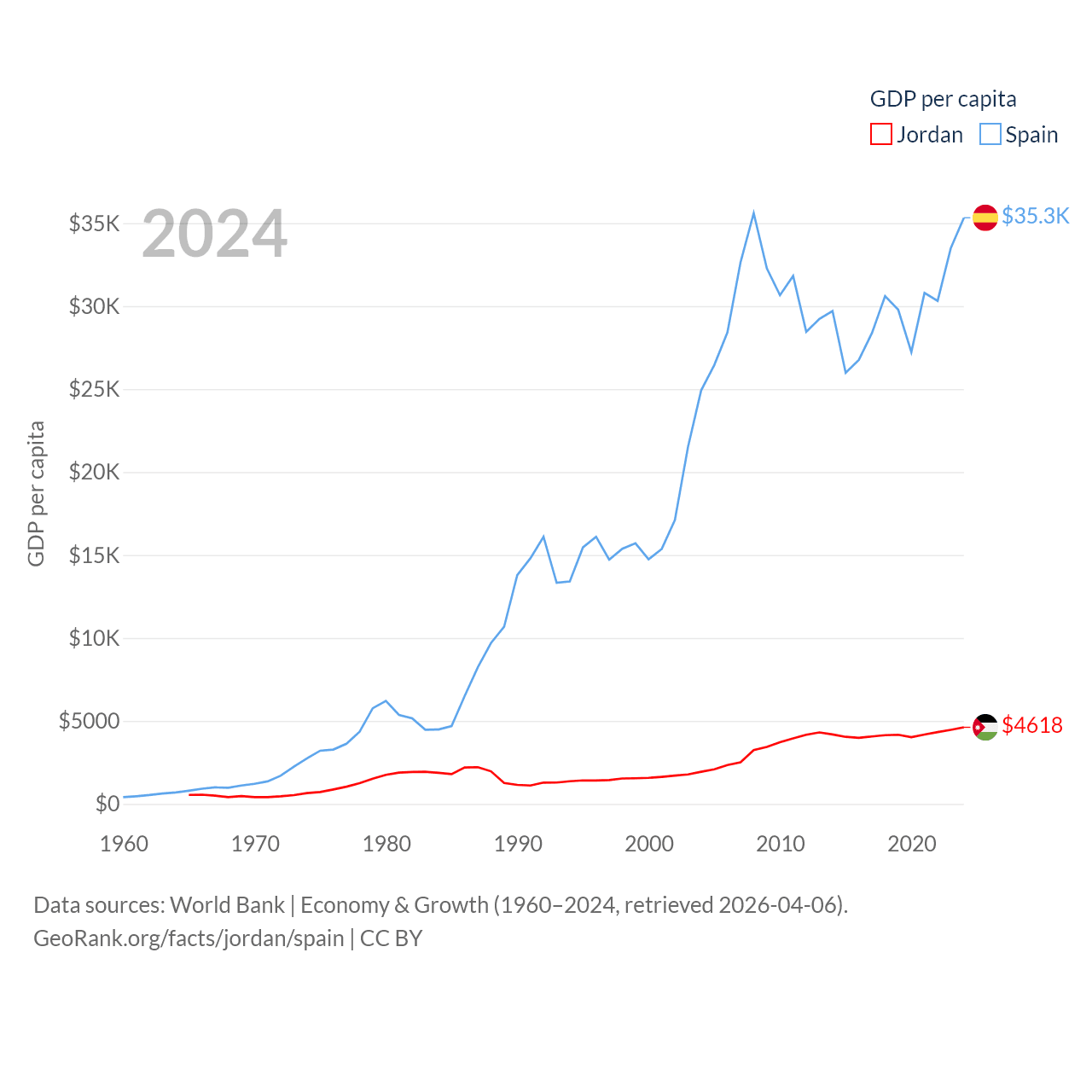 By GDP, Jordan ranks 90/197 ($53.4B) and Spain ranks 15/197 ($1.73T). By GDP per capita, Jordan ranks 123/197 ($4,618), while Spain ranks 32/197 ($35,327).